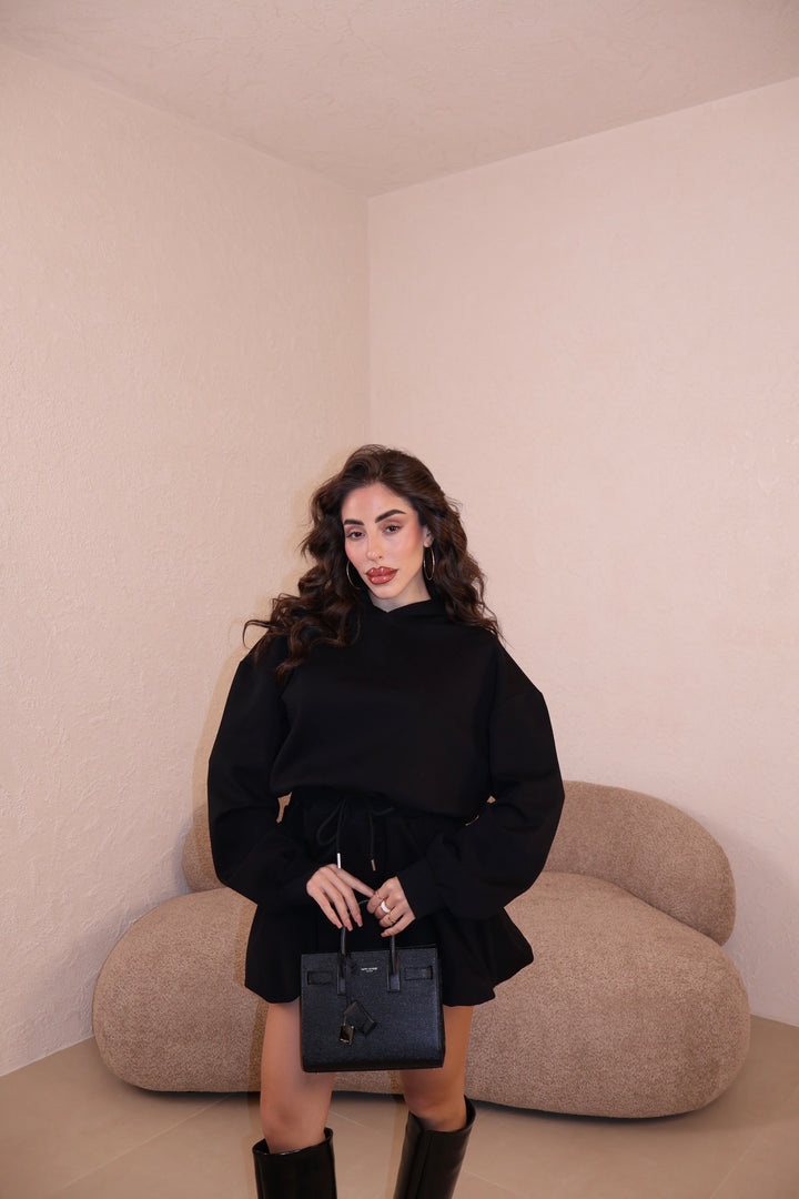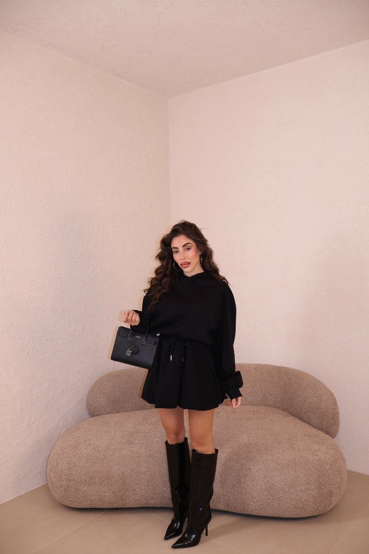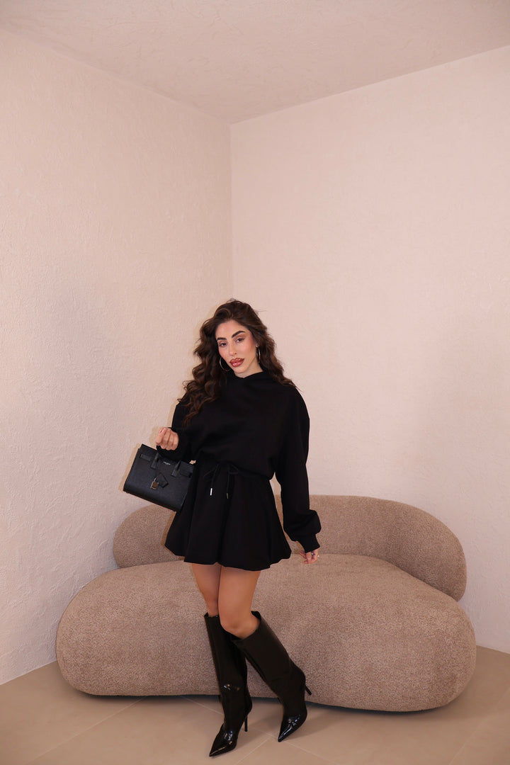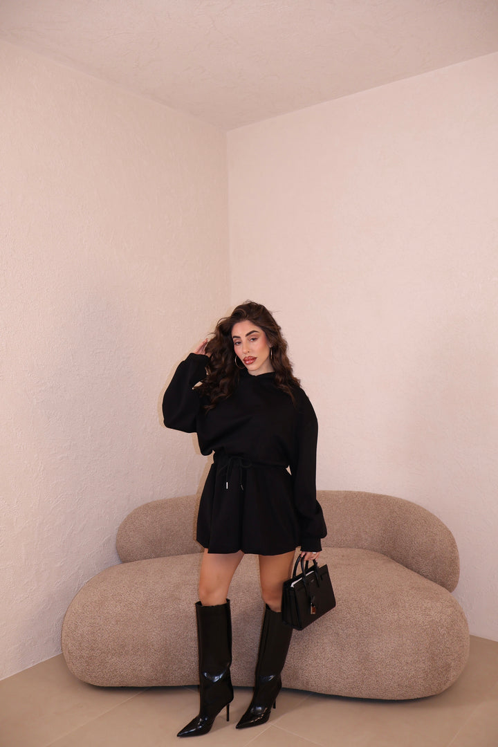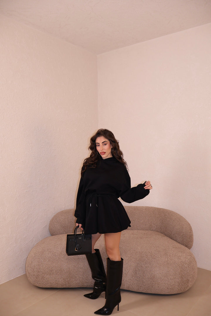 Abito in felpa con gonna a palloncino regolabile in vita e cappuccio. Taglia unica.