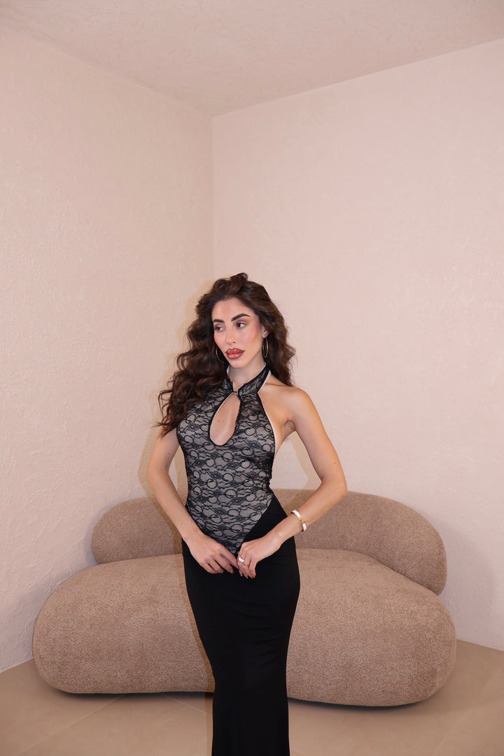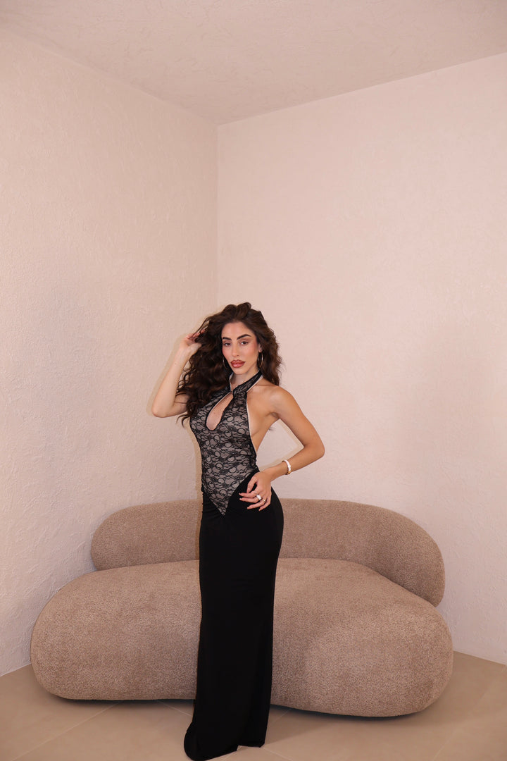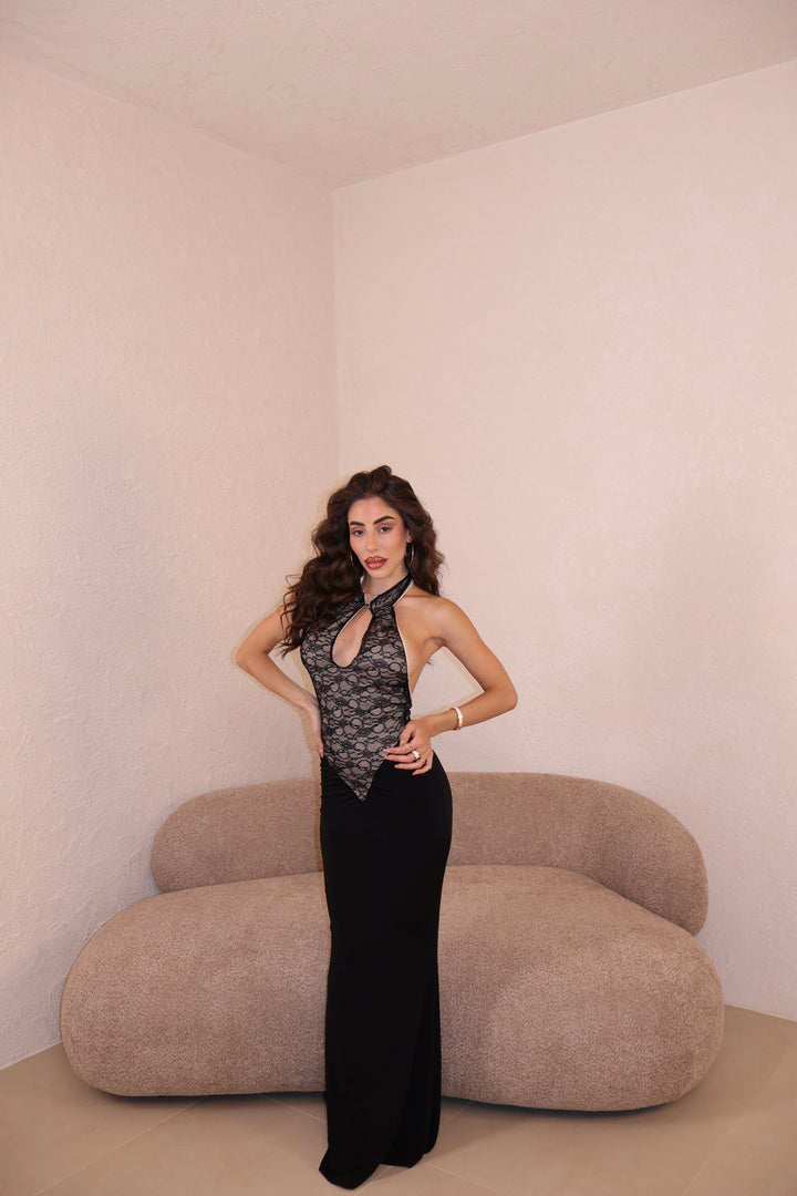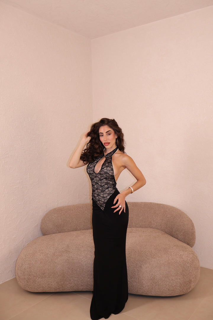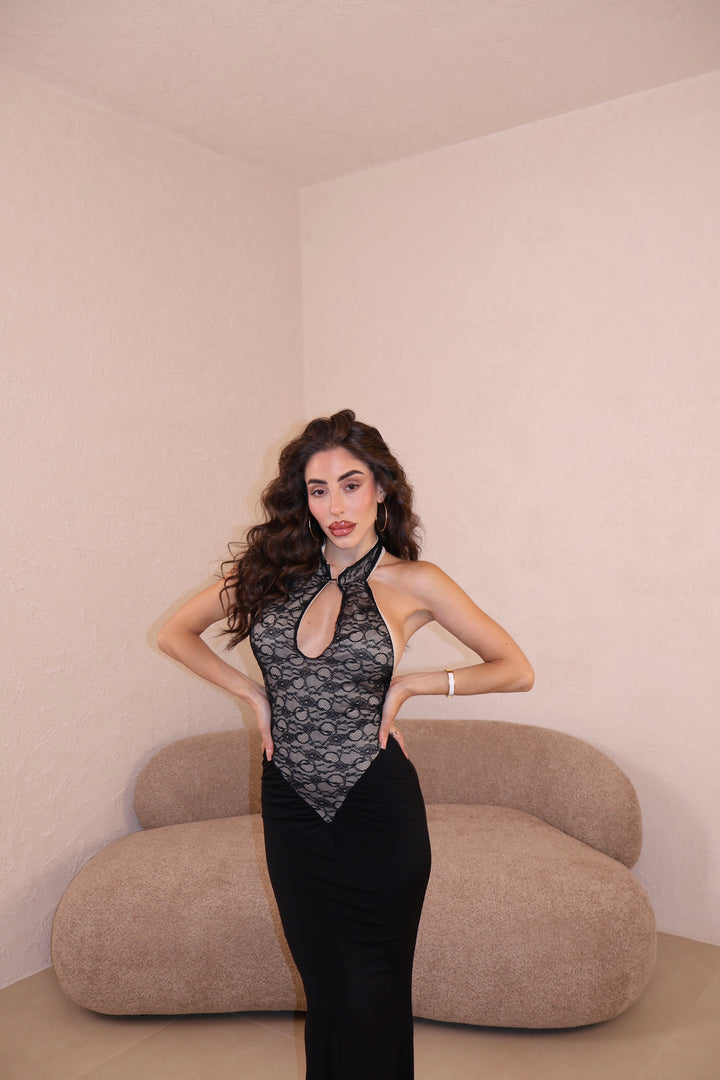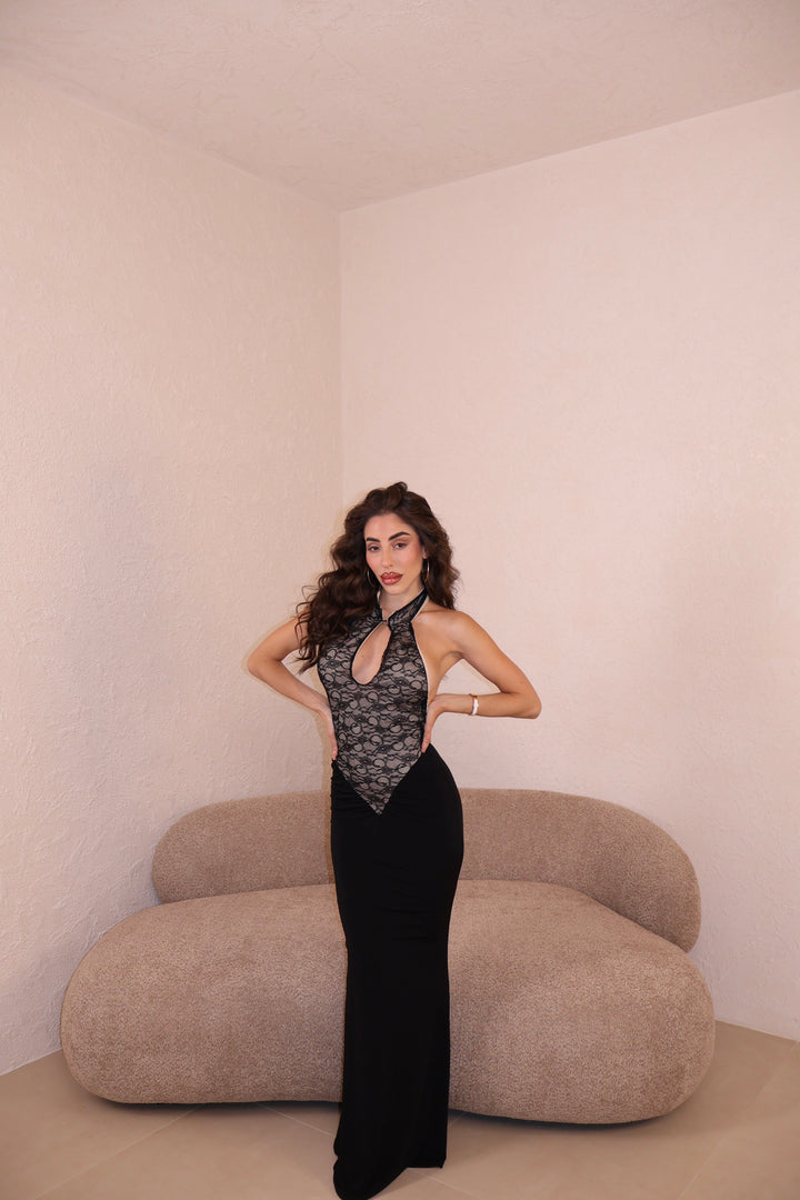 Abito lungo combinato in pizzo e licra. Apertura frontale. Taglia unica.