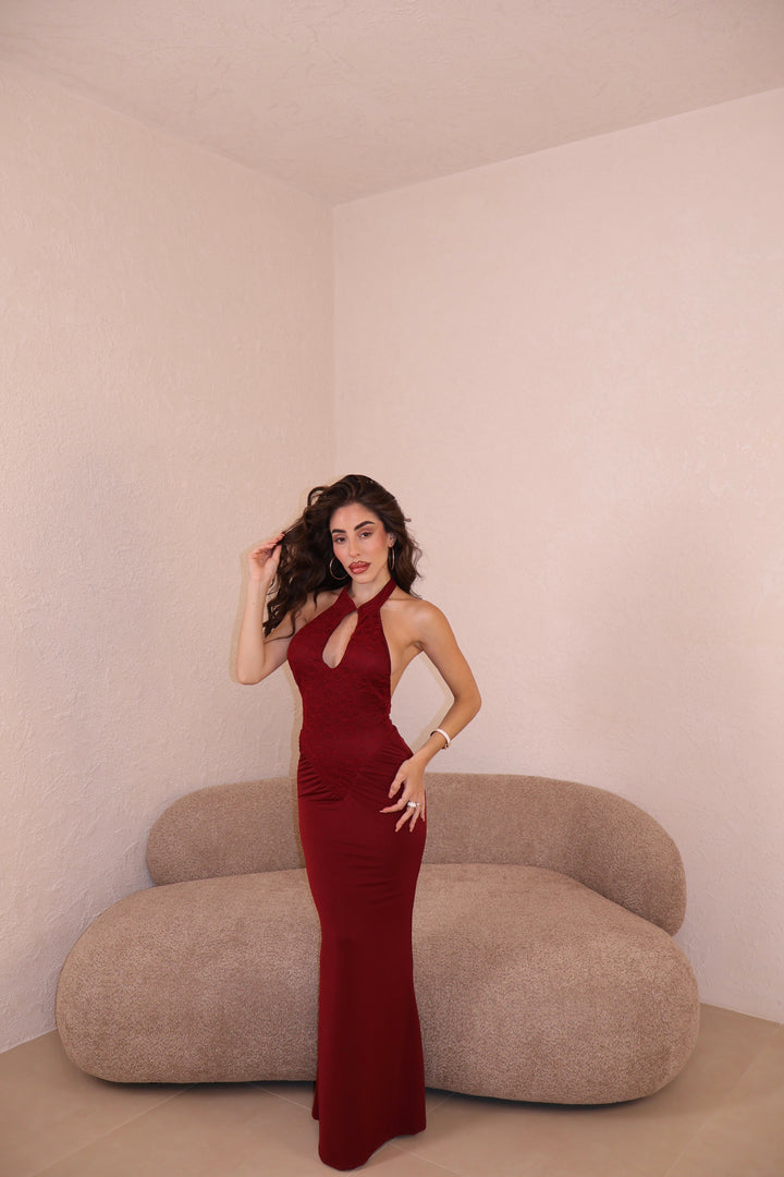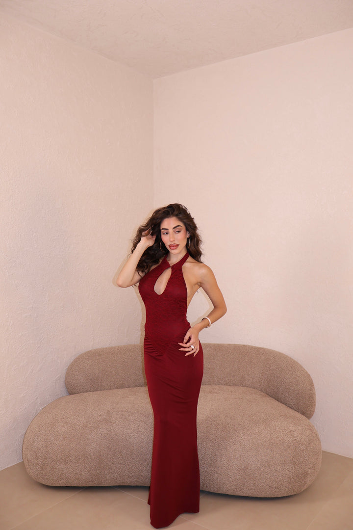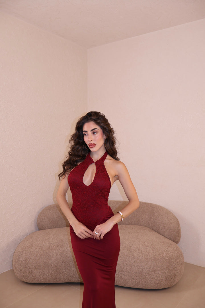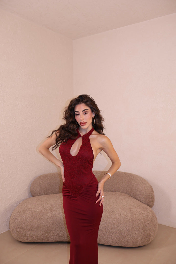 Abito lungo combinato in pizzo e licra. Apertura frontale. Taglia unica.