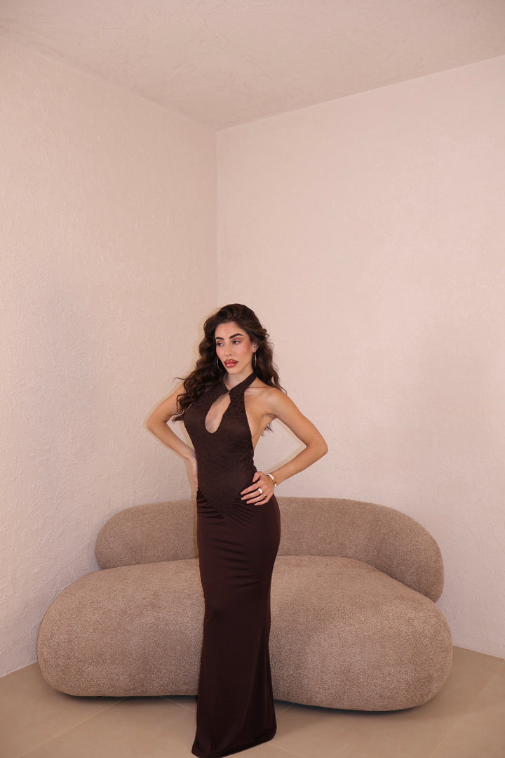 Abito lungo combinato in pizzo e licra. Apertura frontale. Taglia unica.