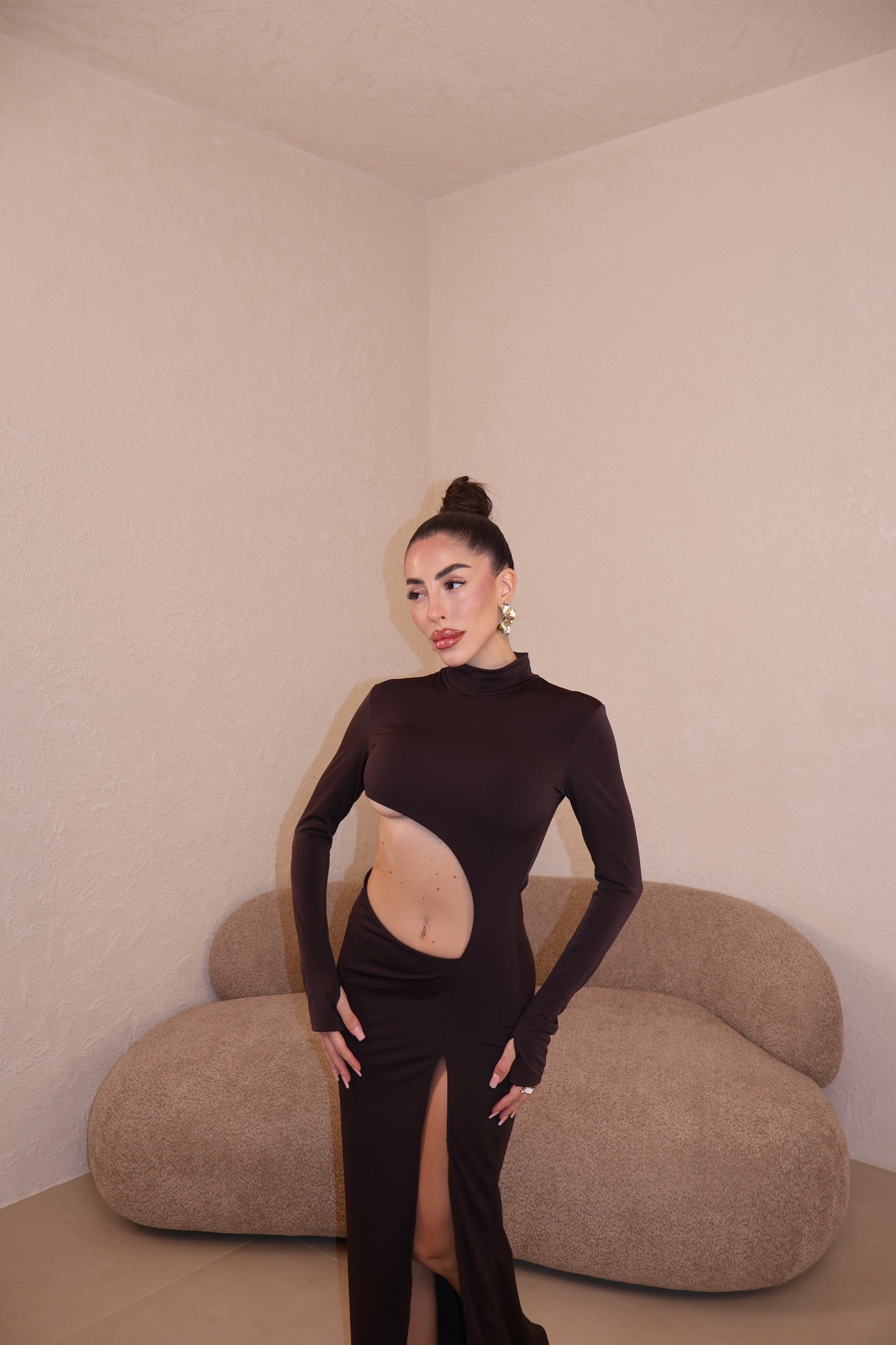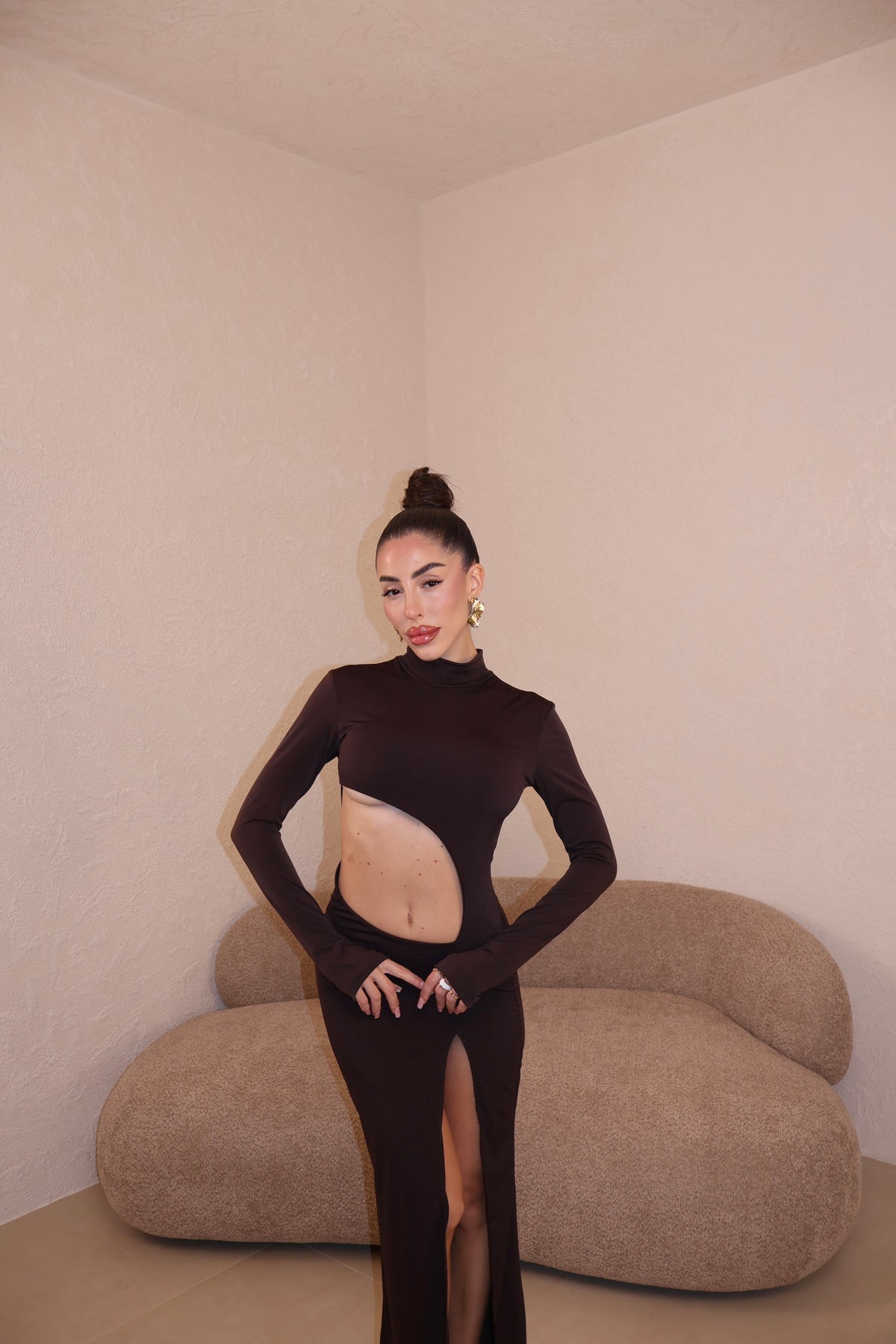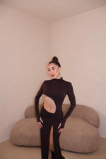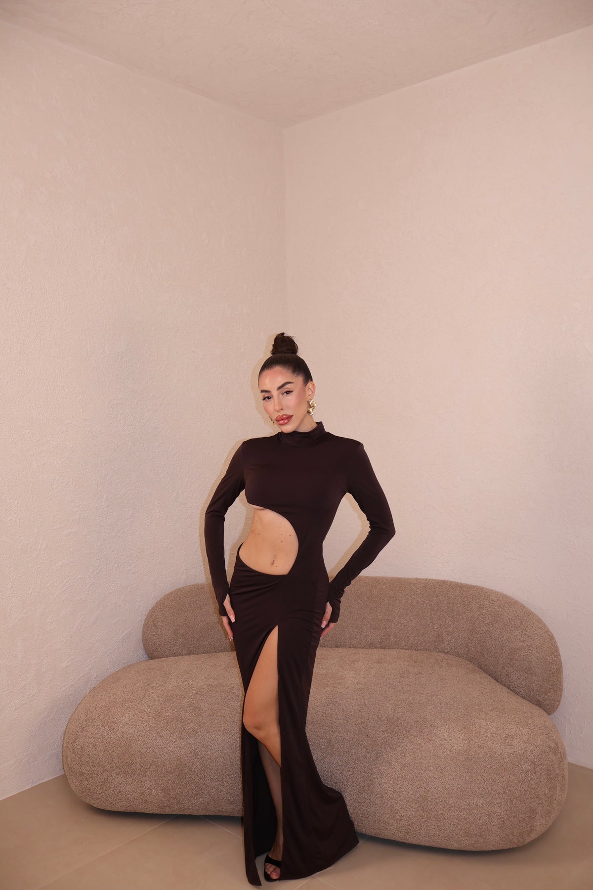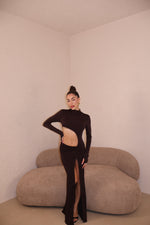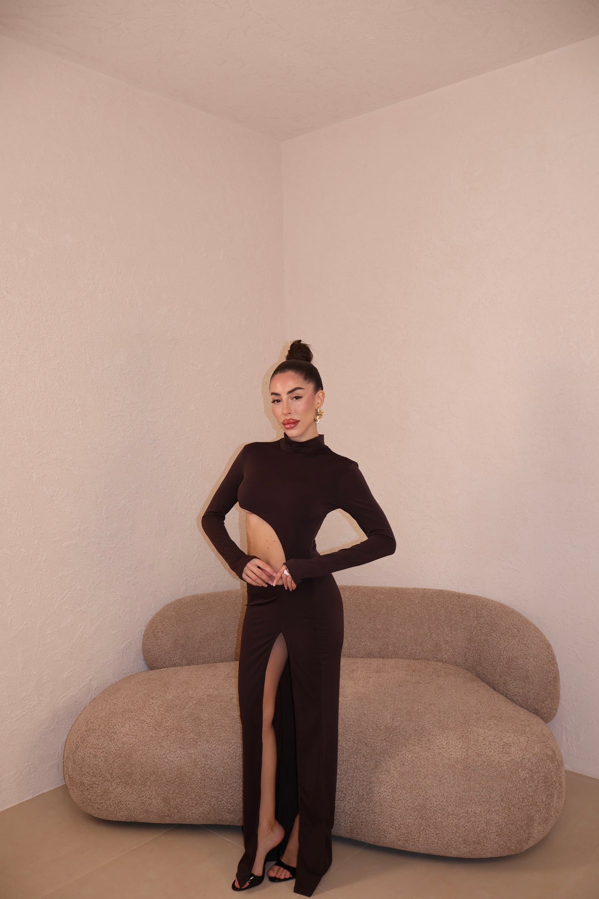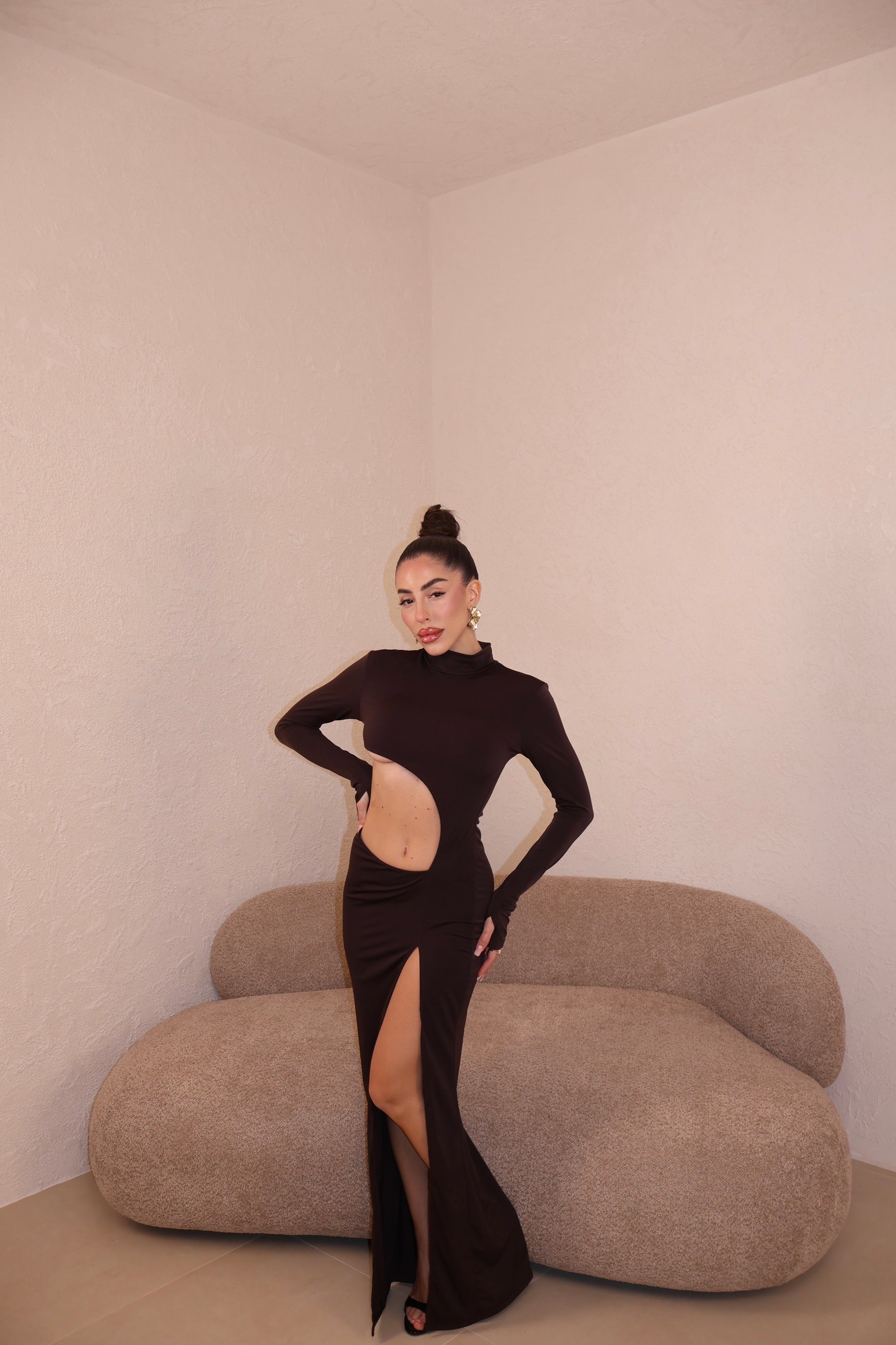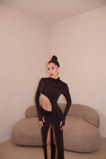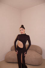 Abito lungo in licra con spacco laterale ed apertura frontale. Taglia unica.
