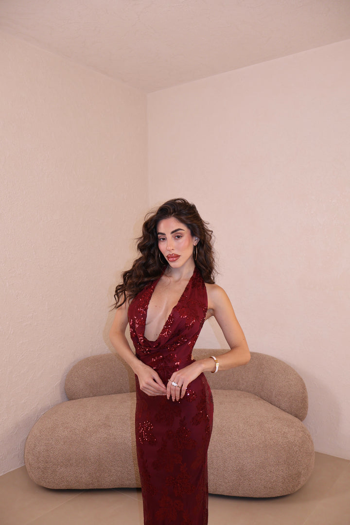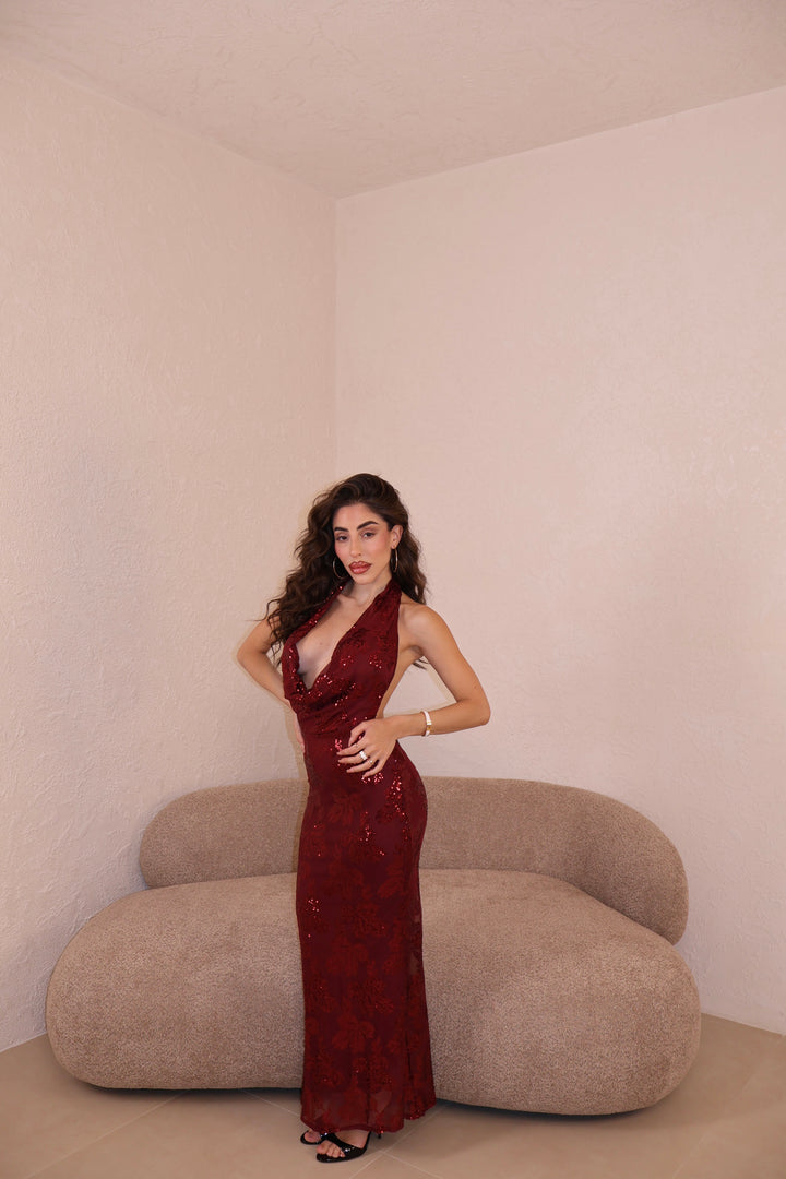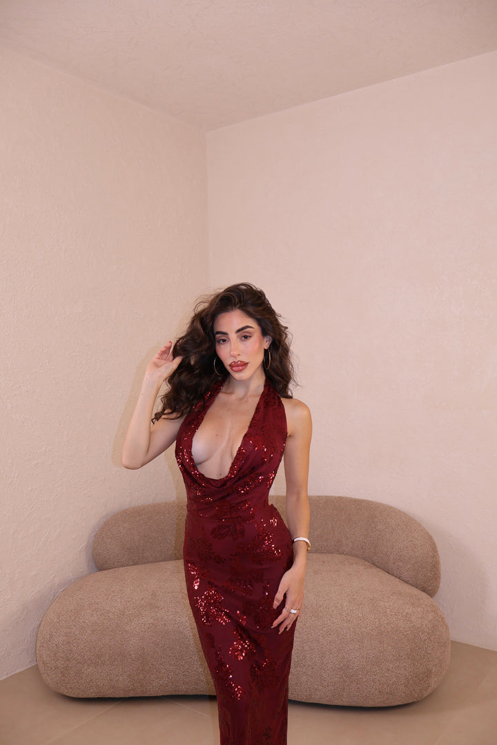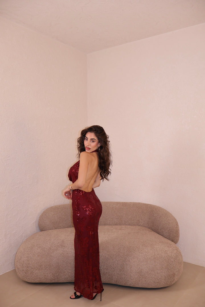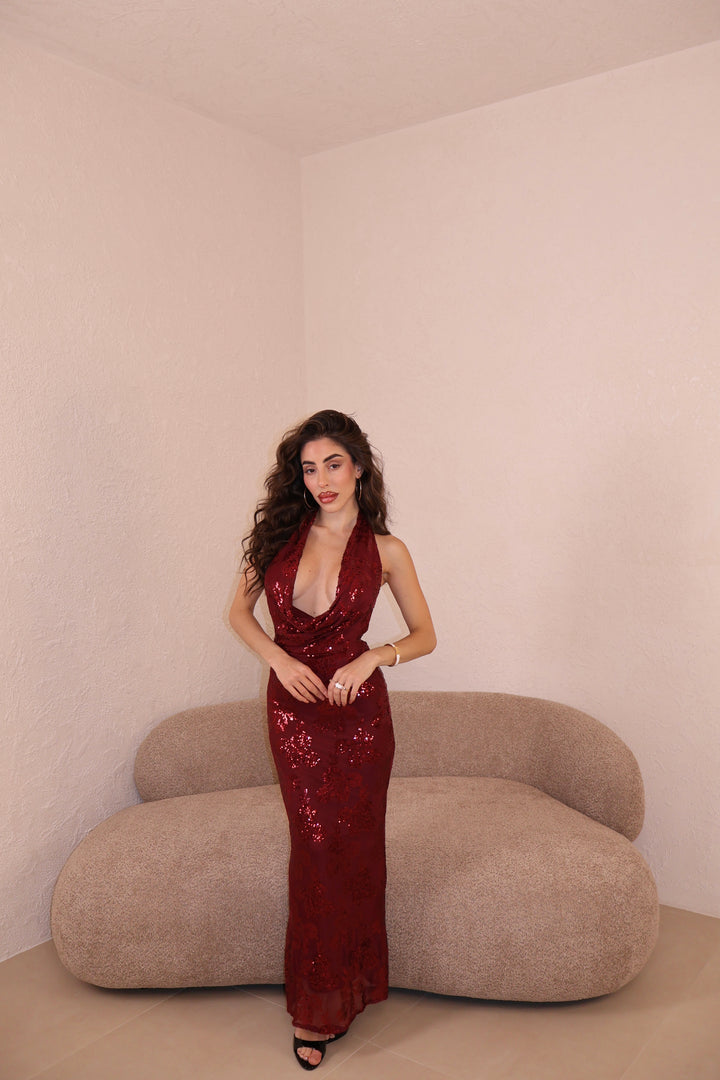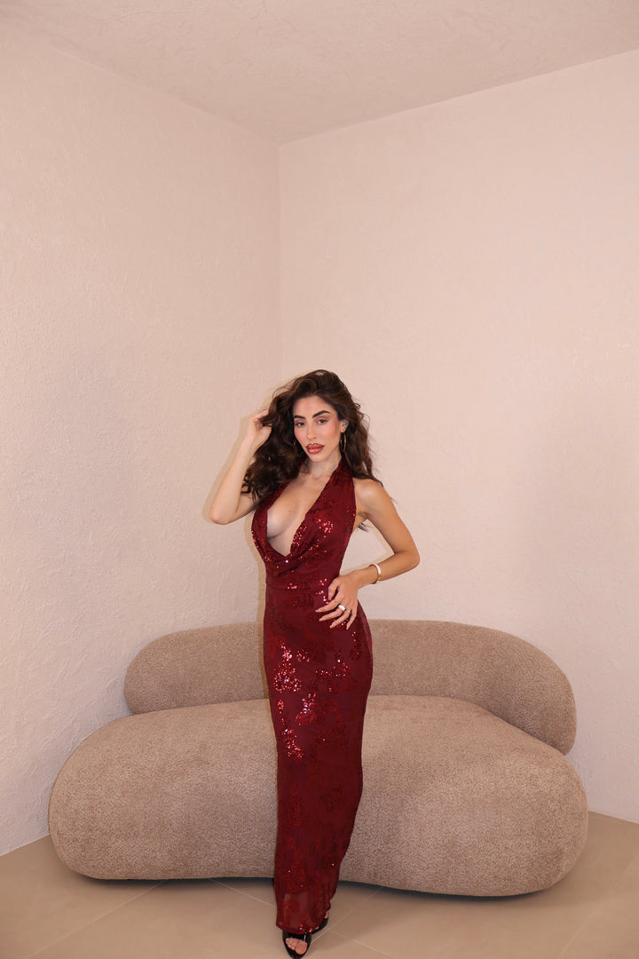 Abito lungo con scollo morbido e dettagli in paillettes. Taglia unica.