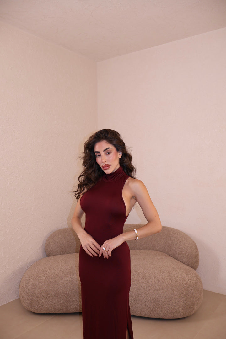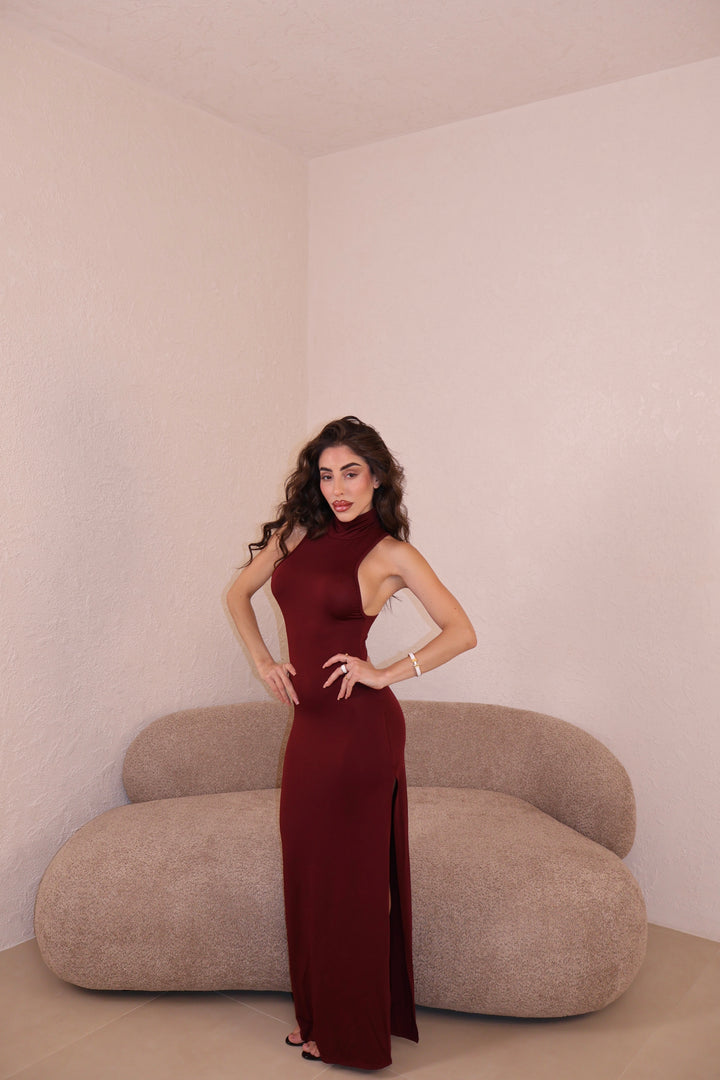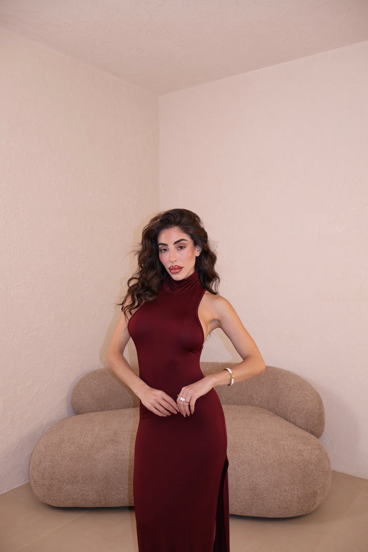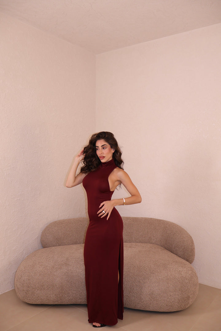 Abito lungo in licra con collo alto e spacco laterale. Taglia unica.