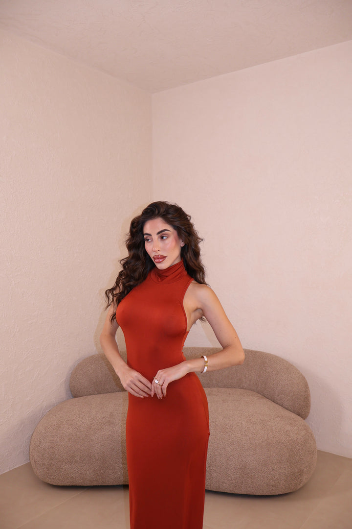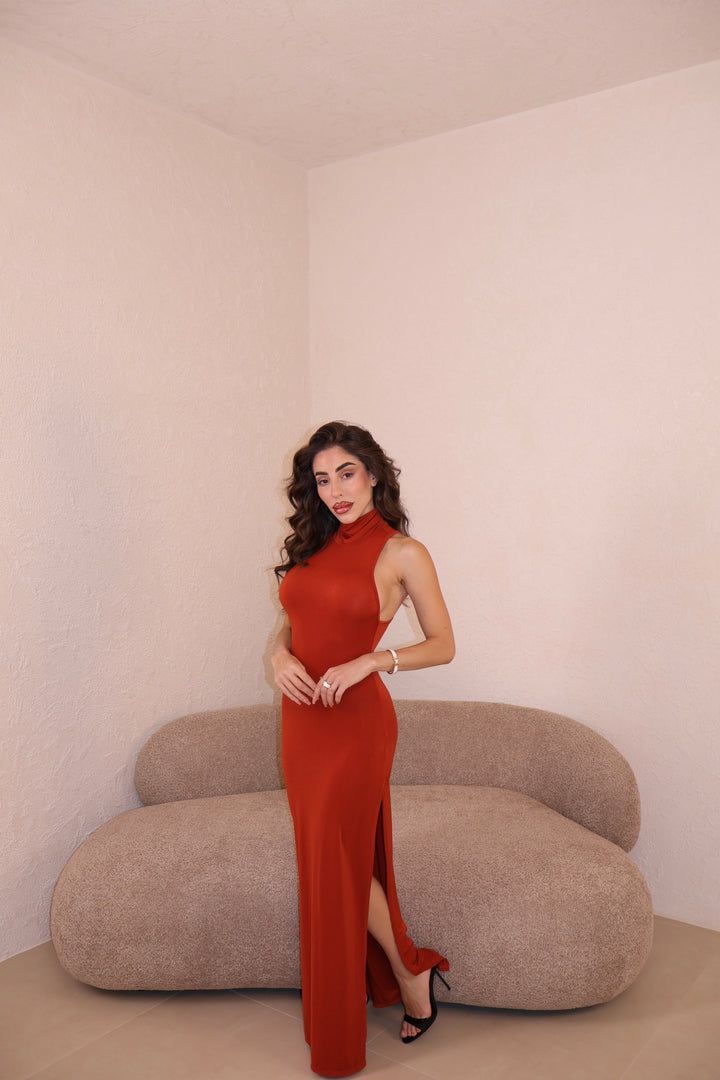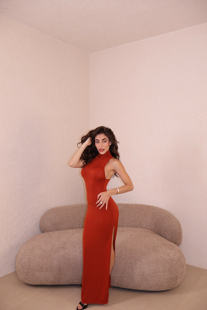 Abito lungo in licra con collo alto e spacco laterale. Taglia unica.