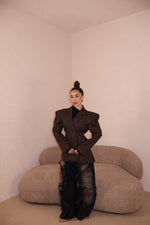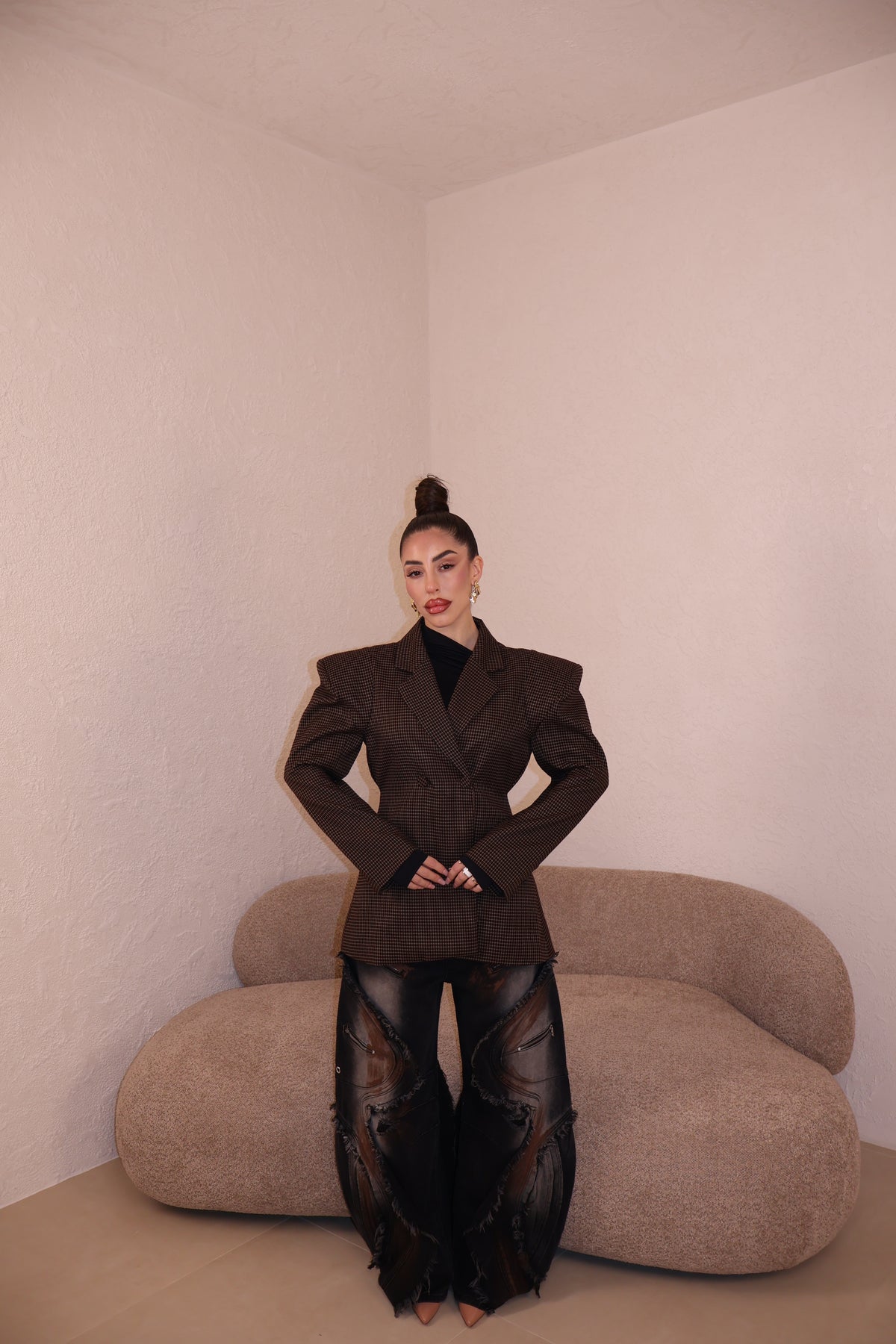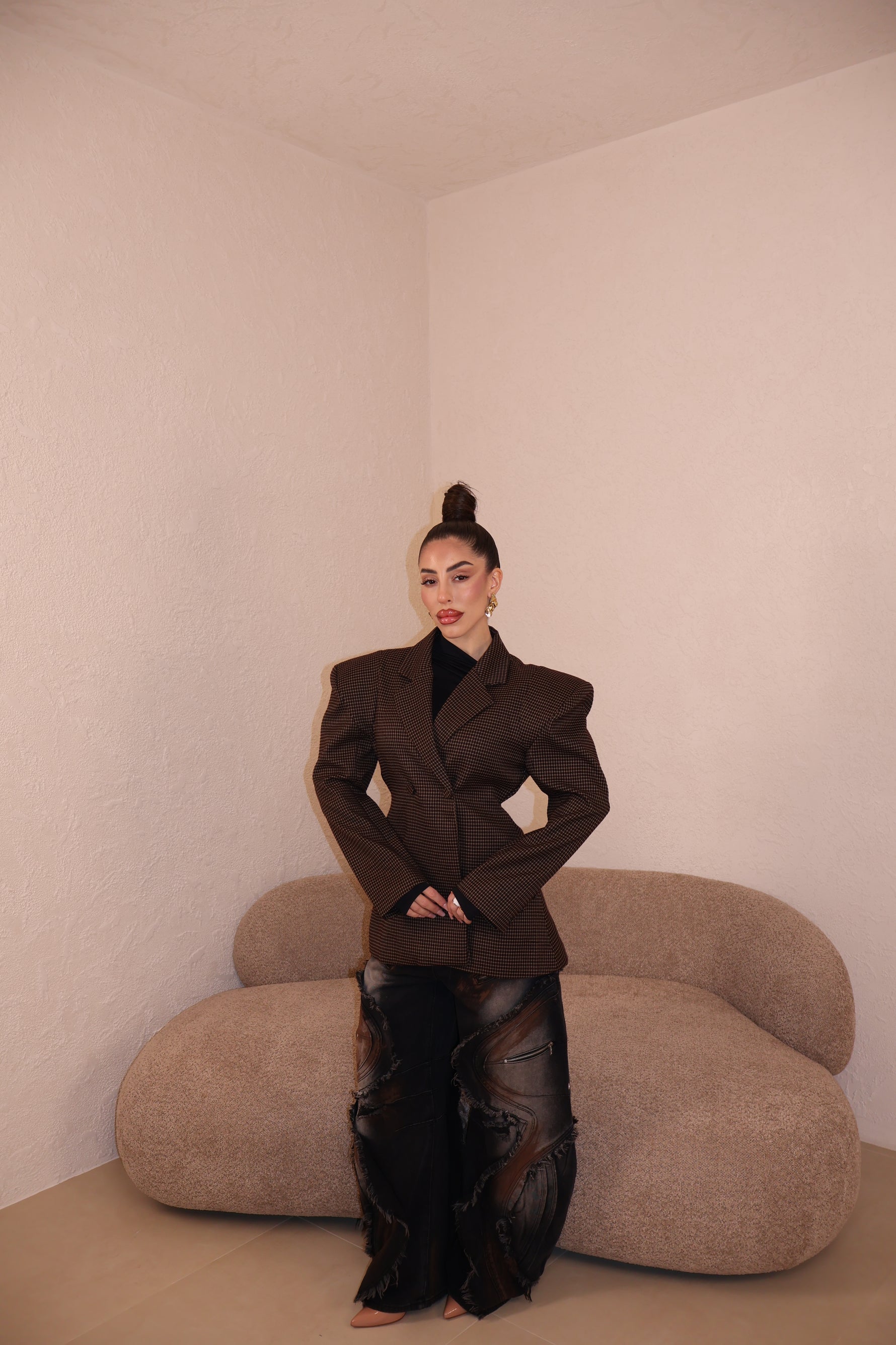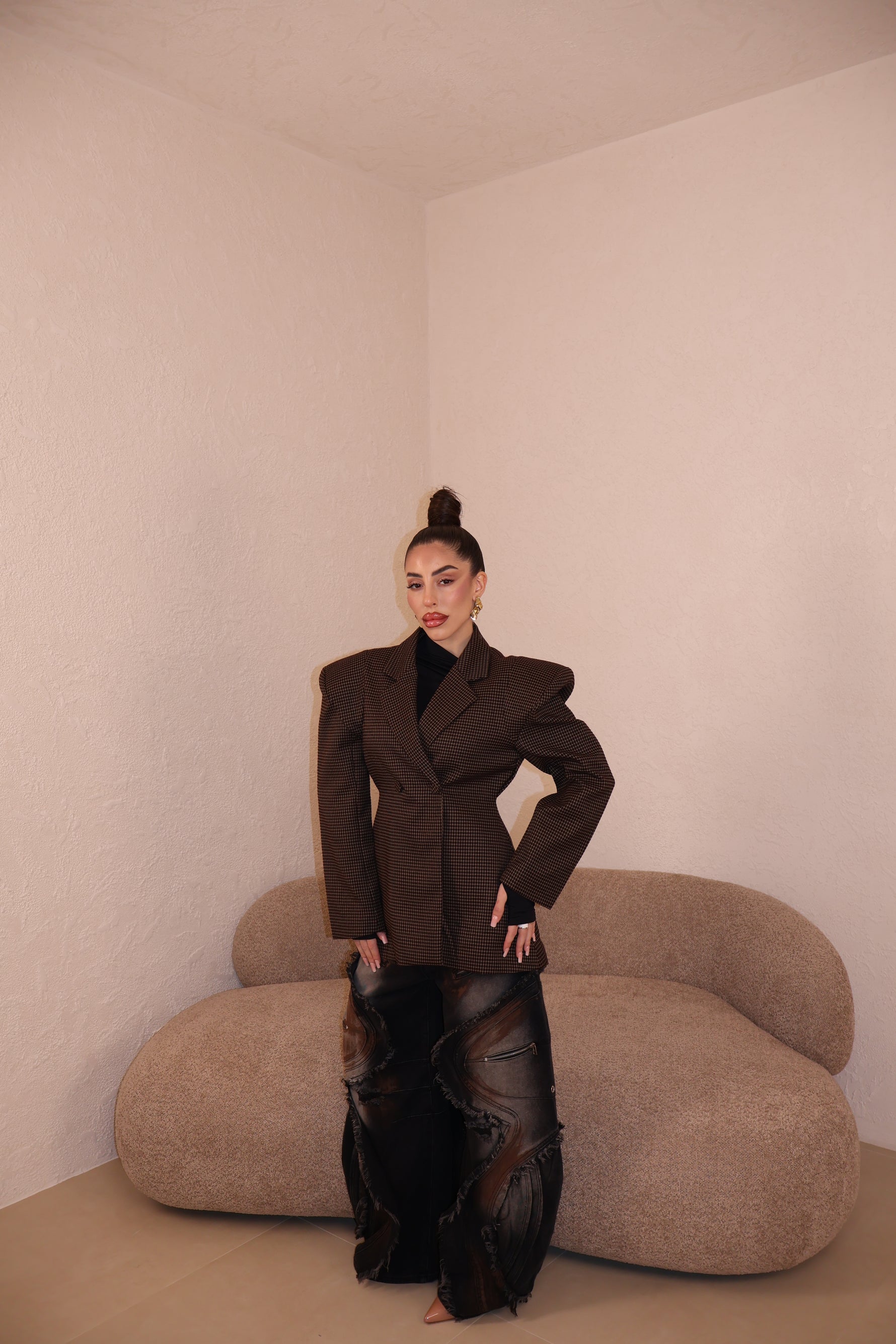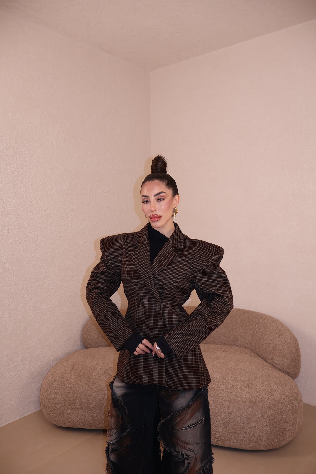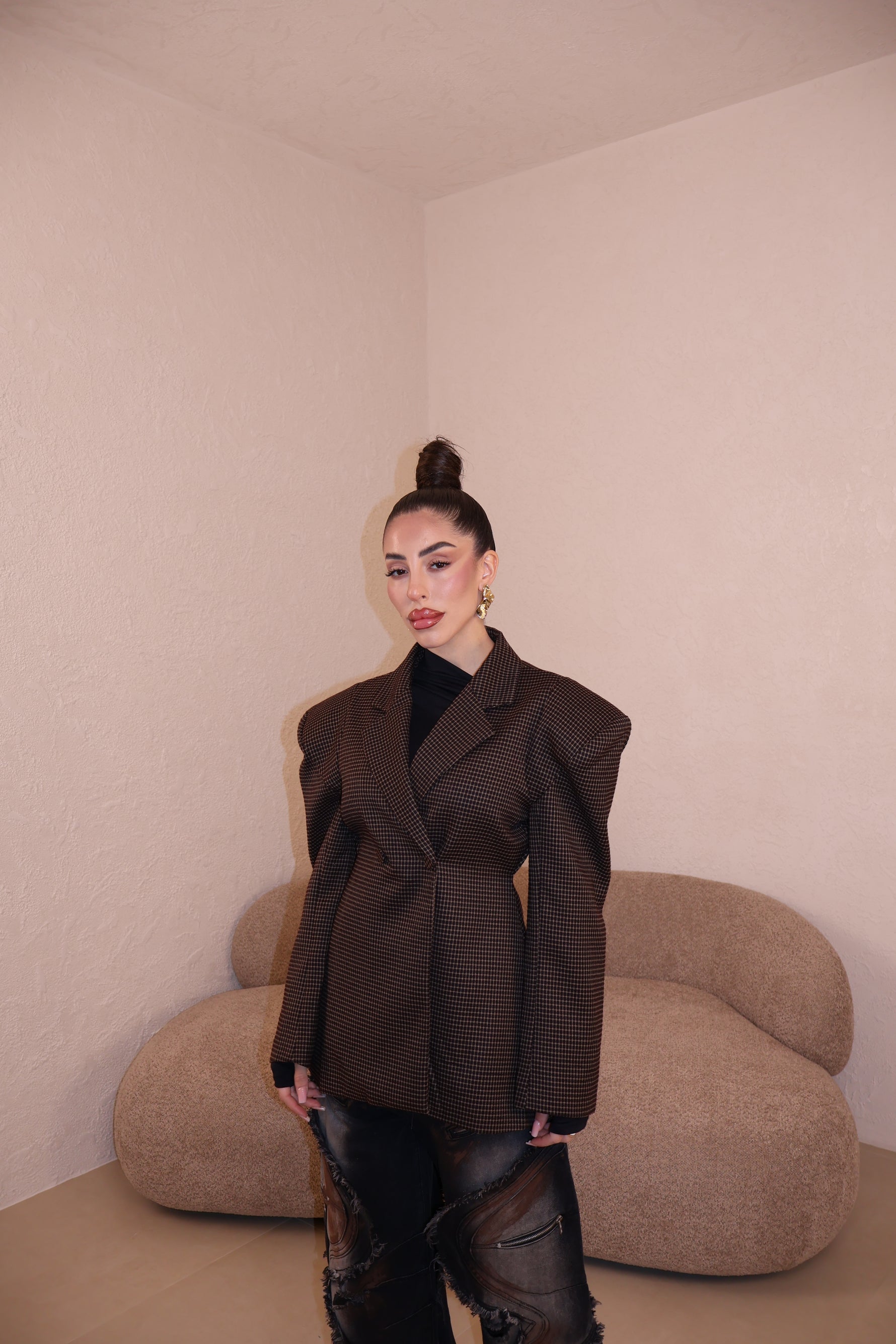 Blazer a quadri vichy con spalline imbottite e chiusura con bottoni frontali in tessuto. Vestibilità regolare. La modella indossa taglia S.