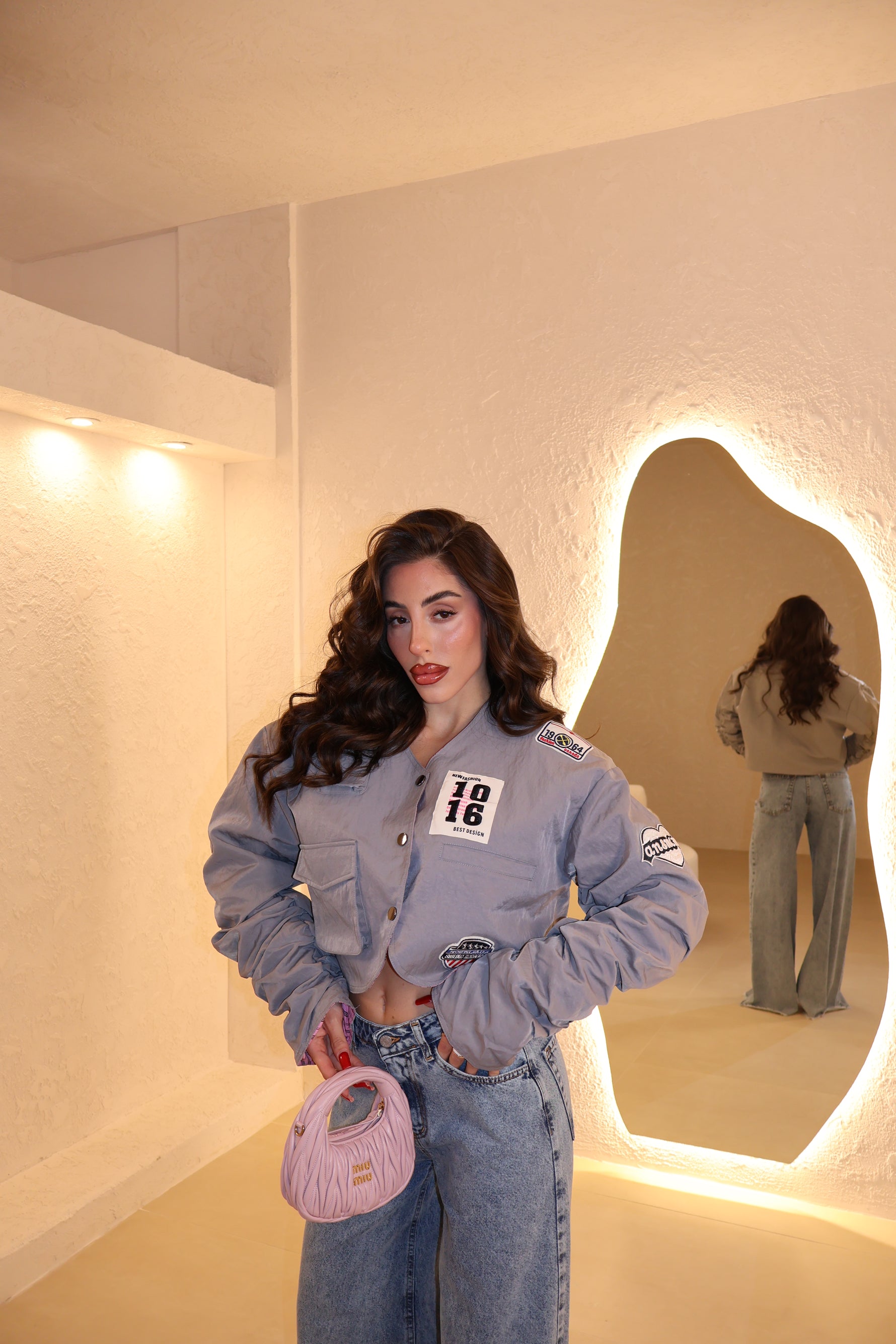 Bomber in nylon con dettagli in stampe varie e maniche arricciate. Taglia unica.