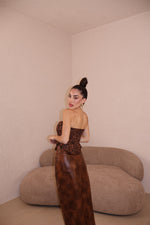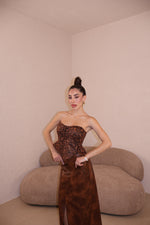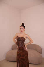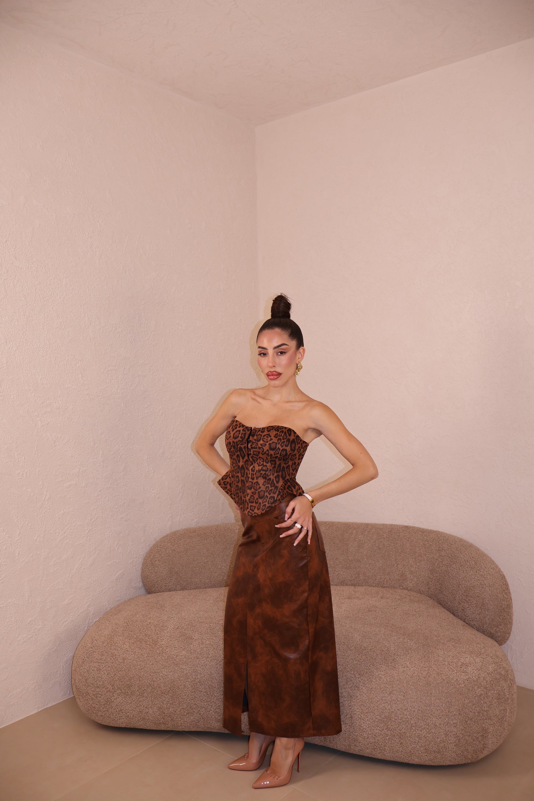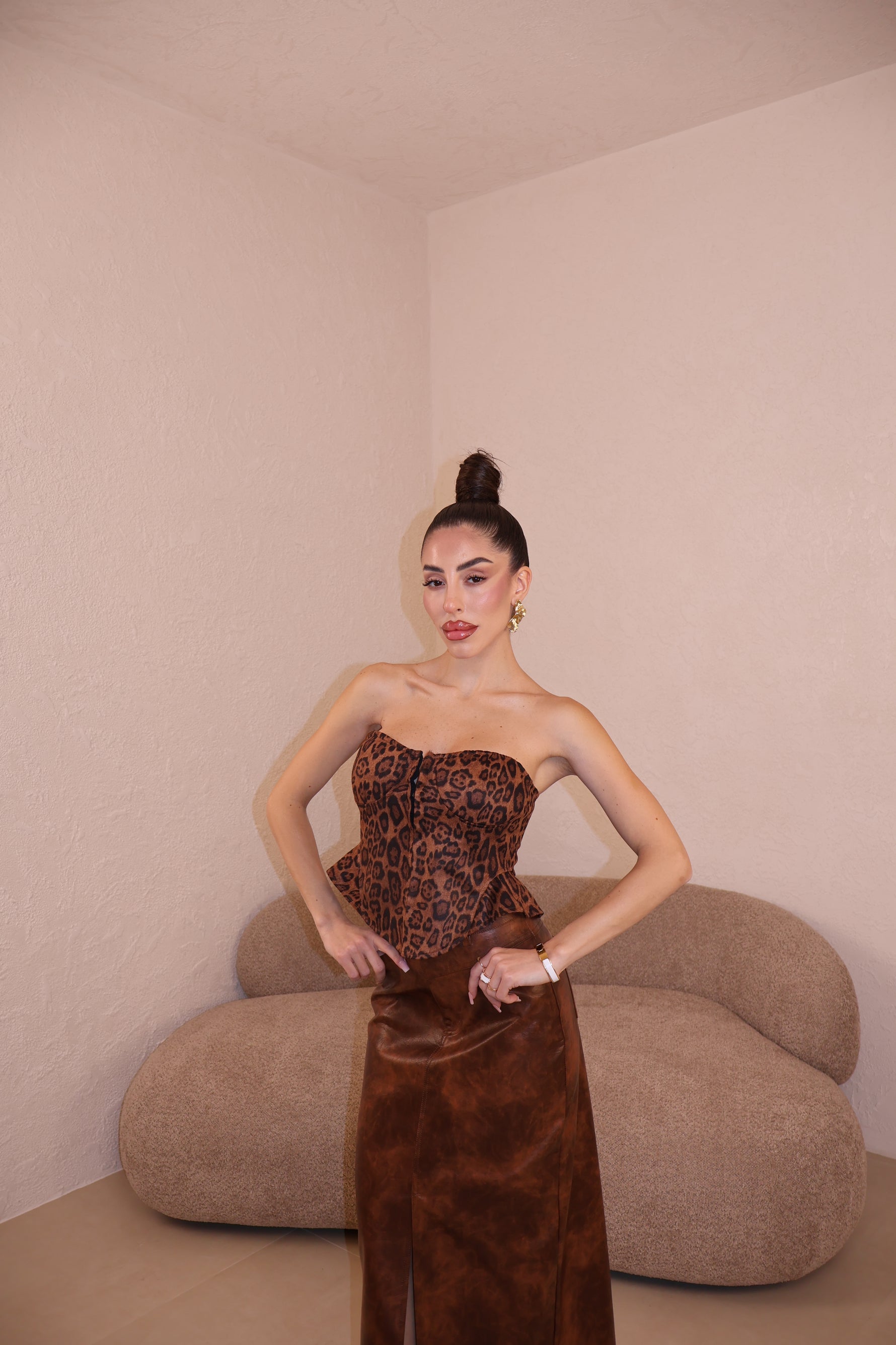 Prezzo unitario / perBustino nella fantasia animalier con gancetti frontali. Tessuto effetto camoscio. La modella indossa taglia S/M.