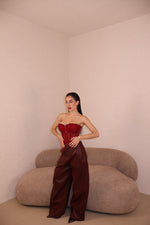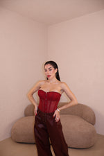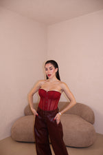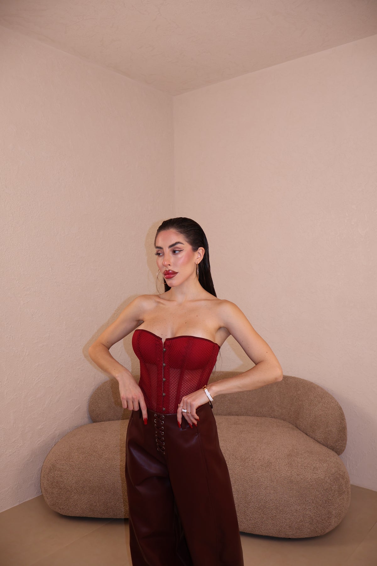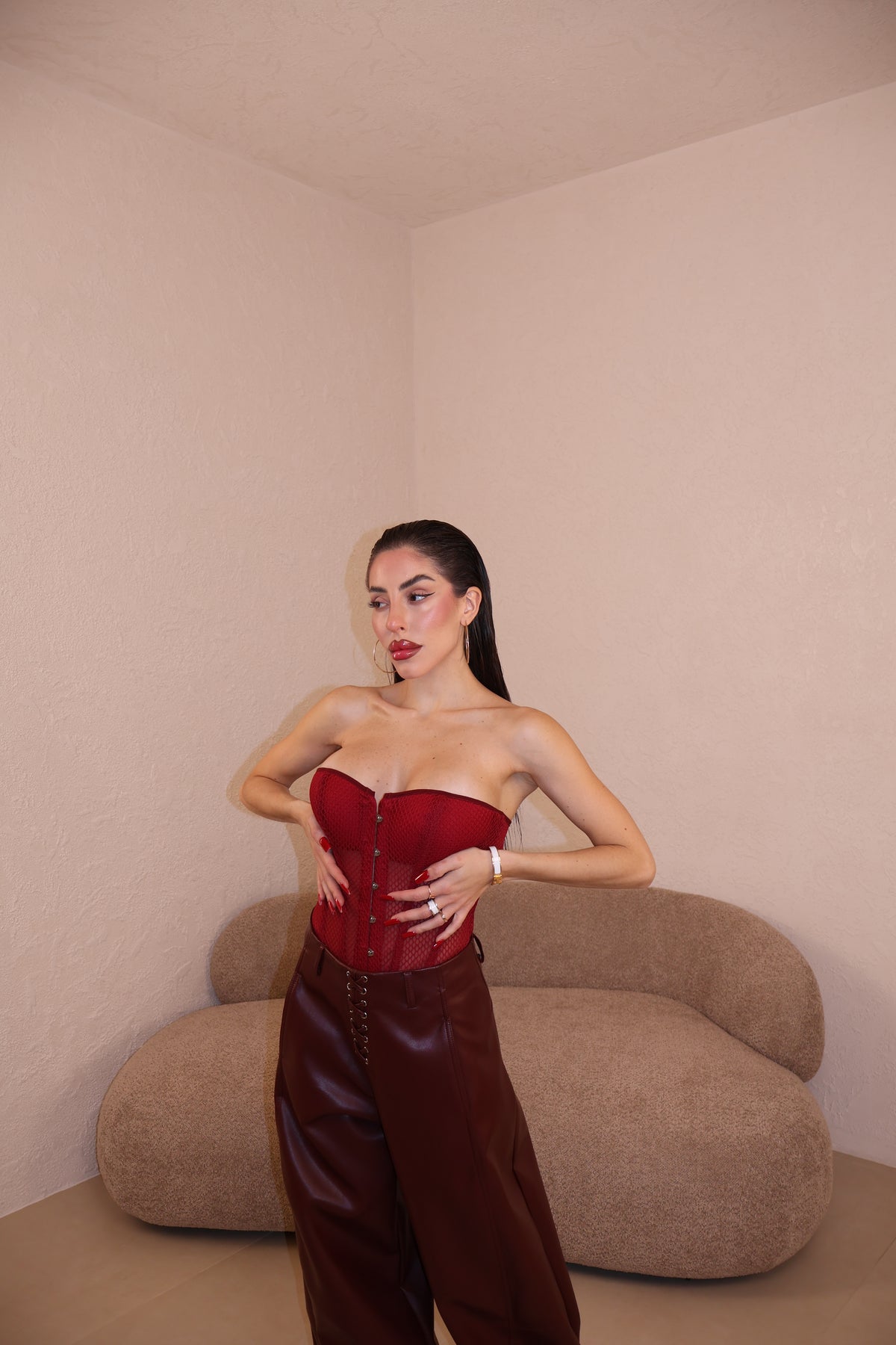 Bustino a rete con gancetti frontali e laccetti regolabili sul retro. La modella indossa taglia S.