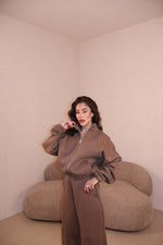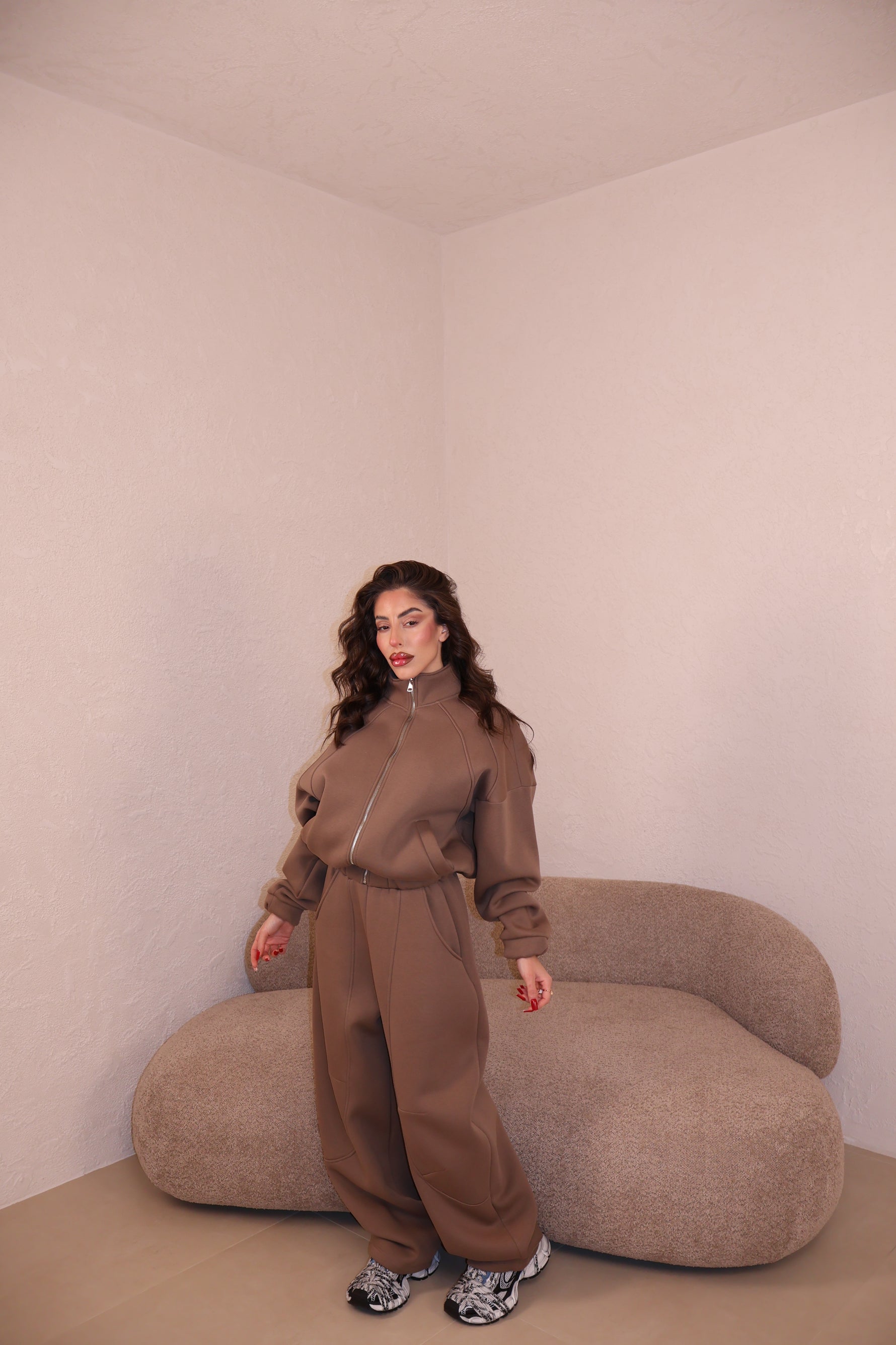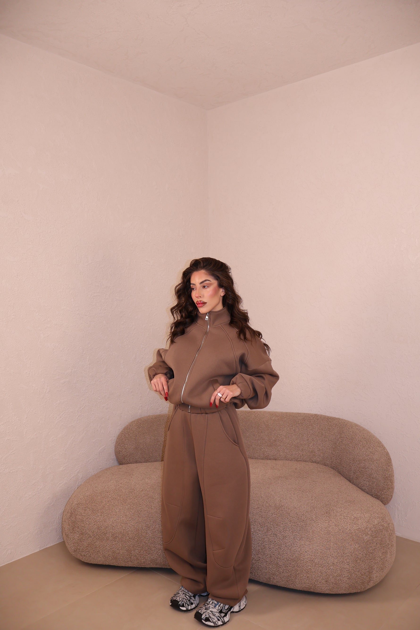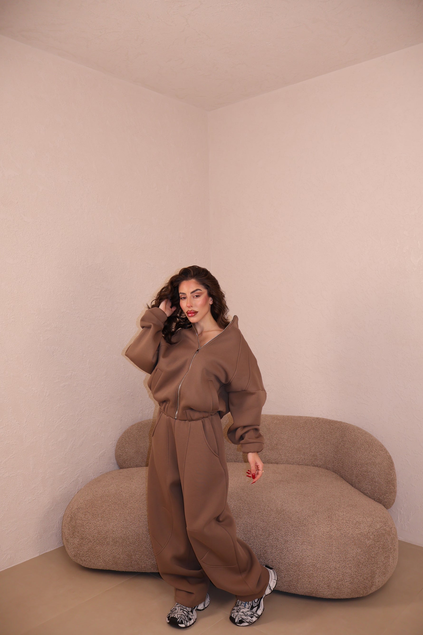 Coordinato di tuta felpato composto da pantaloni modello balloon con elastico in vita e felpa con cerniera. Taglia unica.
