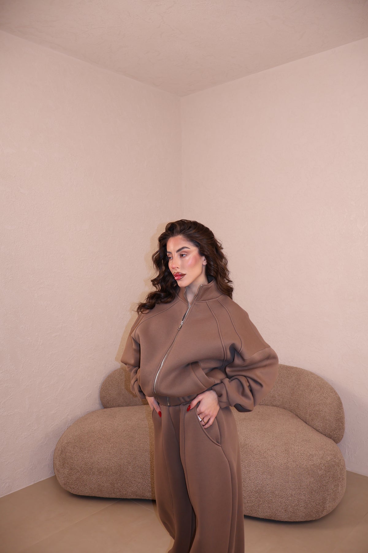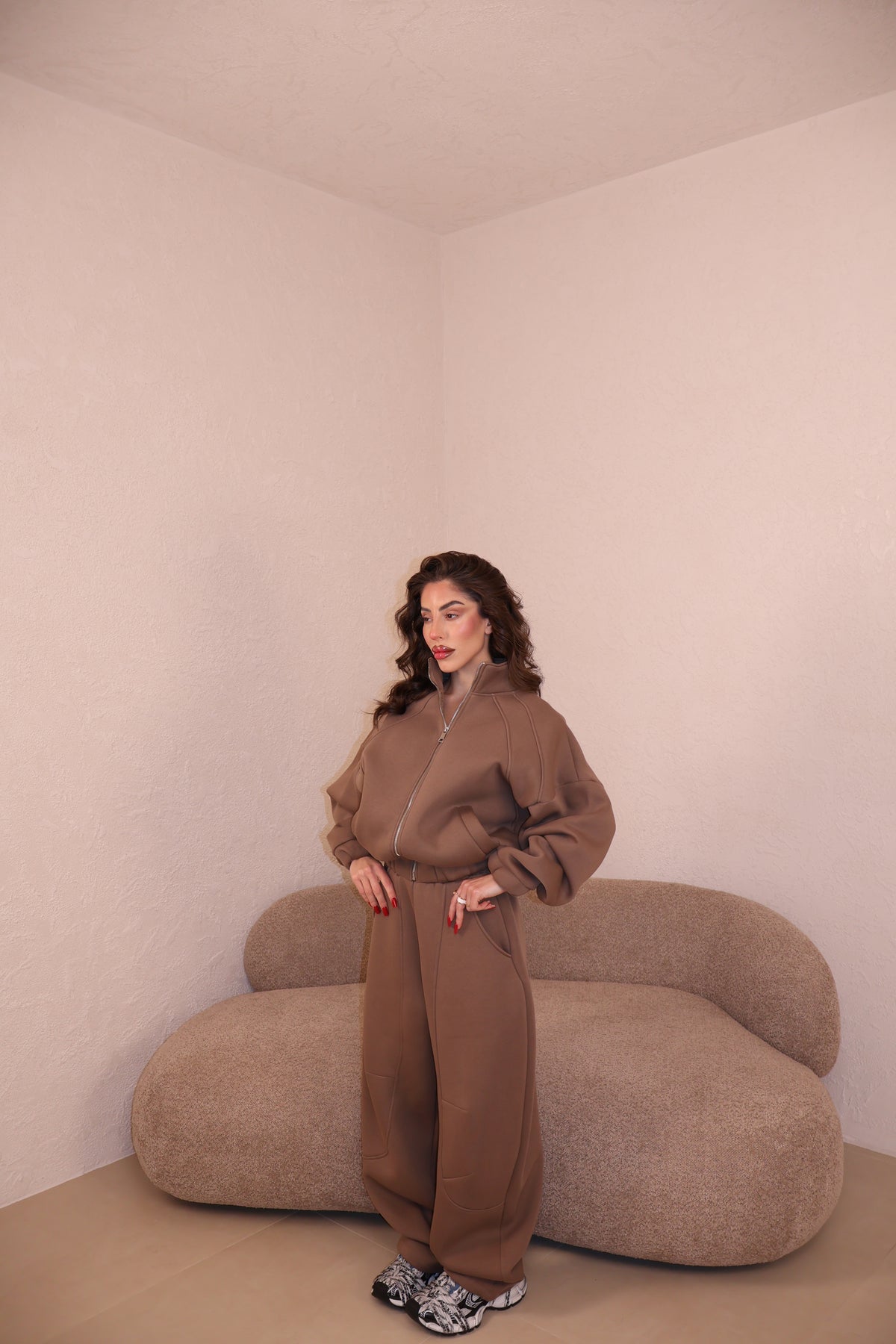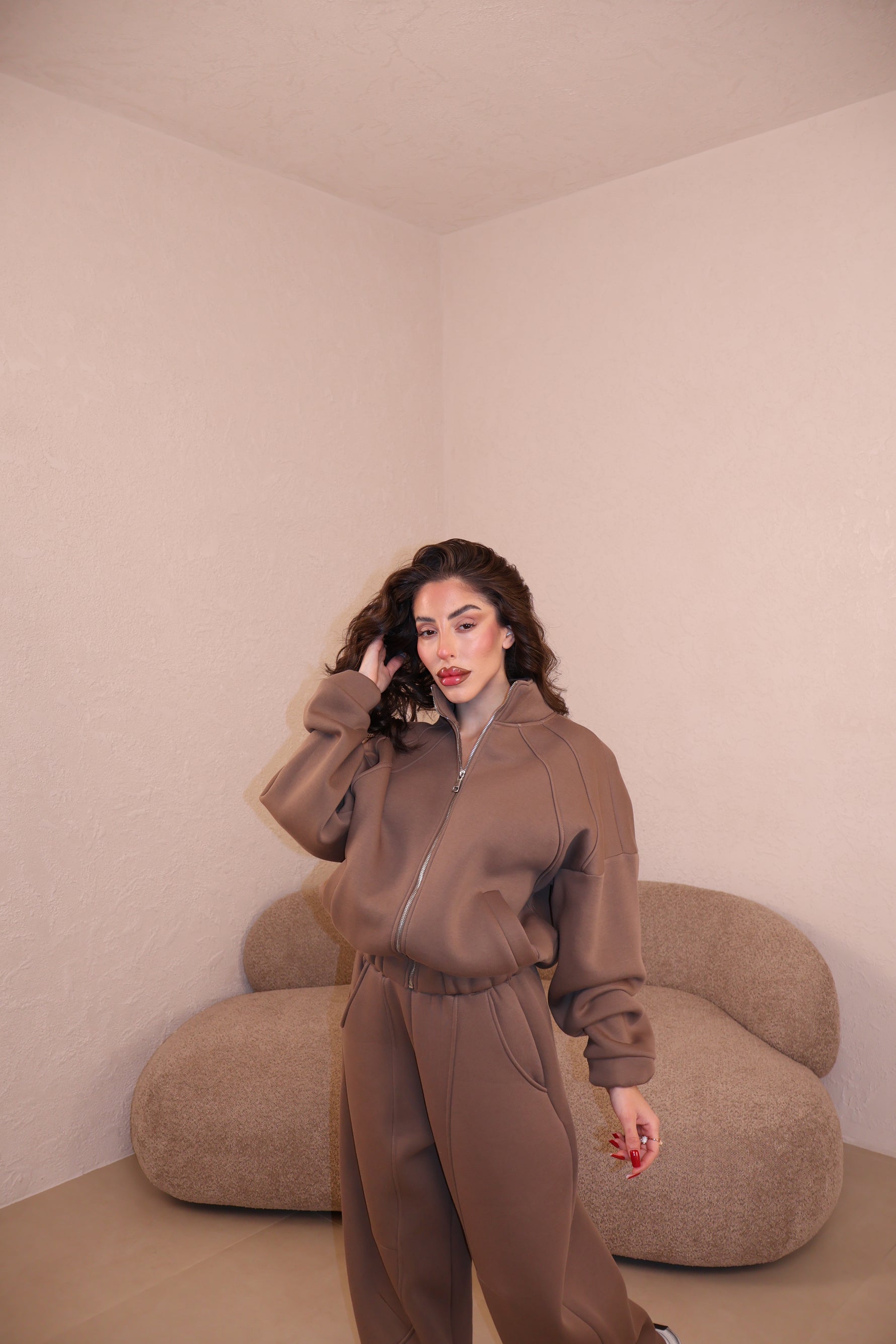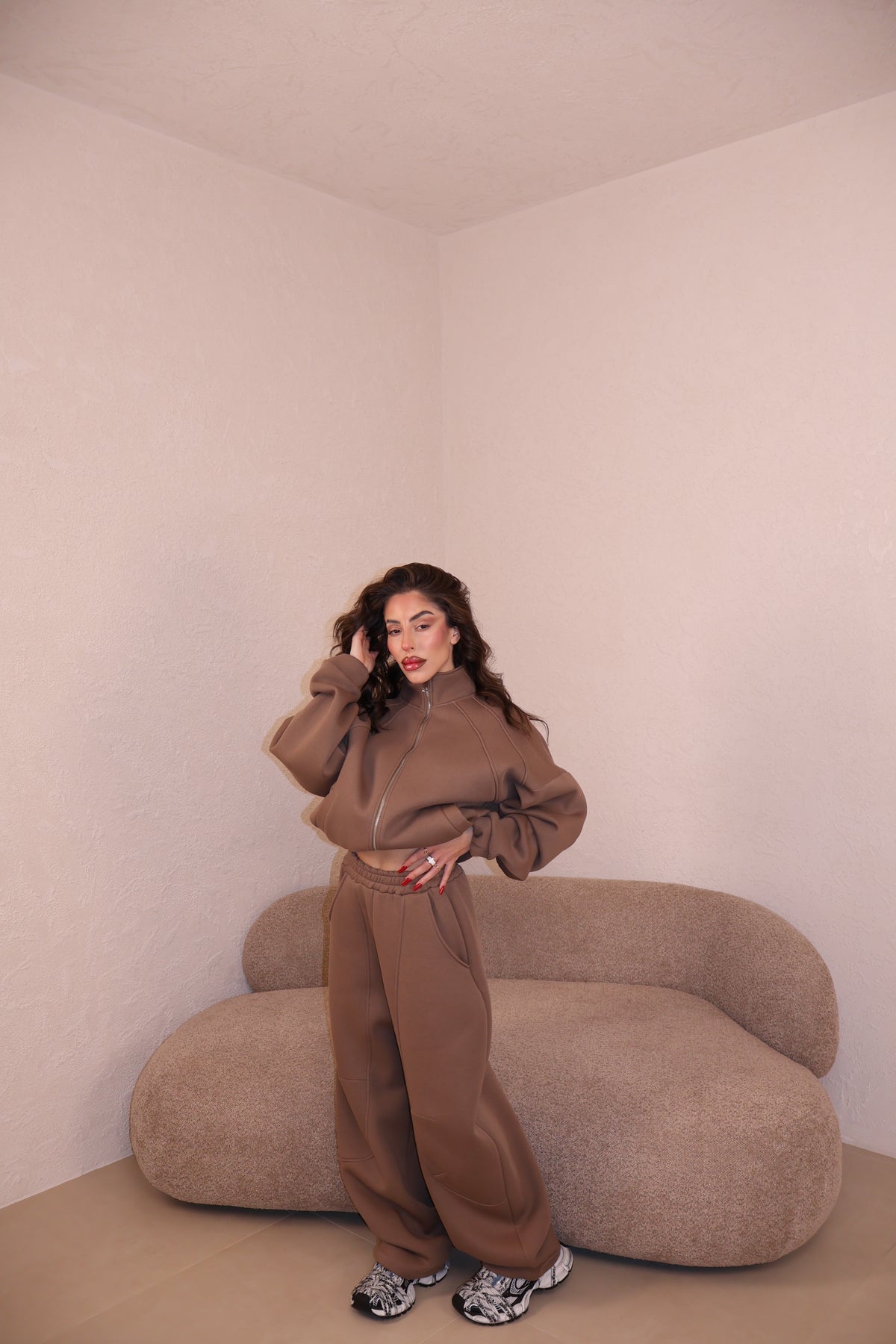 Coordinato di tuta felpato composto da pantaloni modello balloon con elastico in vita e felpa con cerniera. Taglia unica.
