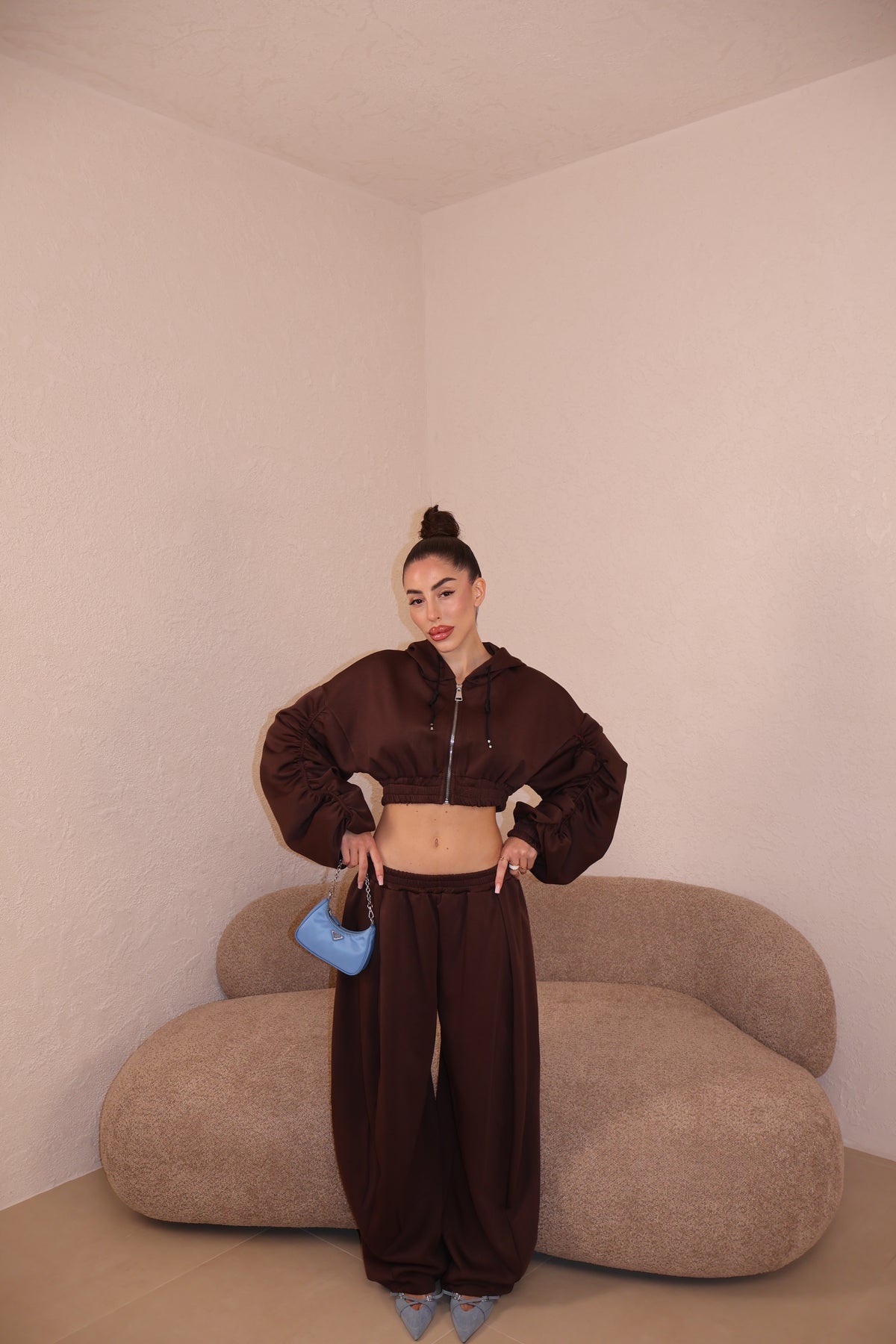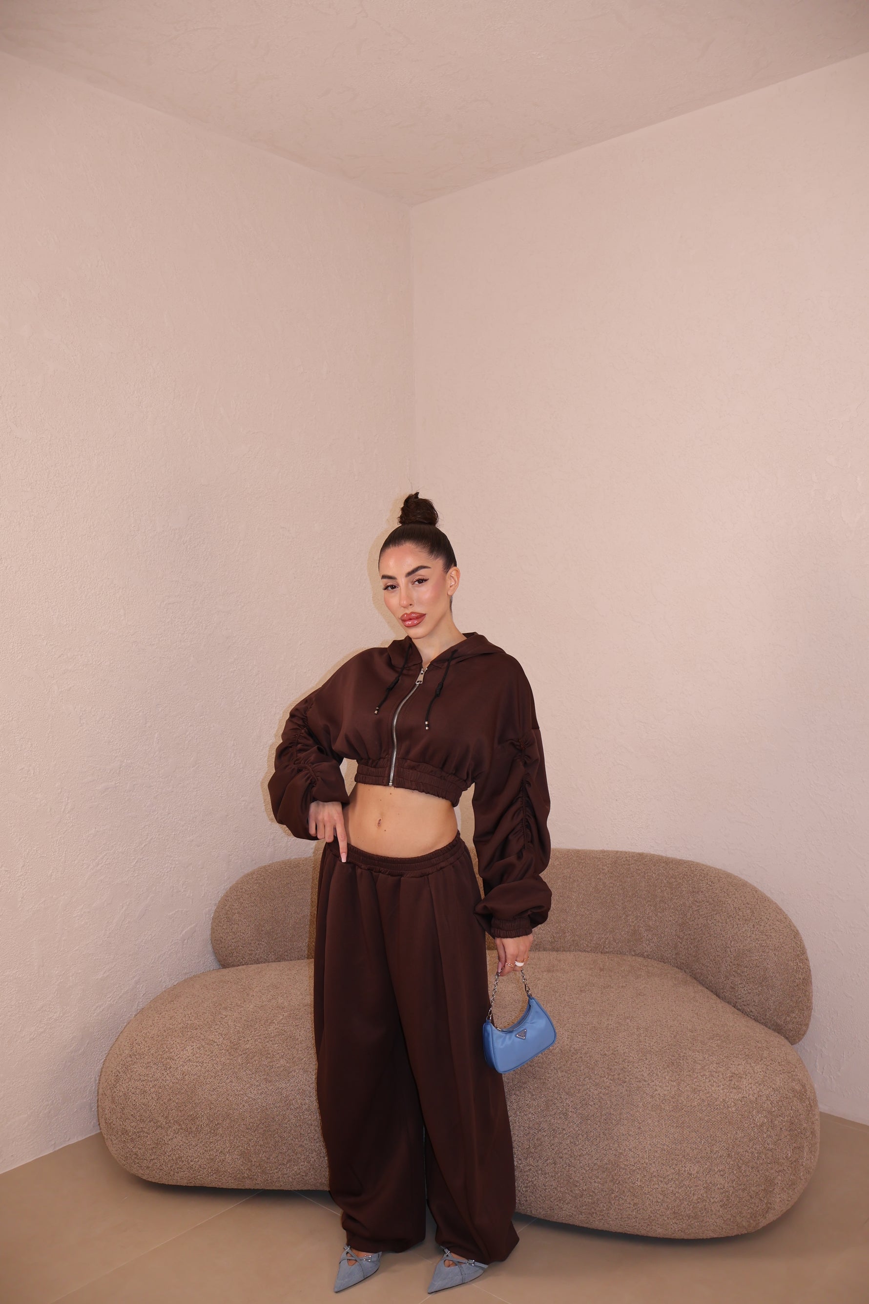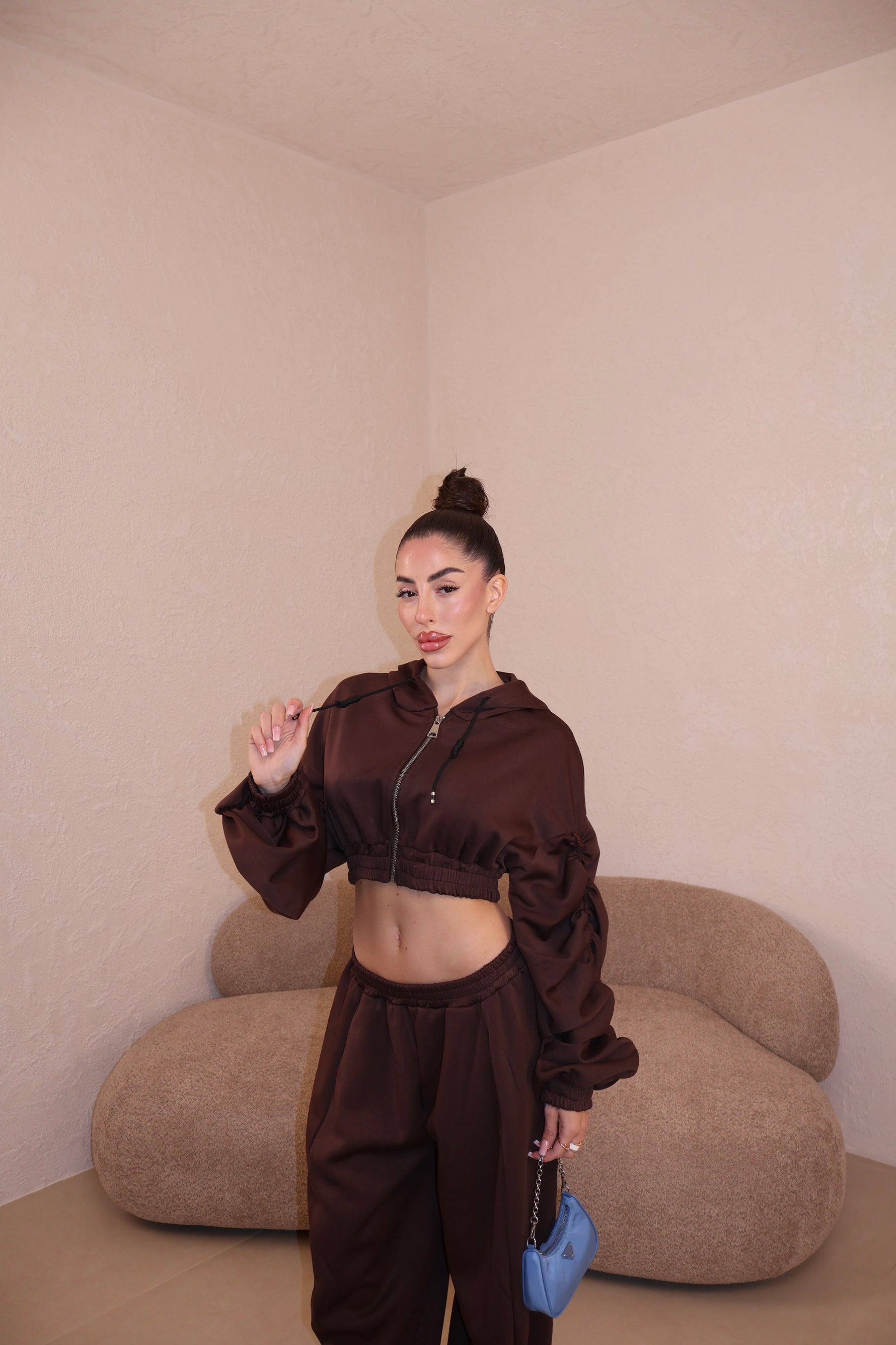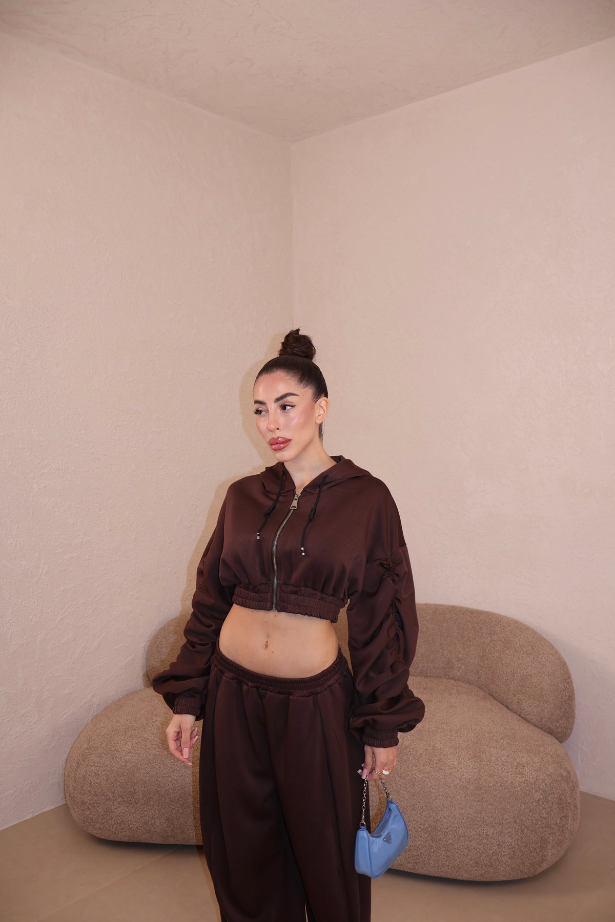 Coordinato di tuta composto da pantaloni morbidi con elastico in vita e felpa crop con maniche arricciate,cerniera frontale e cappuccio. Taglia unica.