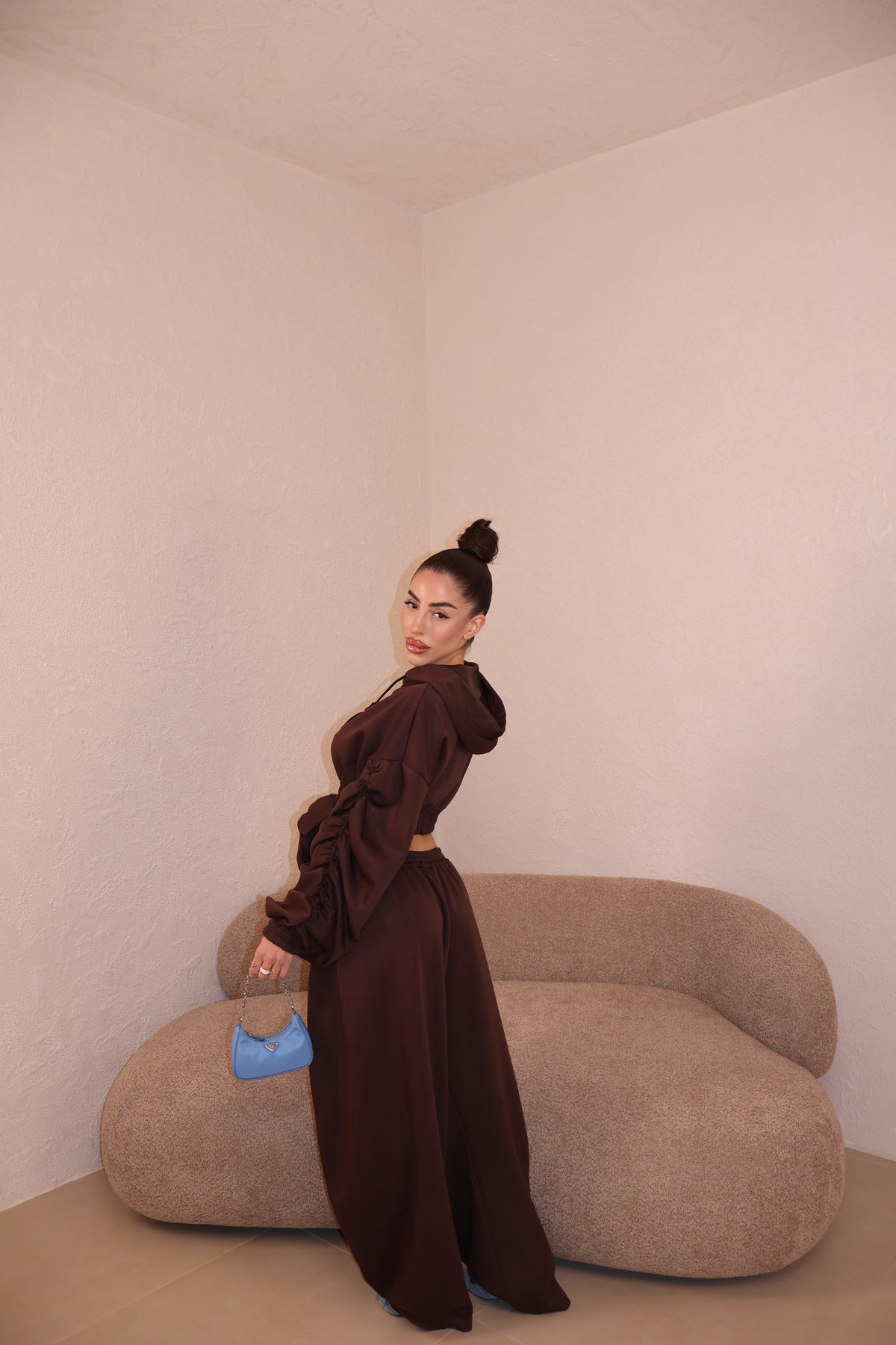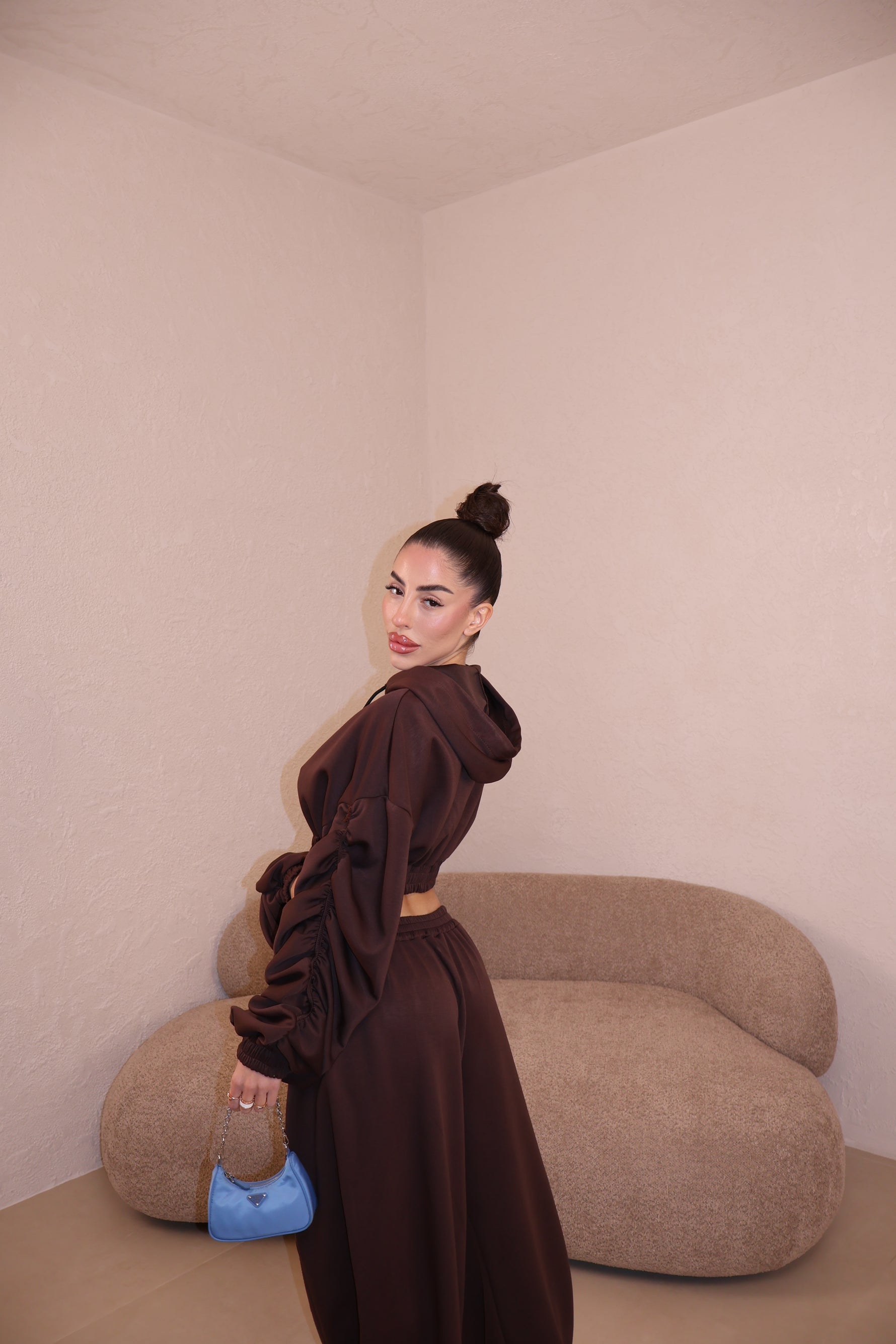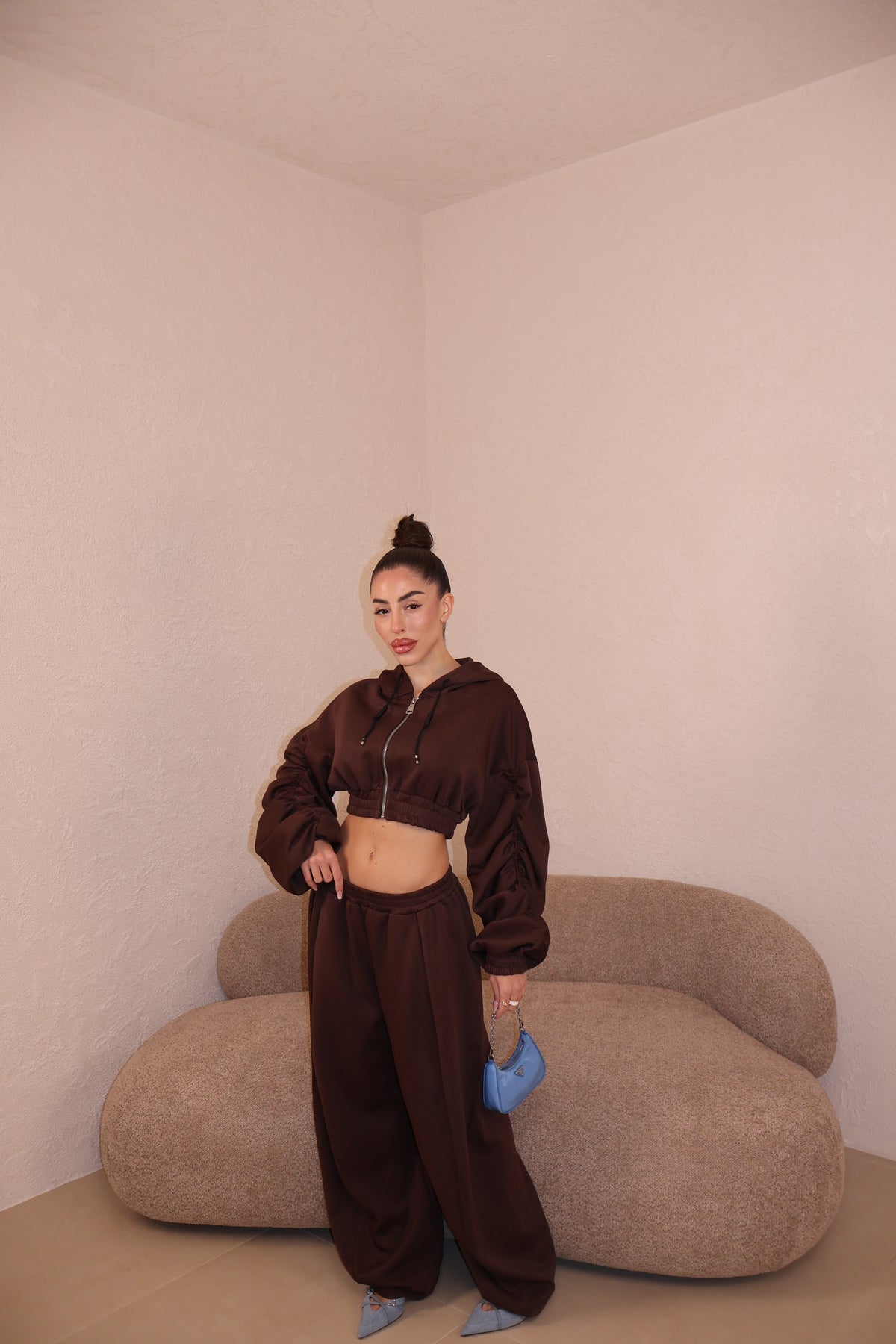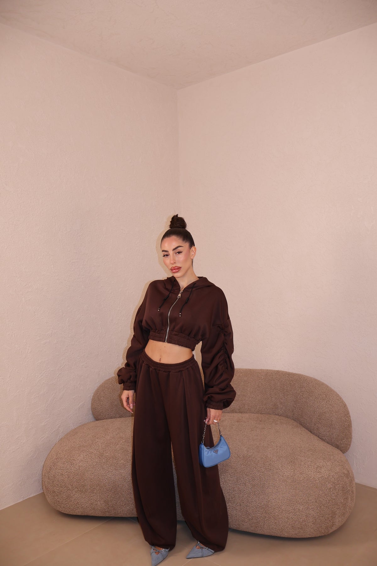 Coordinato di tuta composto da pantaloni morbidi con elastico in vita e felpa crop con maniche arricciate,cerniera frontale e cappuccio. Taglia unica.