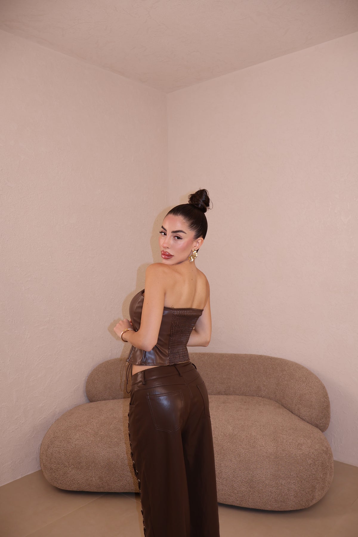 Corsetto in similpelle con dettagli stringhe e cerniere.