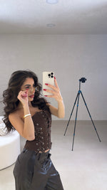 Corsetto con stringhe regolabili e cerniera sul retro. La modella indossa taglia S.