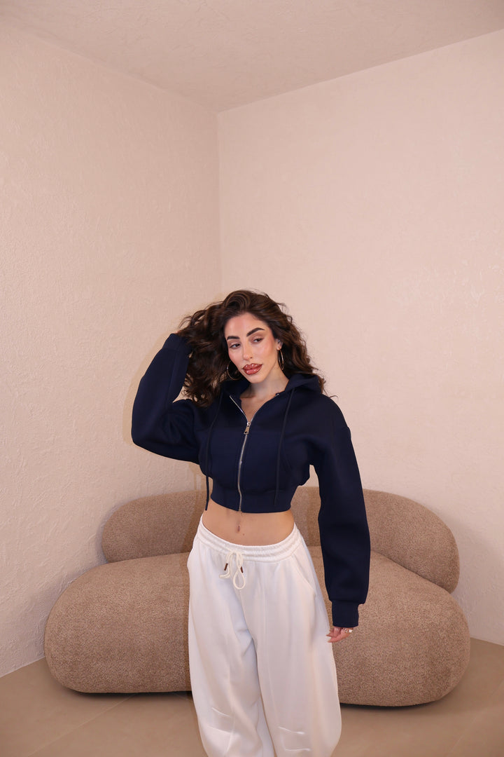 Felpa corta con cerniera, cappuccio ed elastico in vita. La modella indossa taglia S.