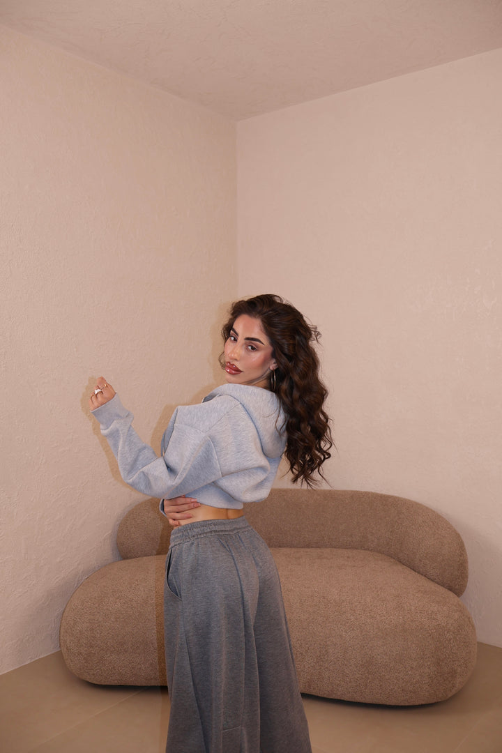Felpa corta con cerniera, cappuccio ed elastico in vita. La modella indossa taglia S.