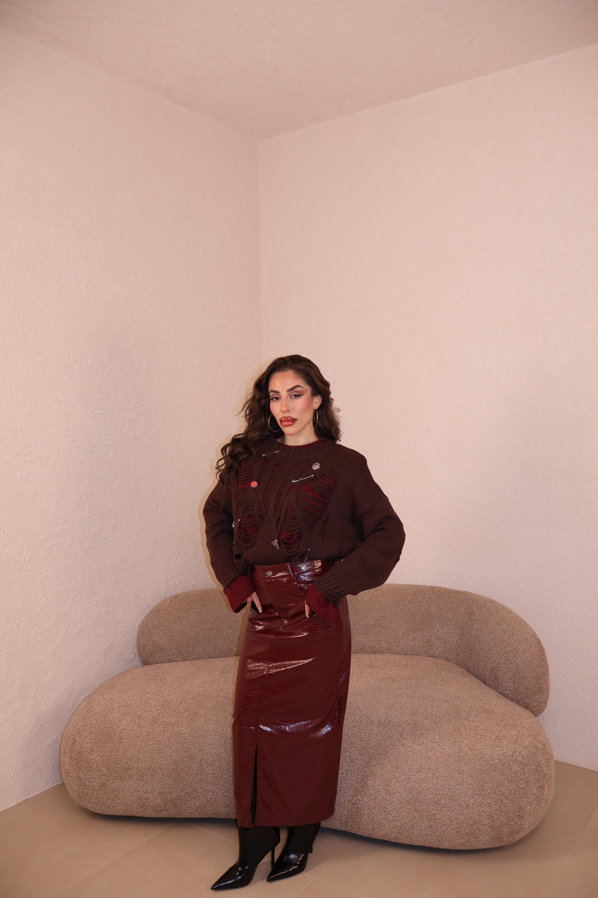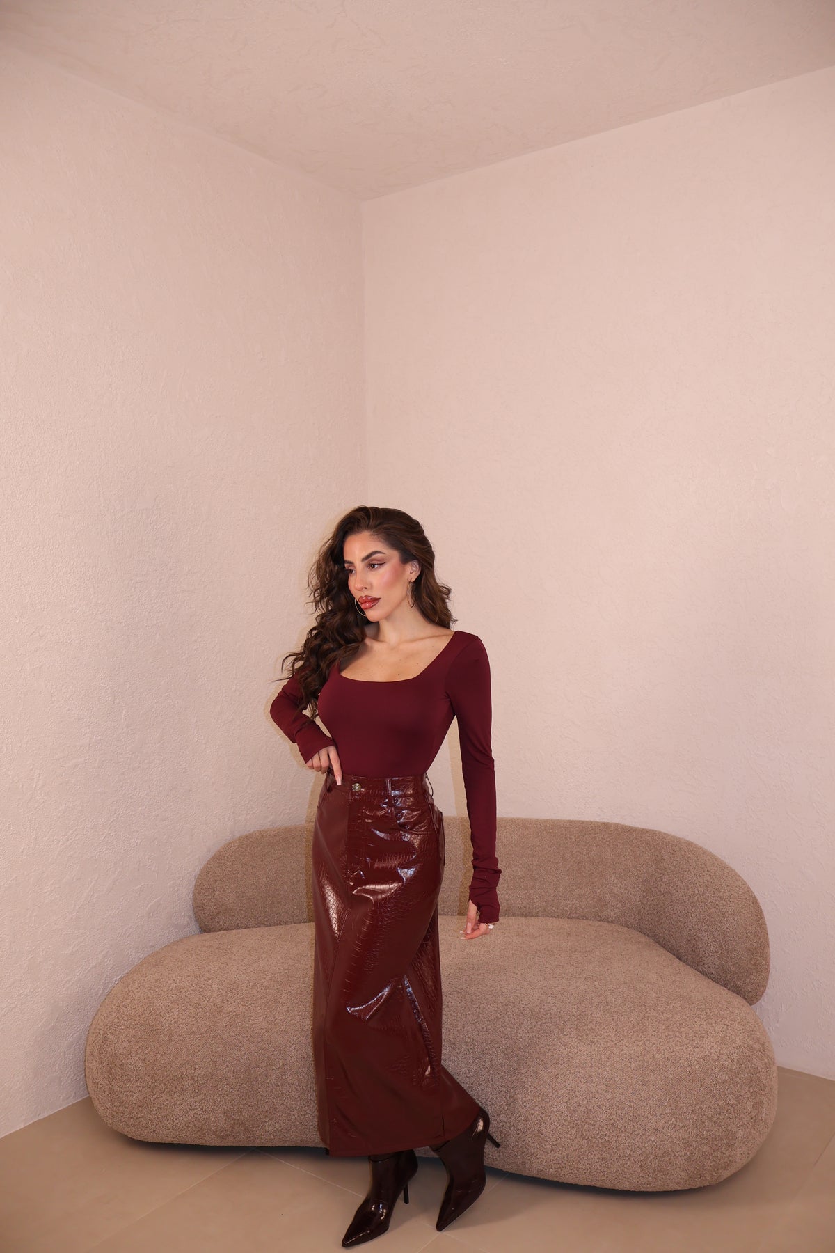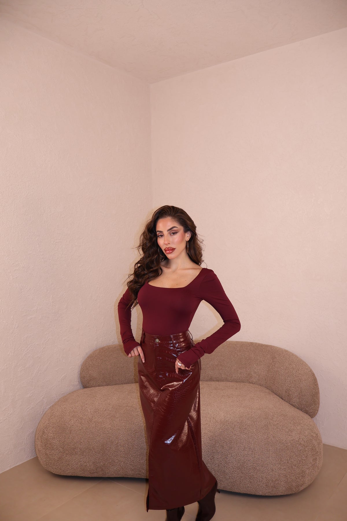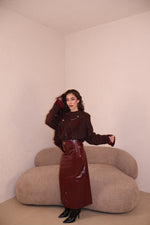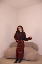 Gonna in vernica pitonata con spacco frontale. La modella indossa taglia S.