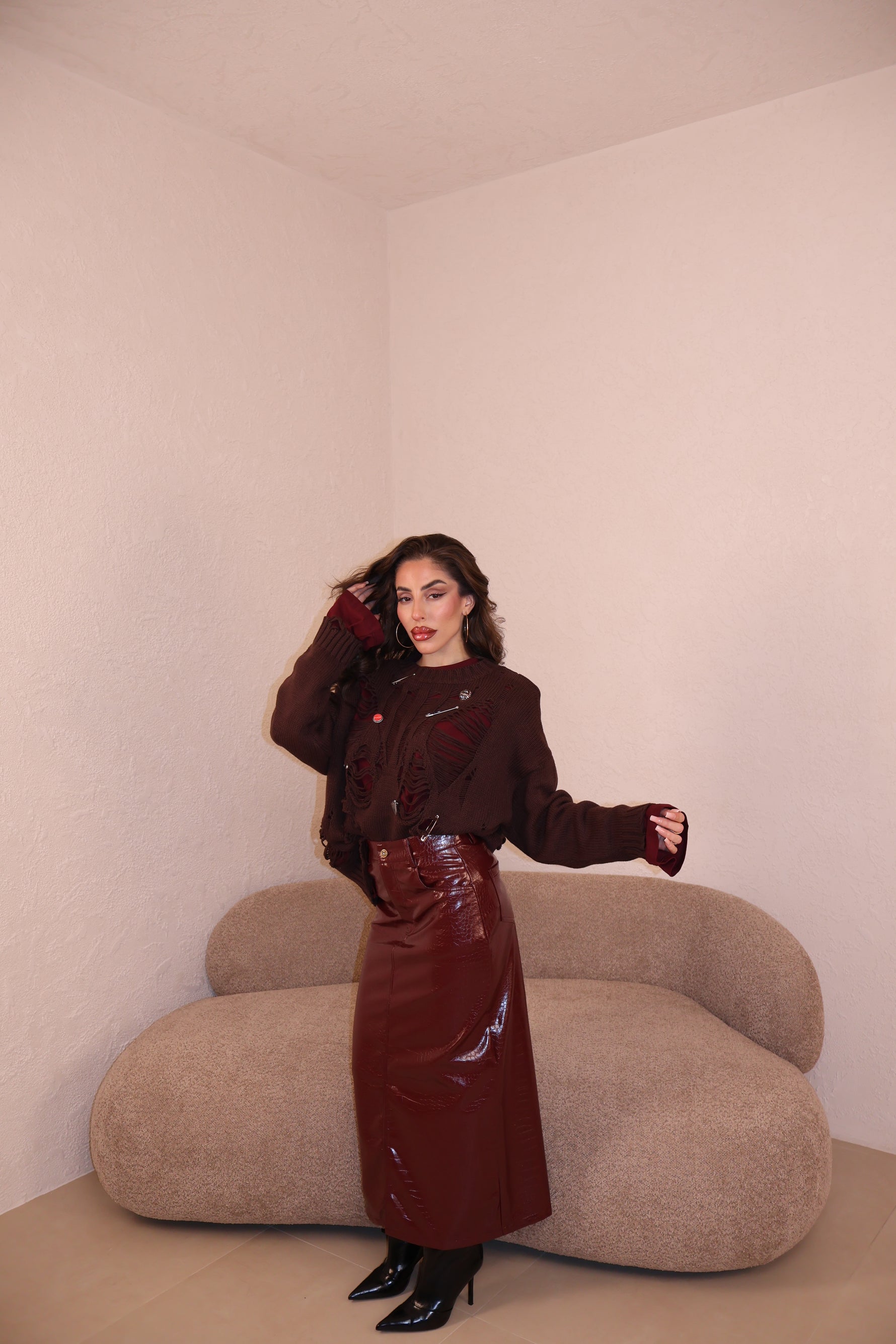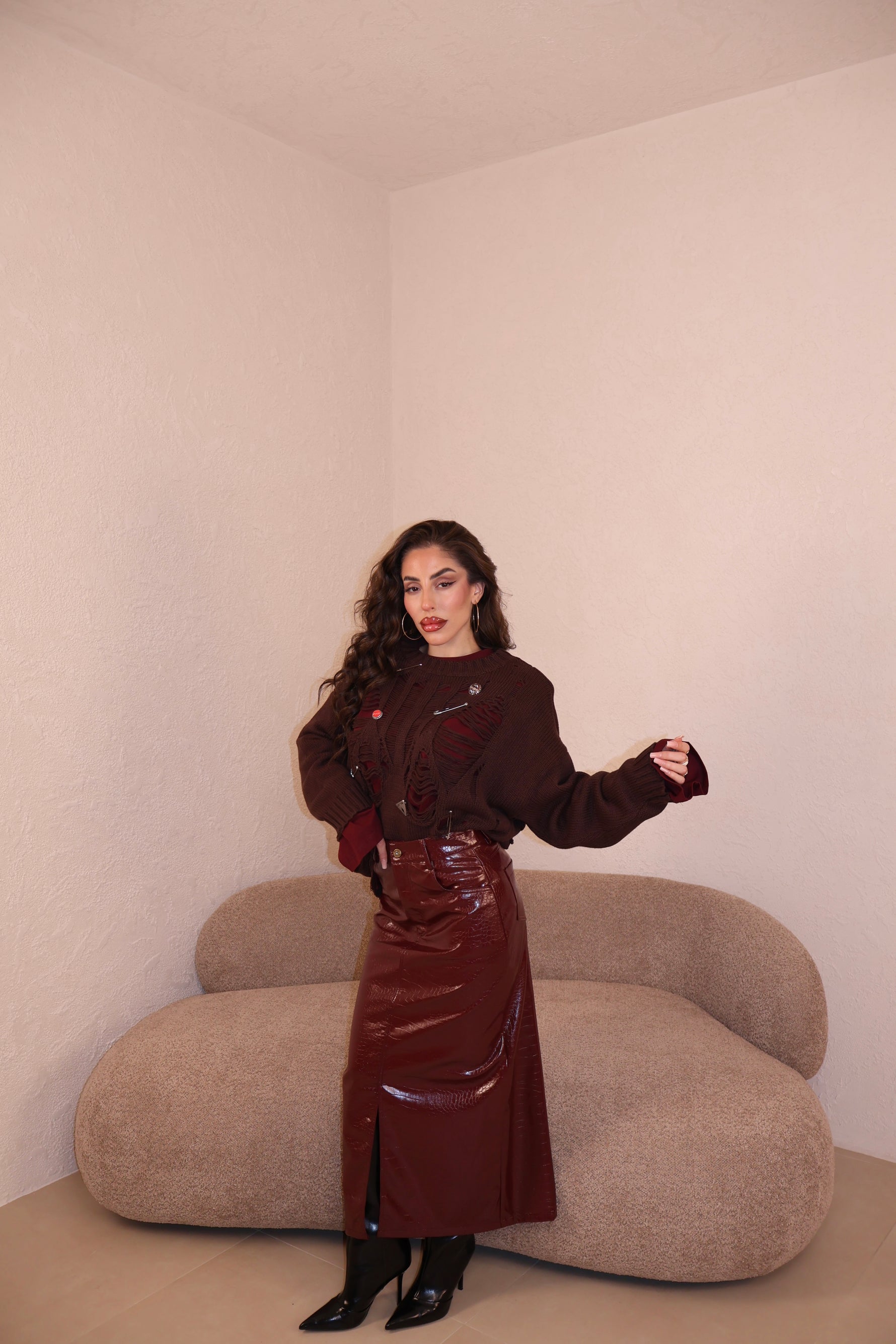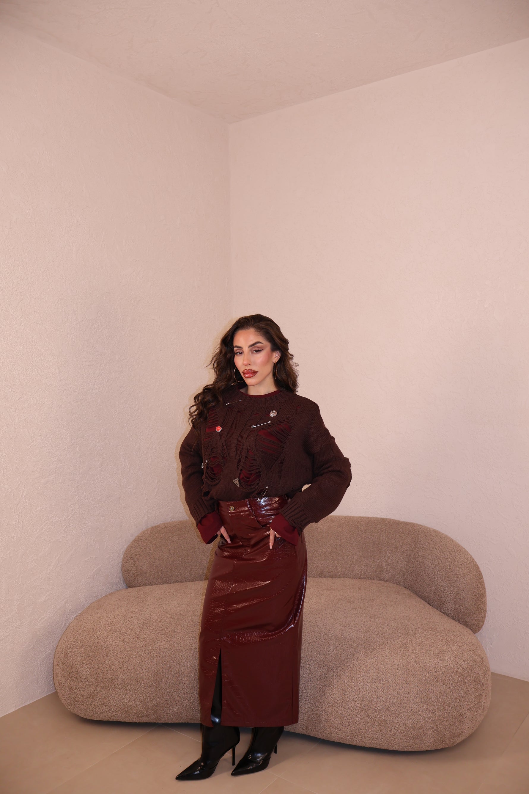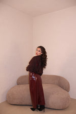 Gonna in vernica pitonata con spacco frontale. La modella indossa taglia S.
