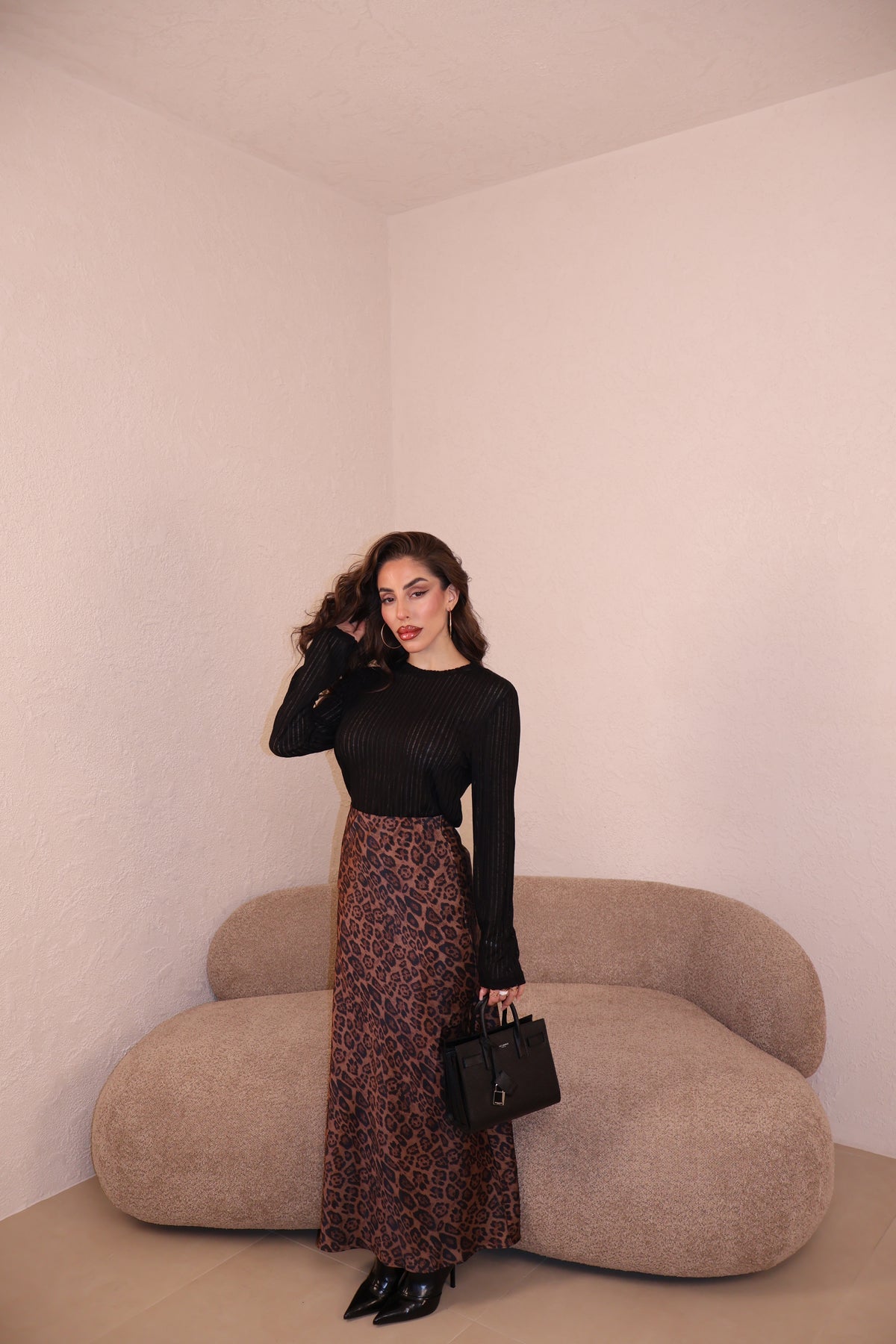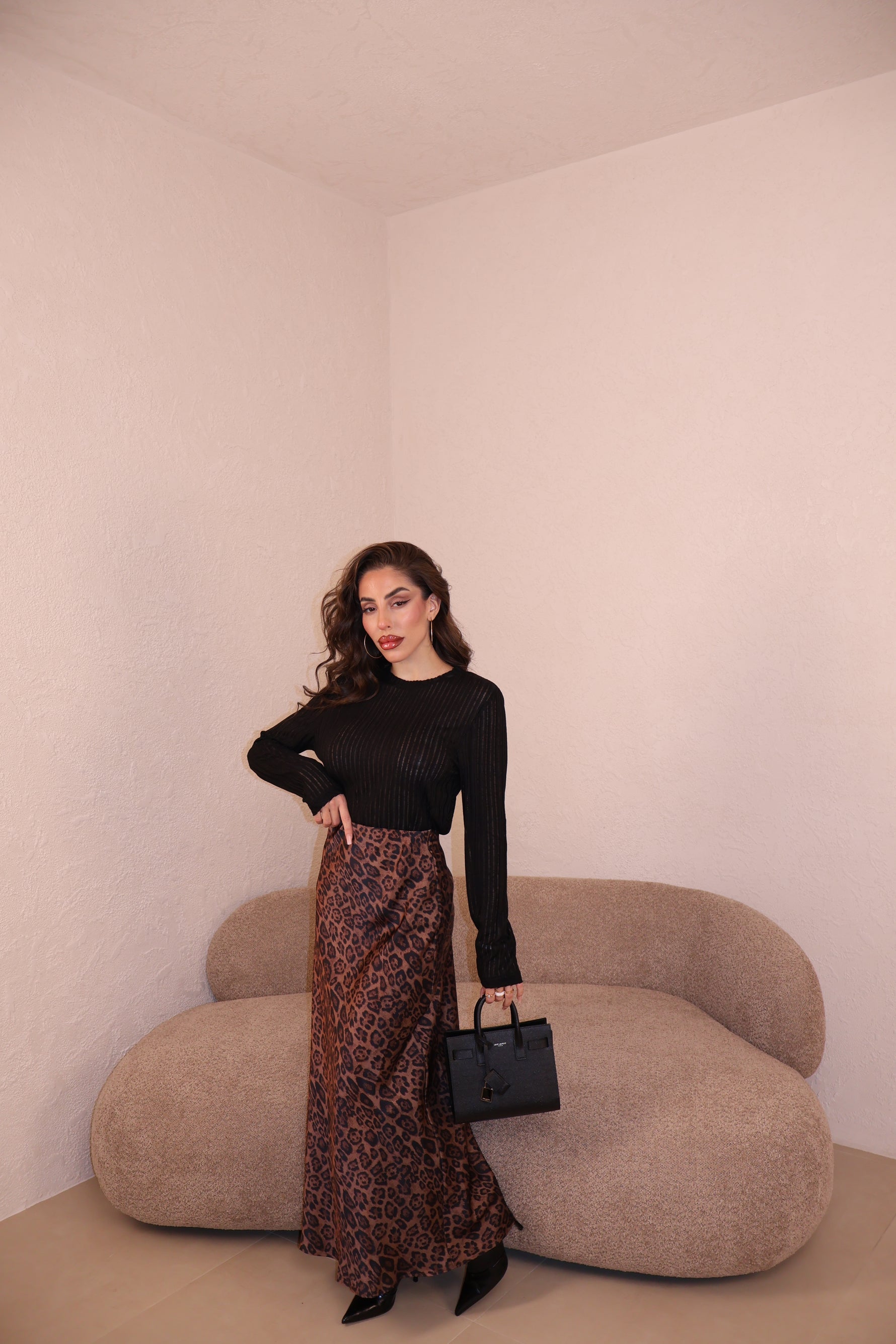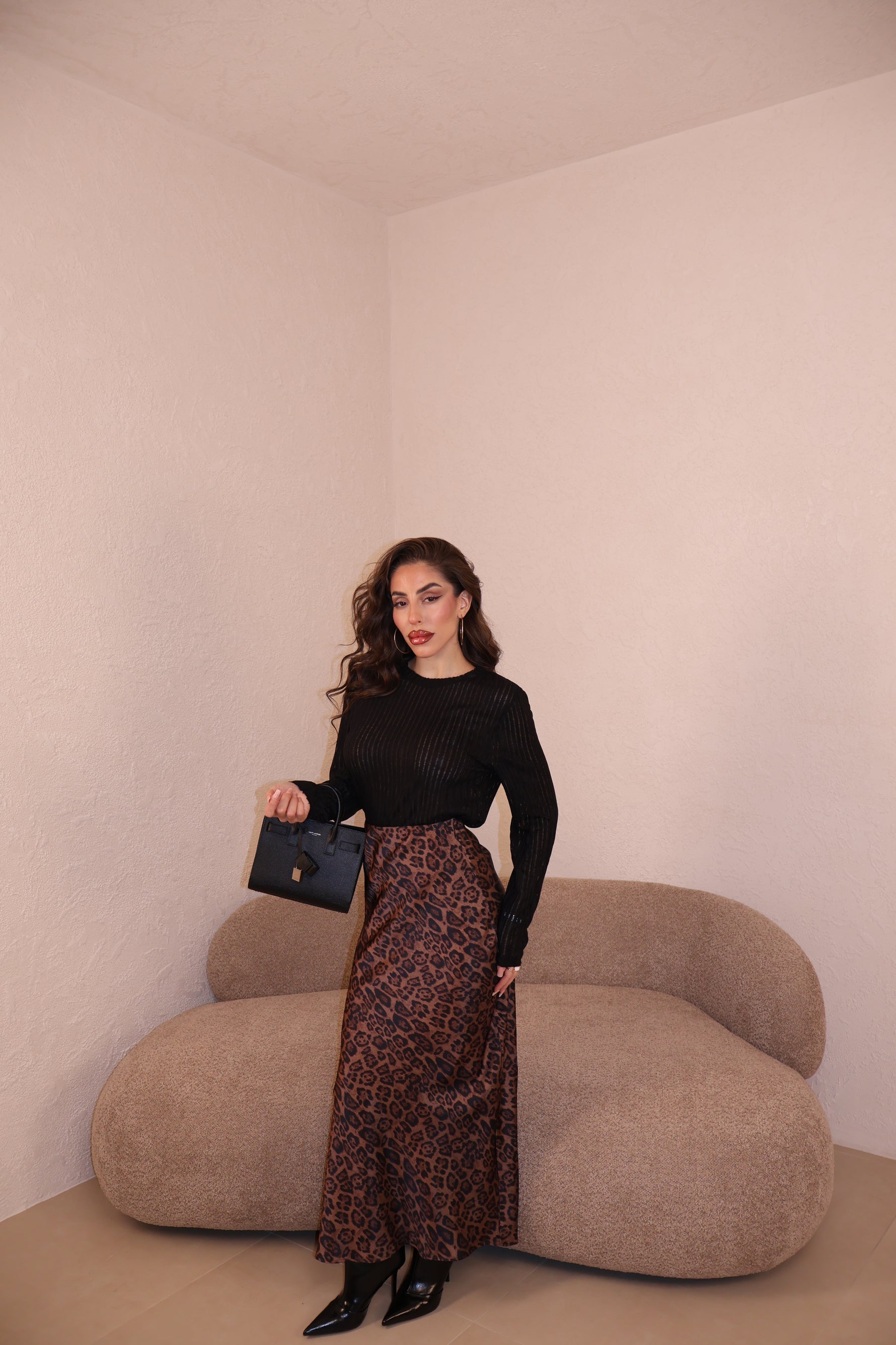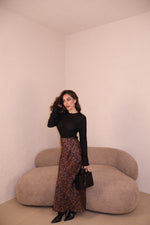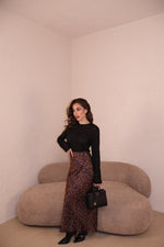 Gonna in raso maculata con elastico in vita. La modella indossa taglia S/M.