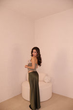 Gonna lunga in raso con elastico in vita. La modella indossa taglia S.