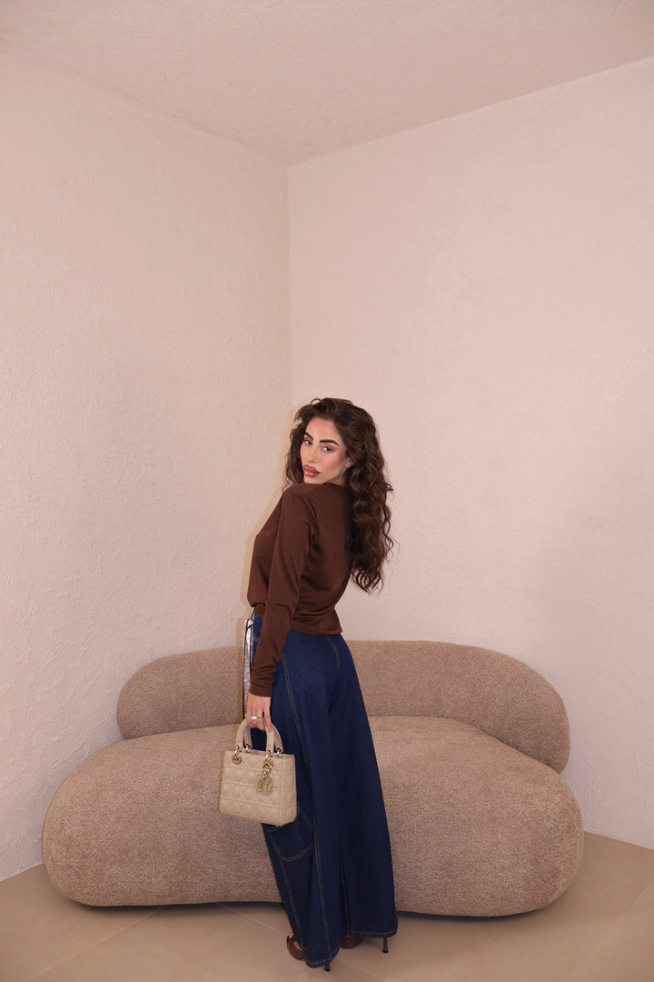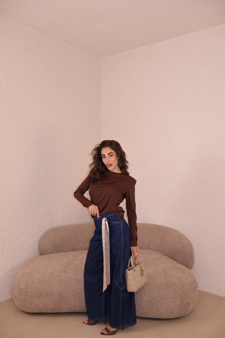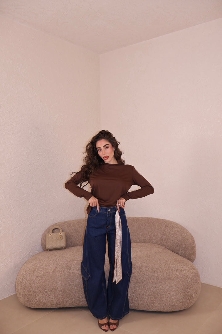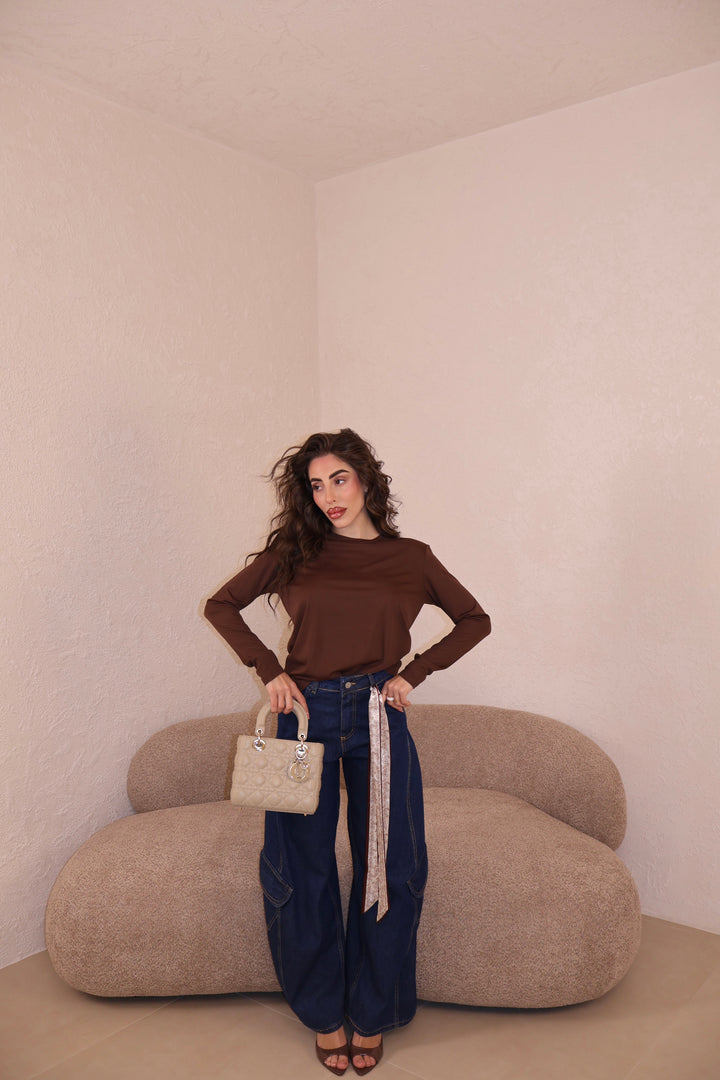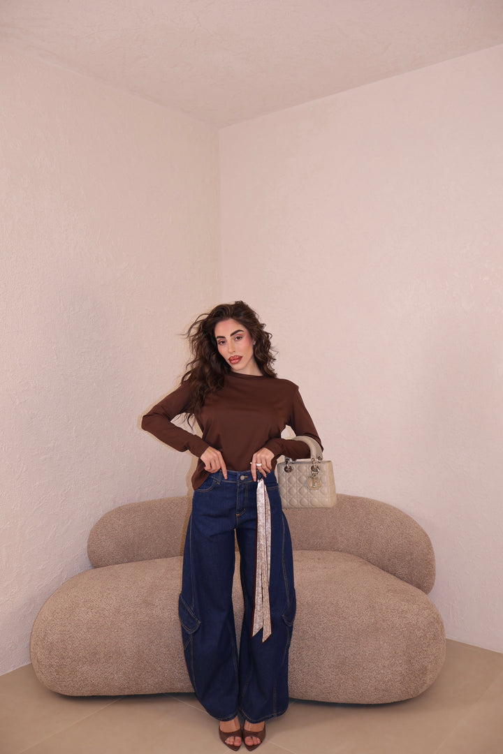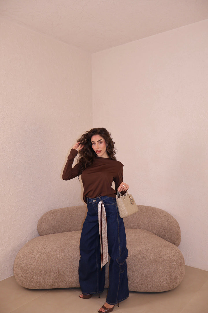 Jeans balloon con cuciture a contrasto e foulard incluso. La modella indossa Taglia S.