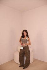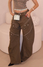 Jeans modello balloon vita bassa con dettagli bottoni. La modella indossa tagli S.
