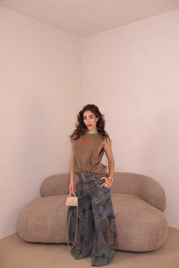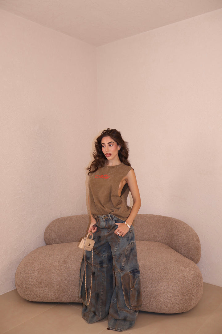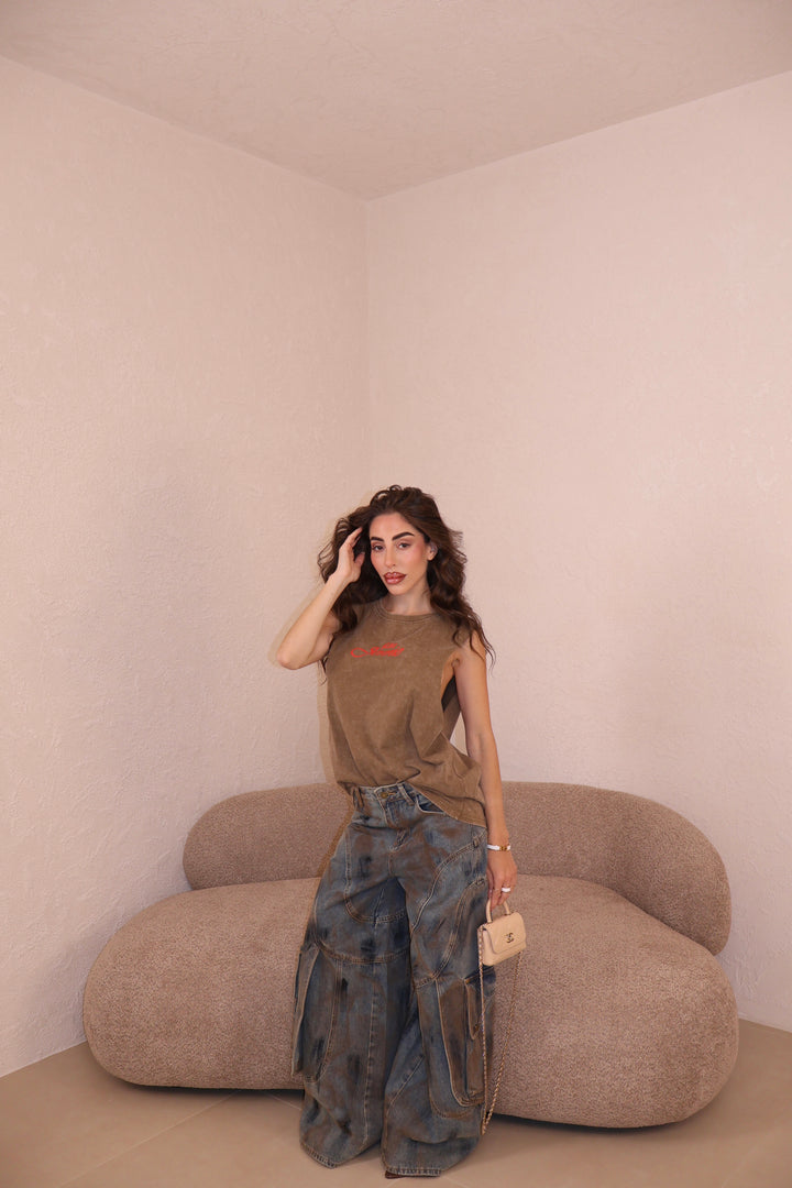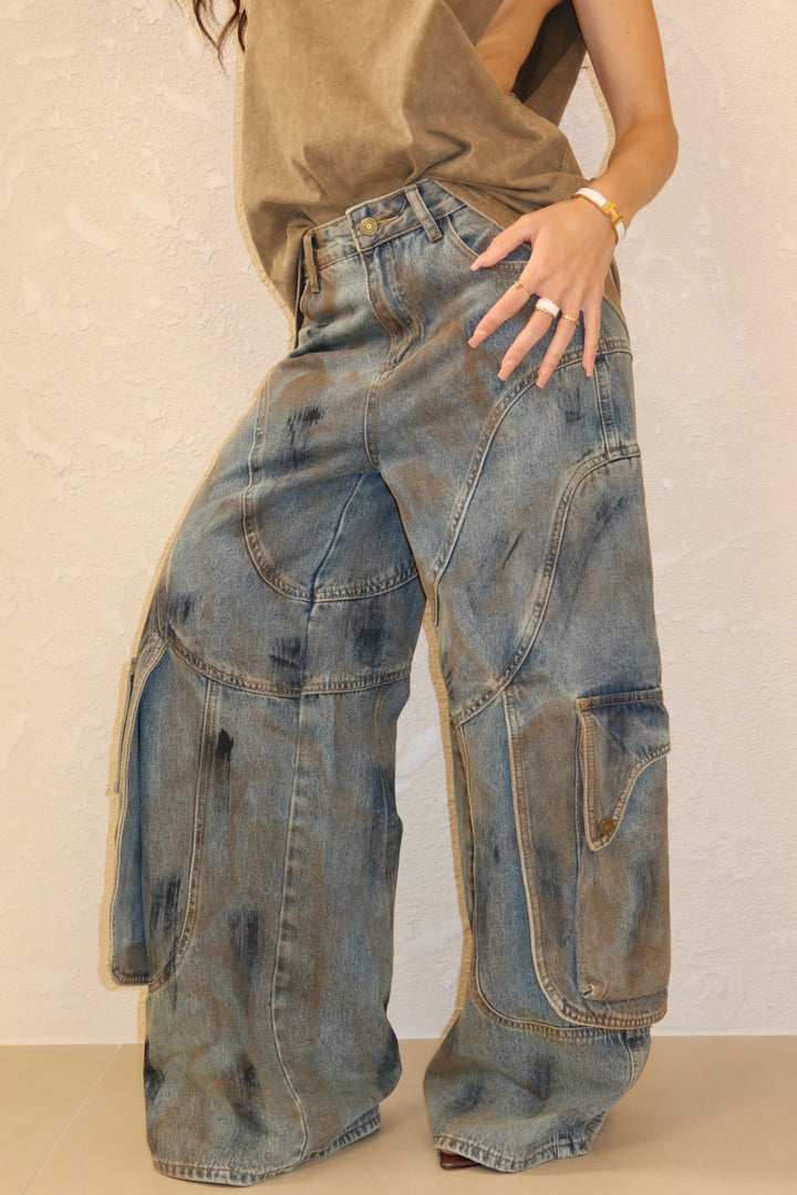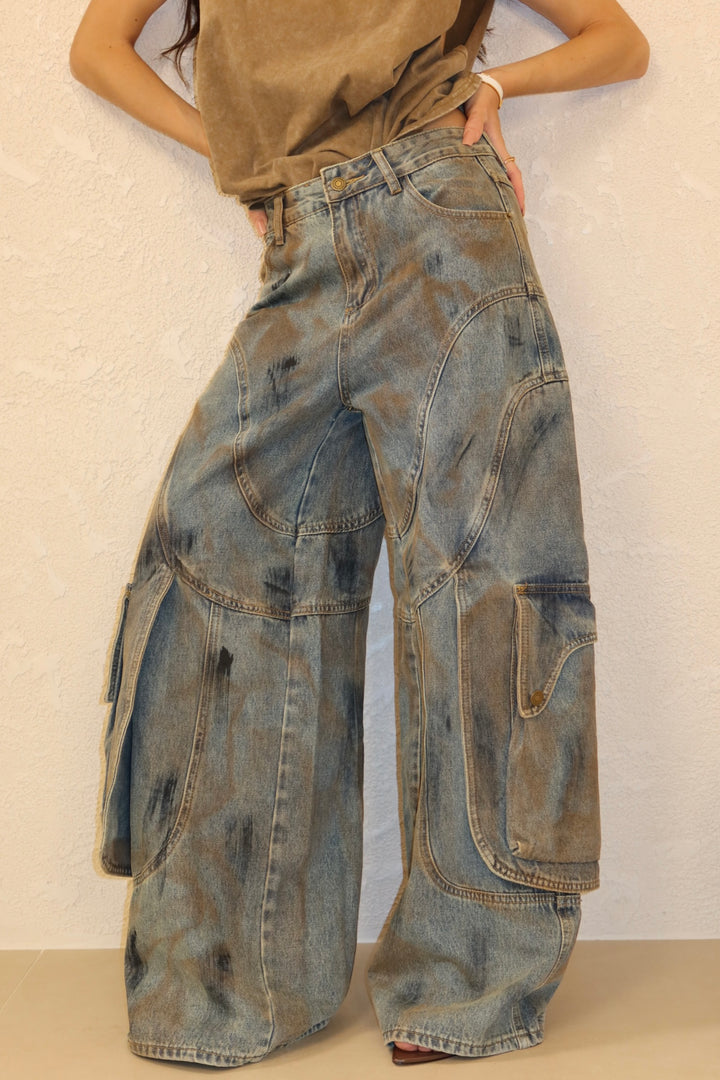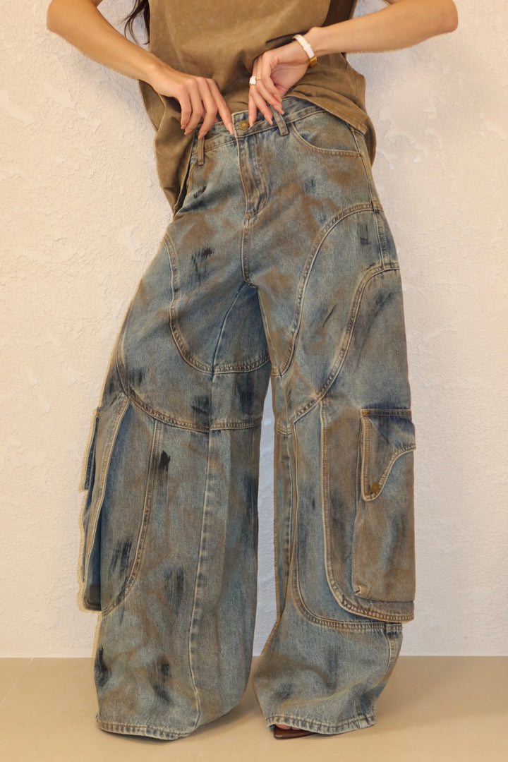 Jeans modello cargo con tasconi laterali e sfumature a contrasto. Vestibilità regolare. La modella indossa taglia S.