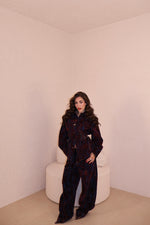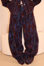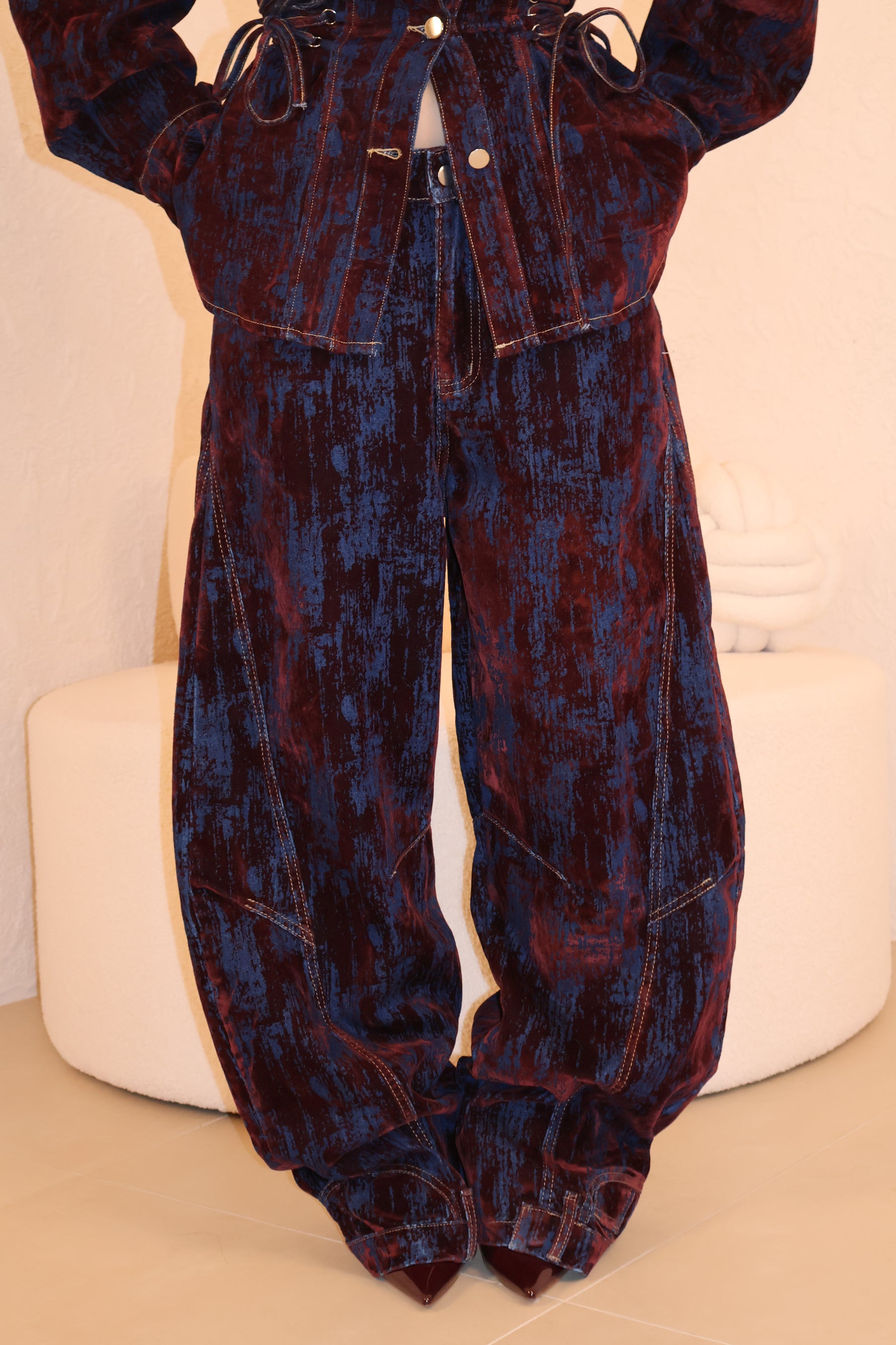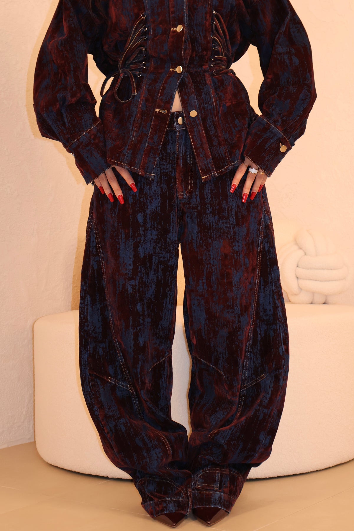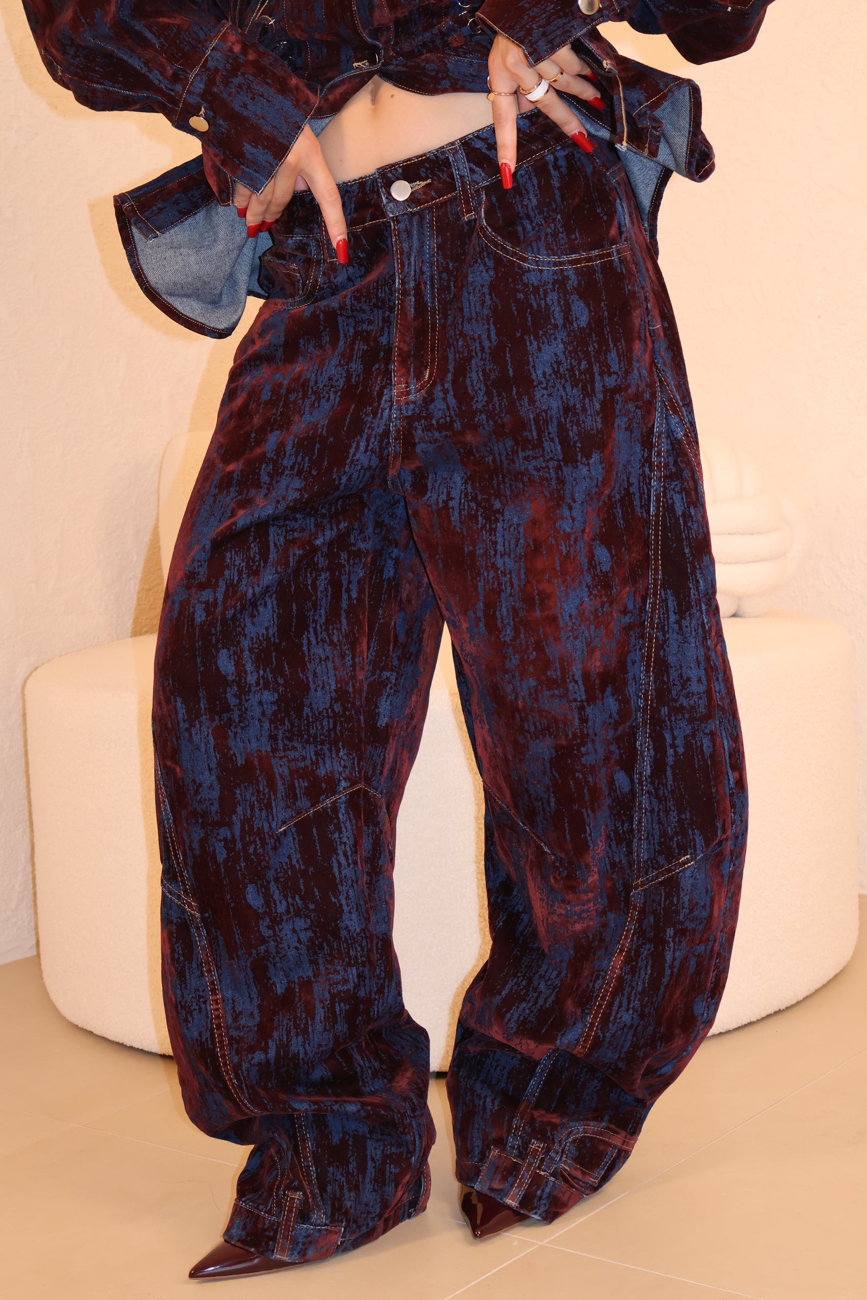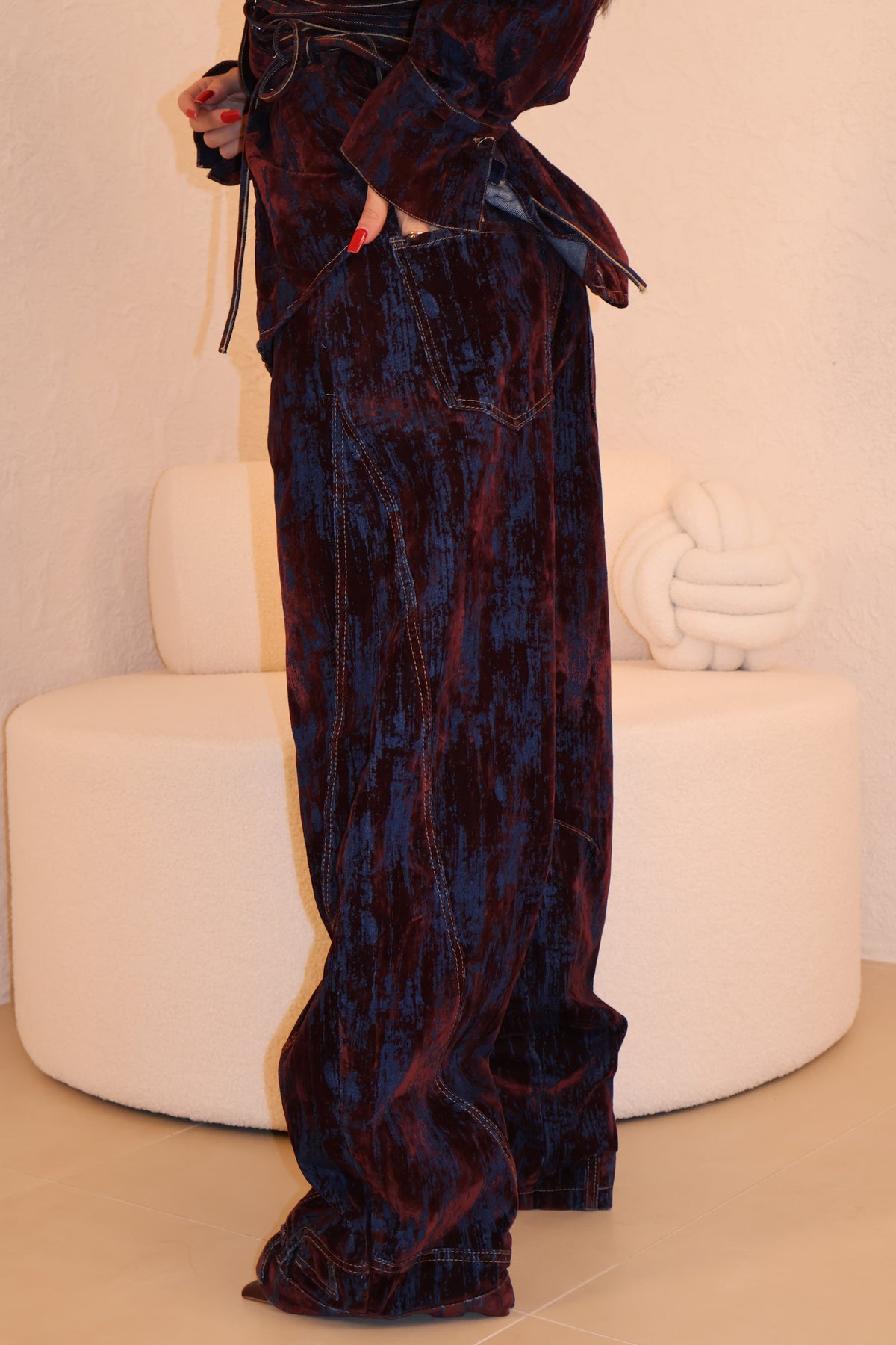 Jeans modello balloon vita bassa con sfumature interne in ciniglia a contrasto. La modella indossa taglia S.
