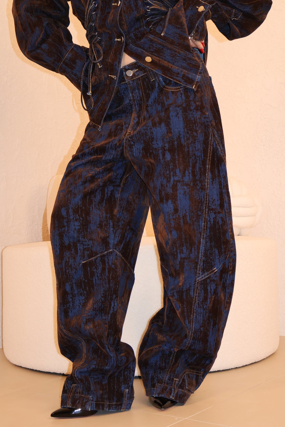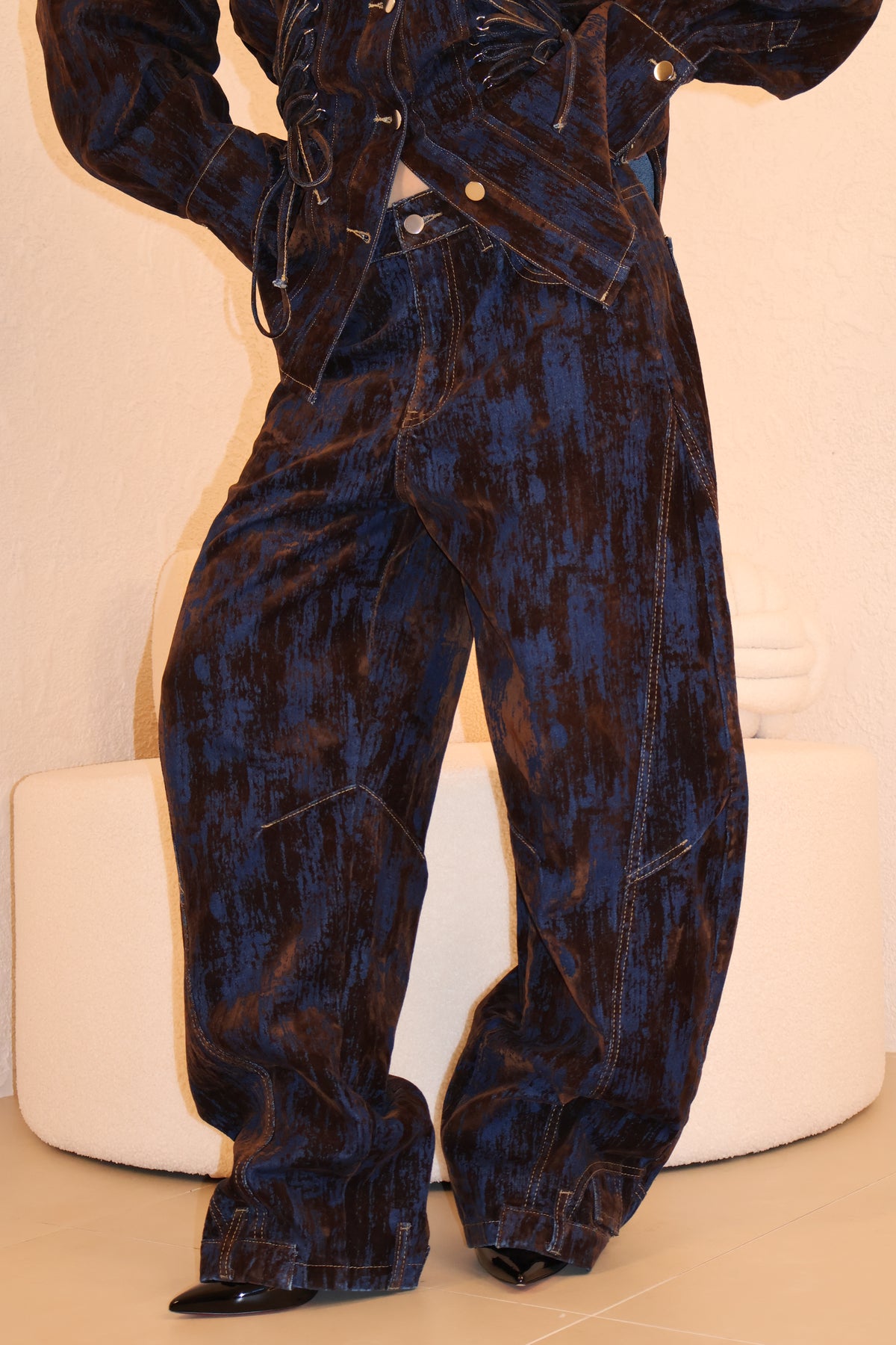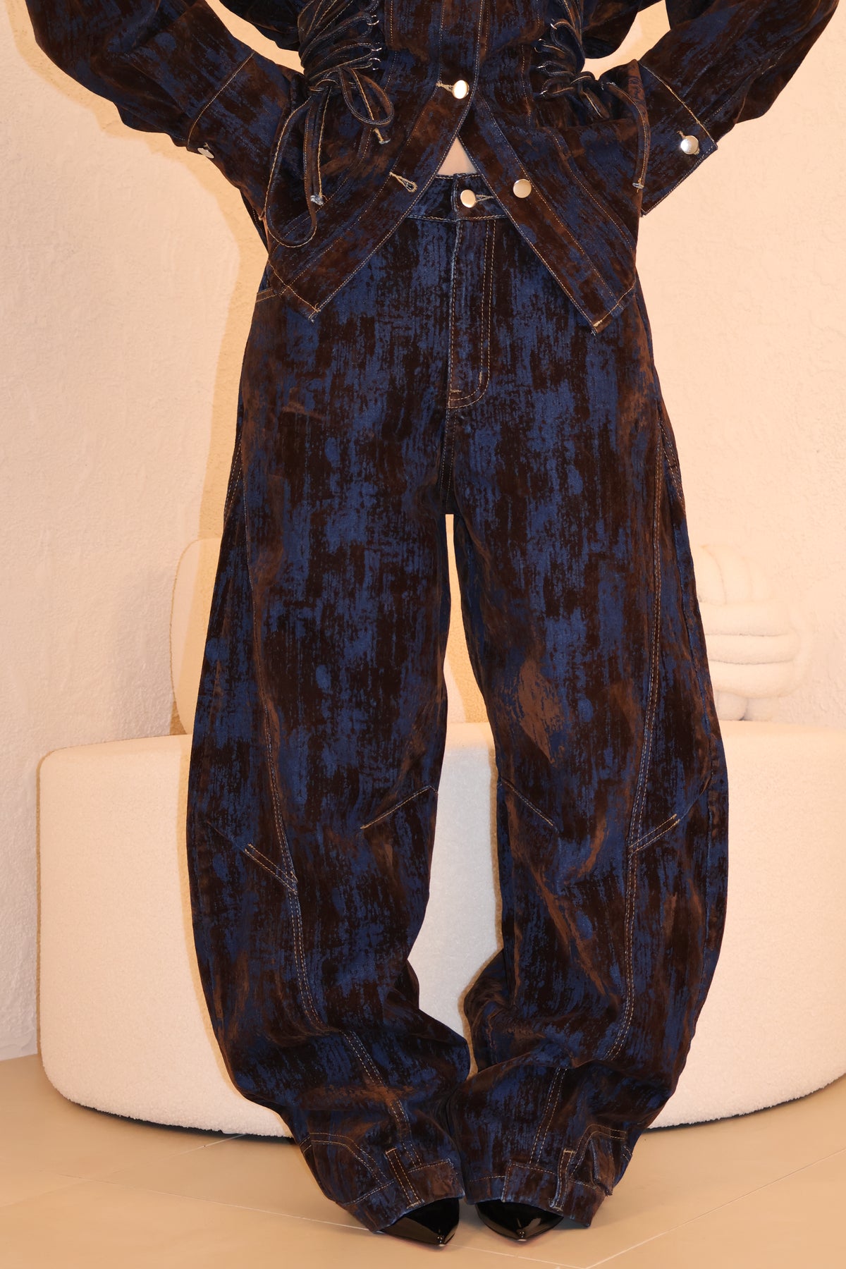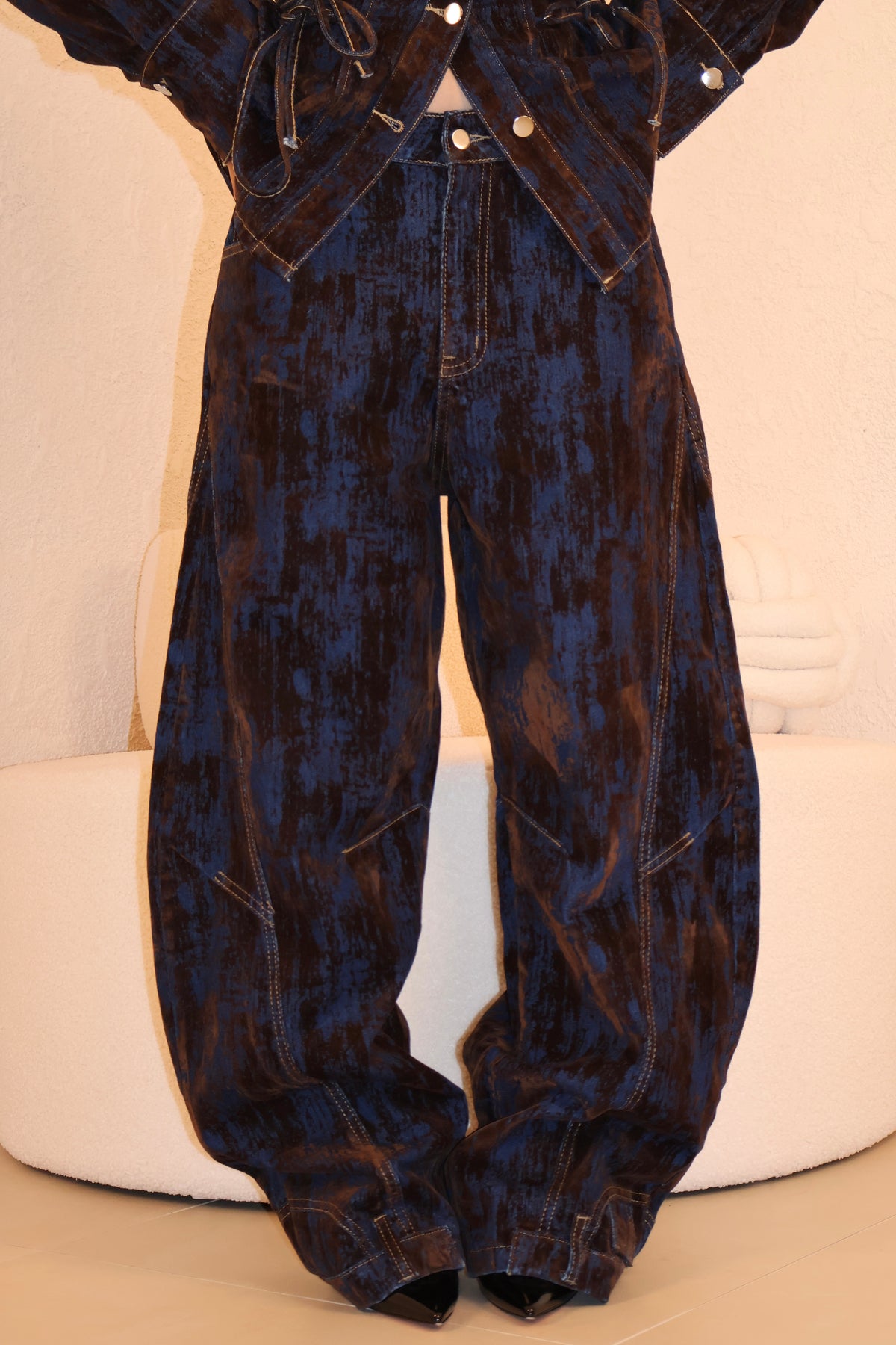 Jeans modello balloon vita bassa con sfumature interne in ciniglia a contrasto. La modella indossa taglia S.