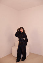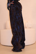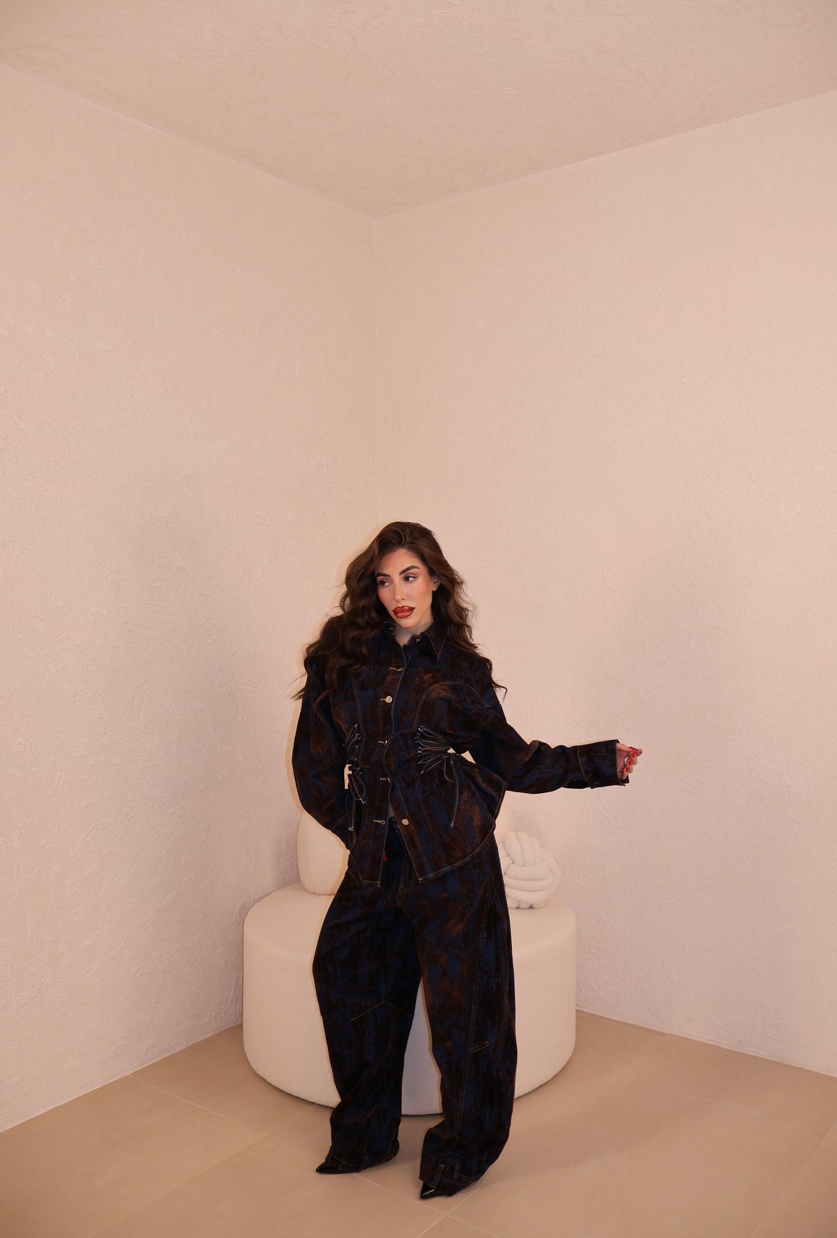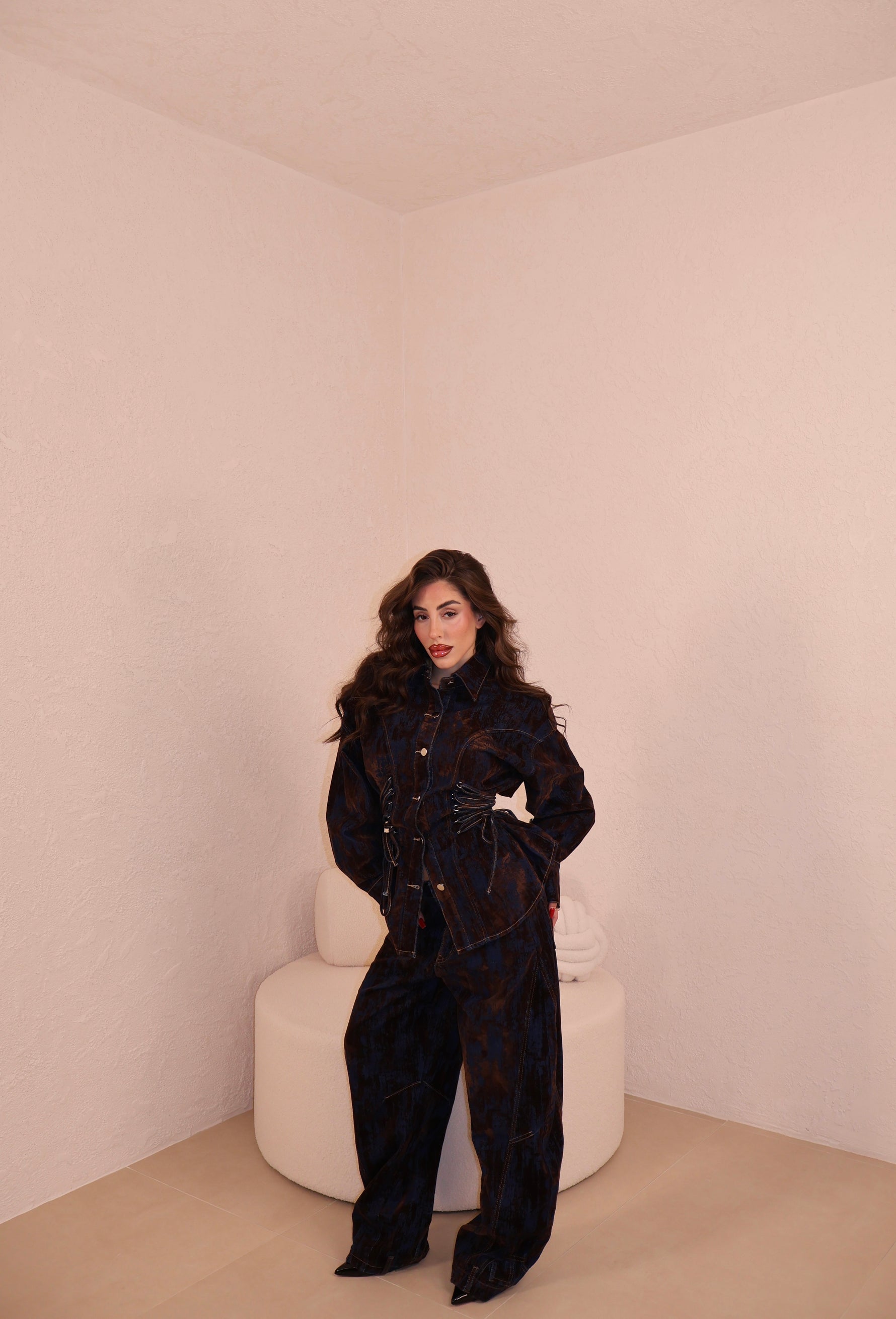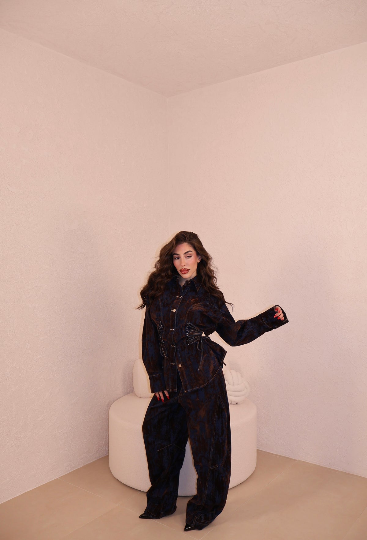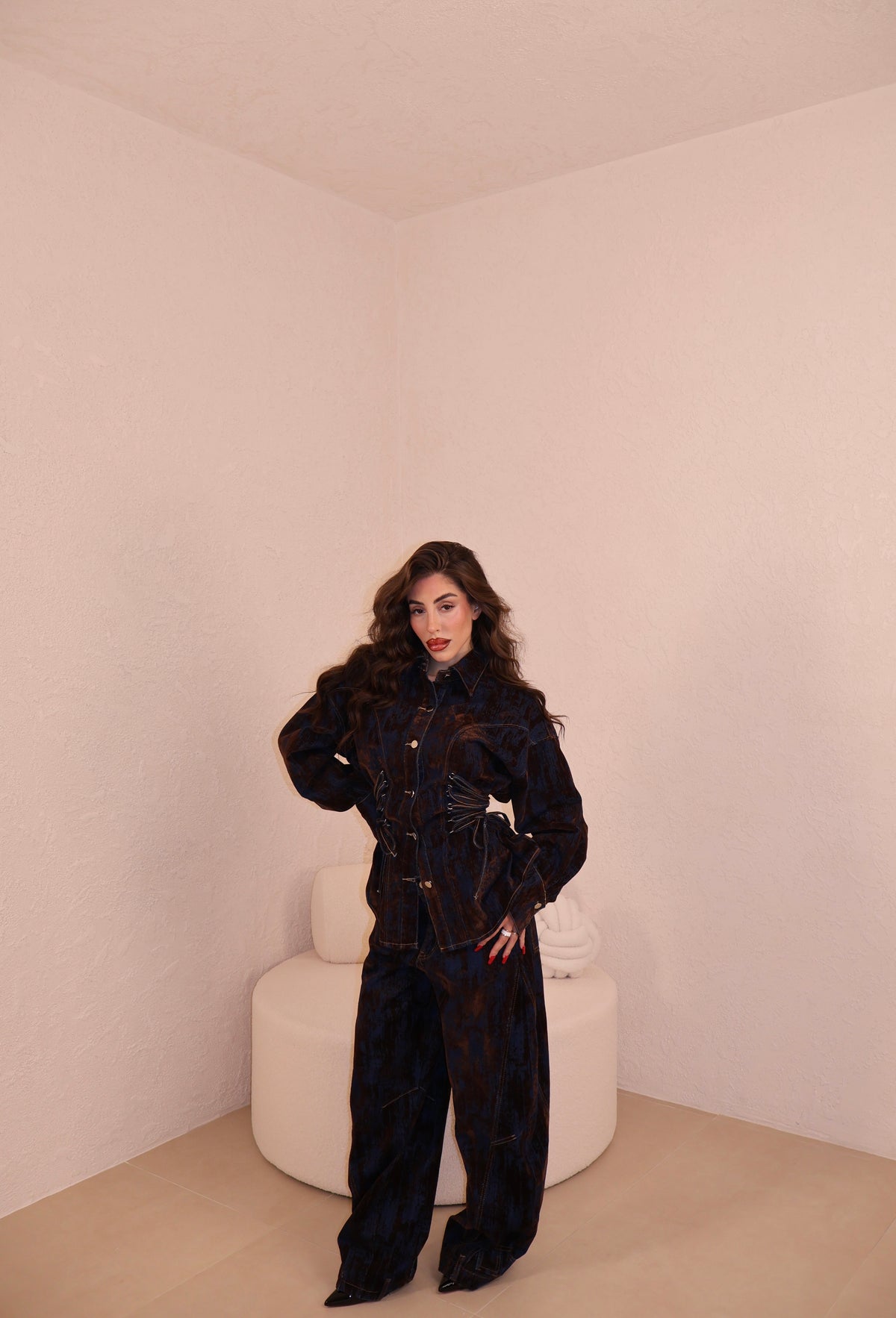 Jeans modello balloon vita bassa con sfumature interne in ciniglia a contrasto. La modella indossa taglia S.