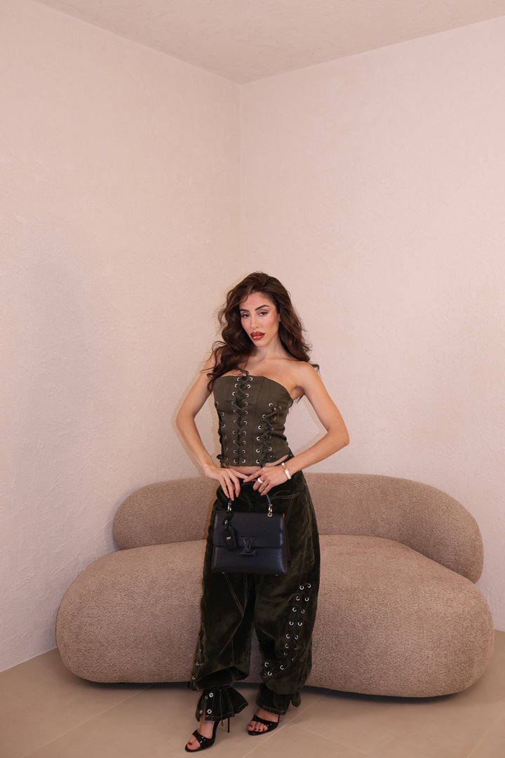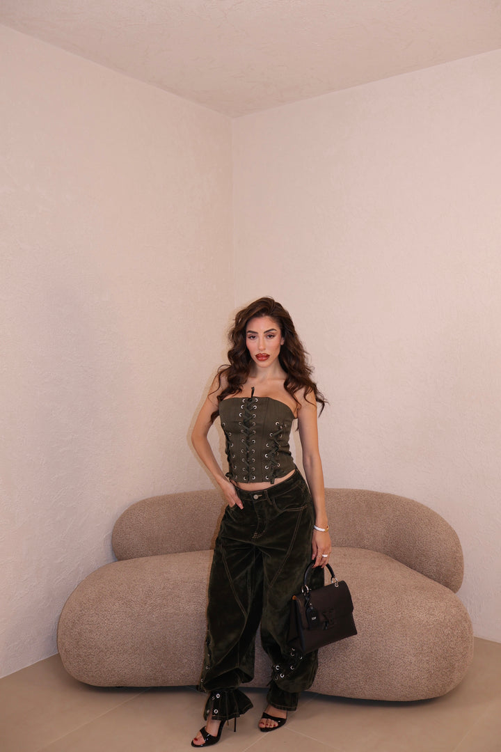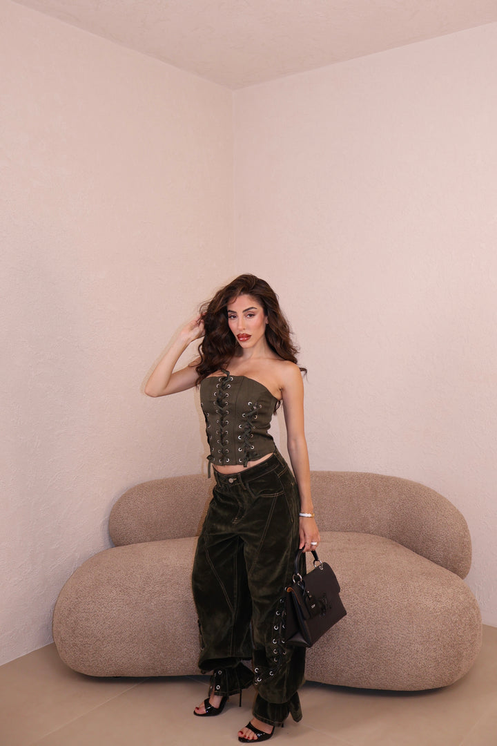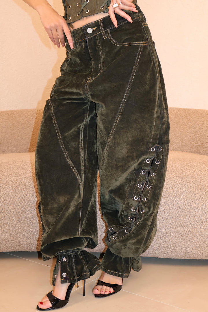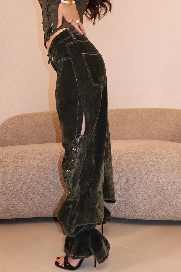 Jeans vita bassa in ciniglia con stringhe. Vestibilità regolare. La modella indossa taglia S.