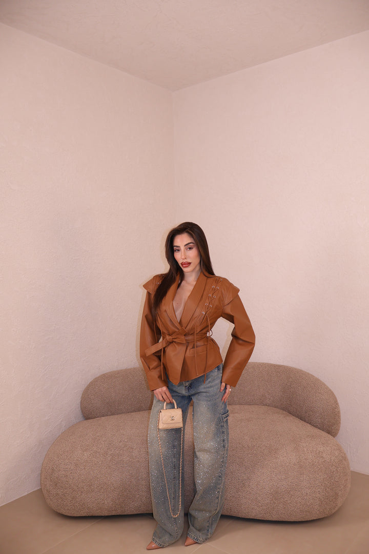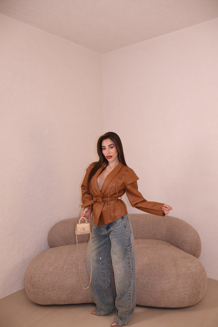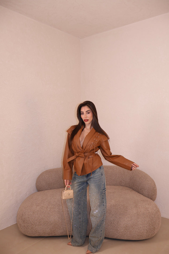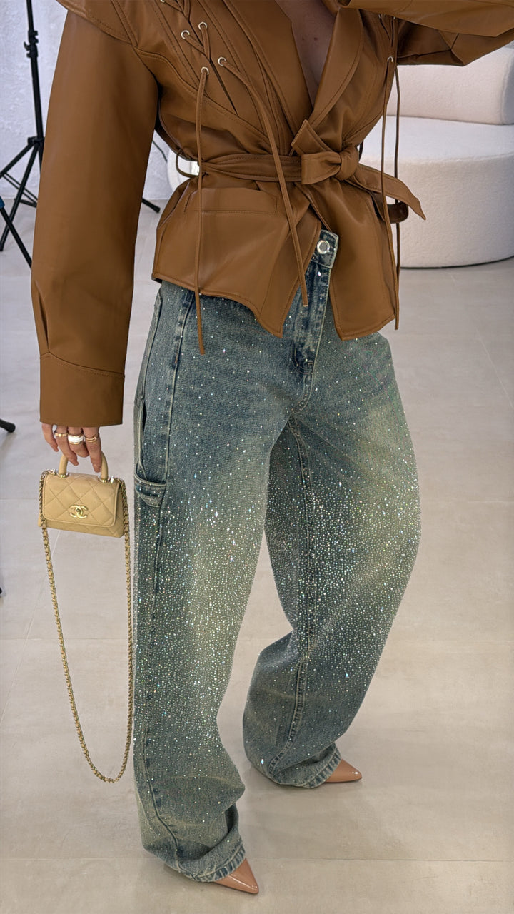 Jeans modello baggy con dettagli strass. La modella indossa taglia 36.