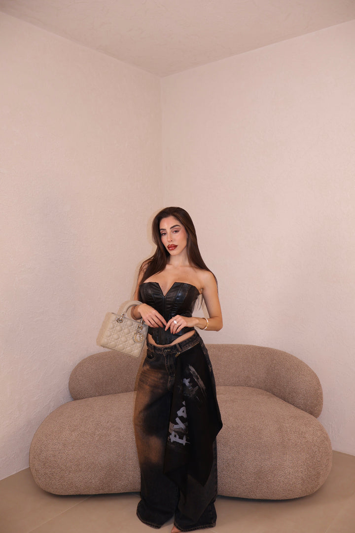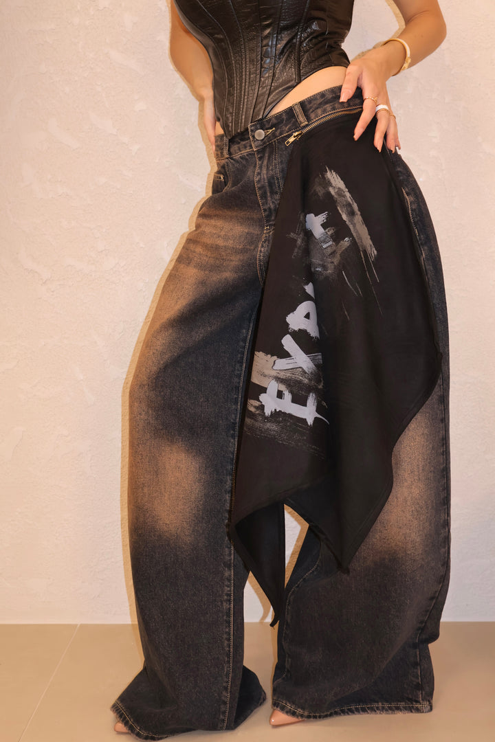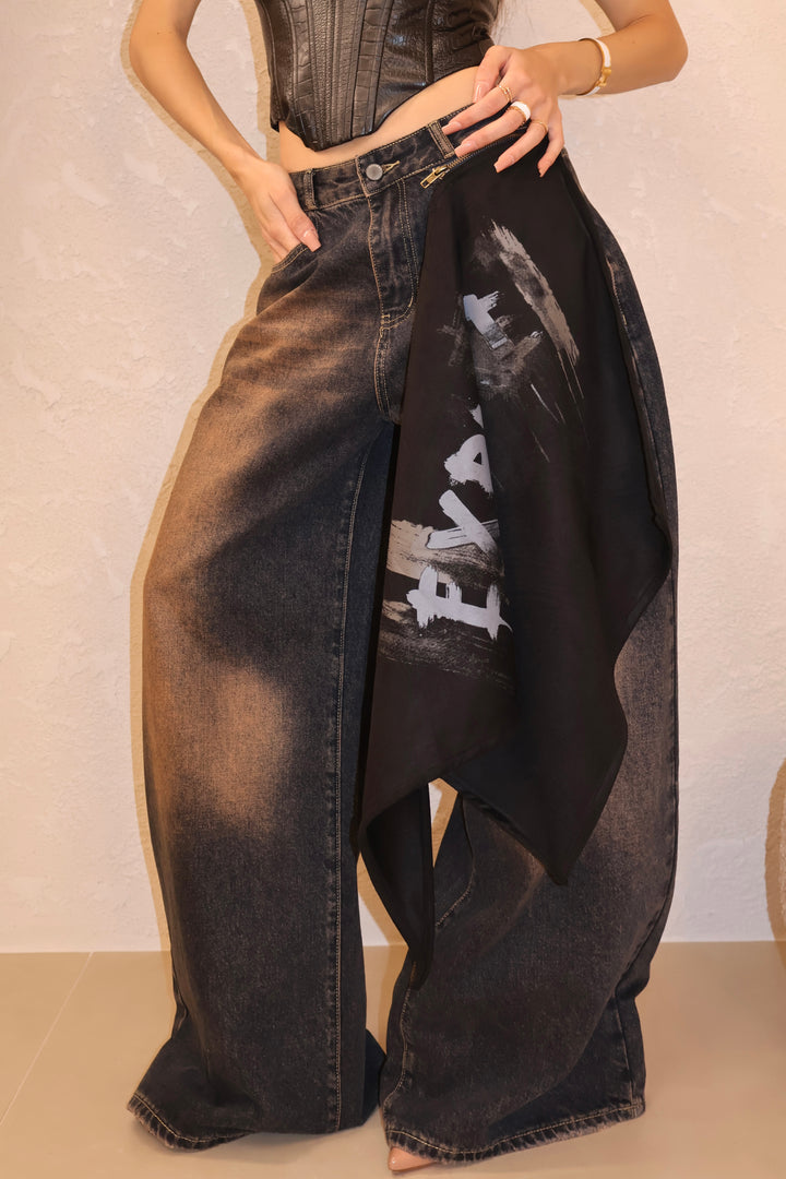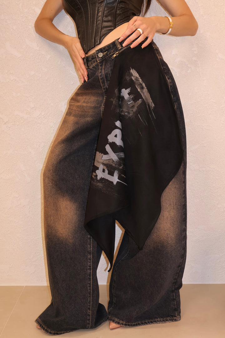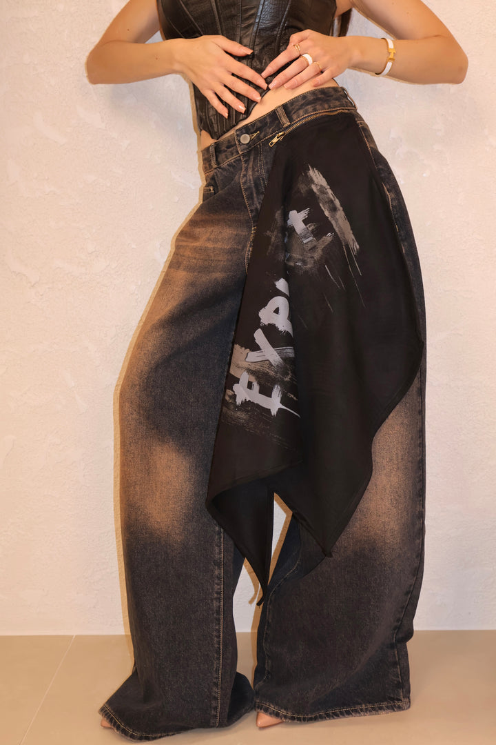 Jeans vita bassa con sfumature chiare a contrasto e dettaglio foulard con cerniera. La modella indossa taglia S.