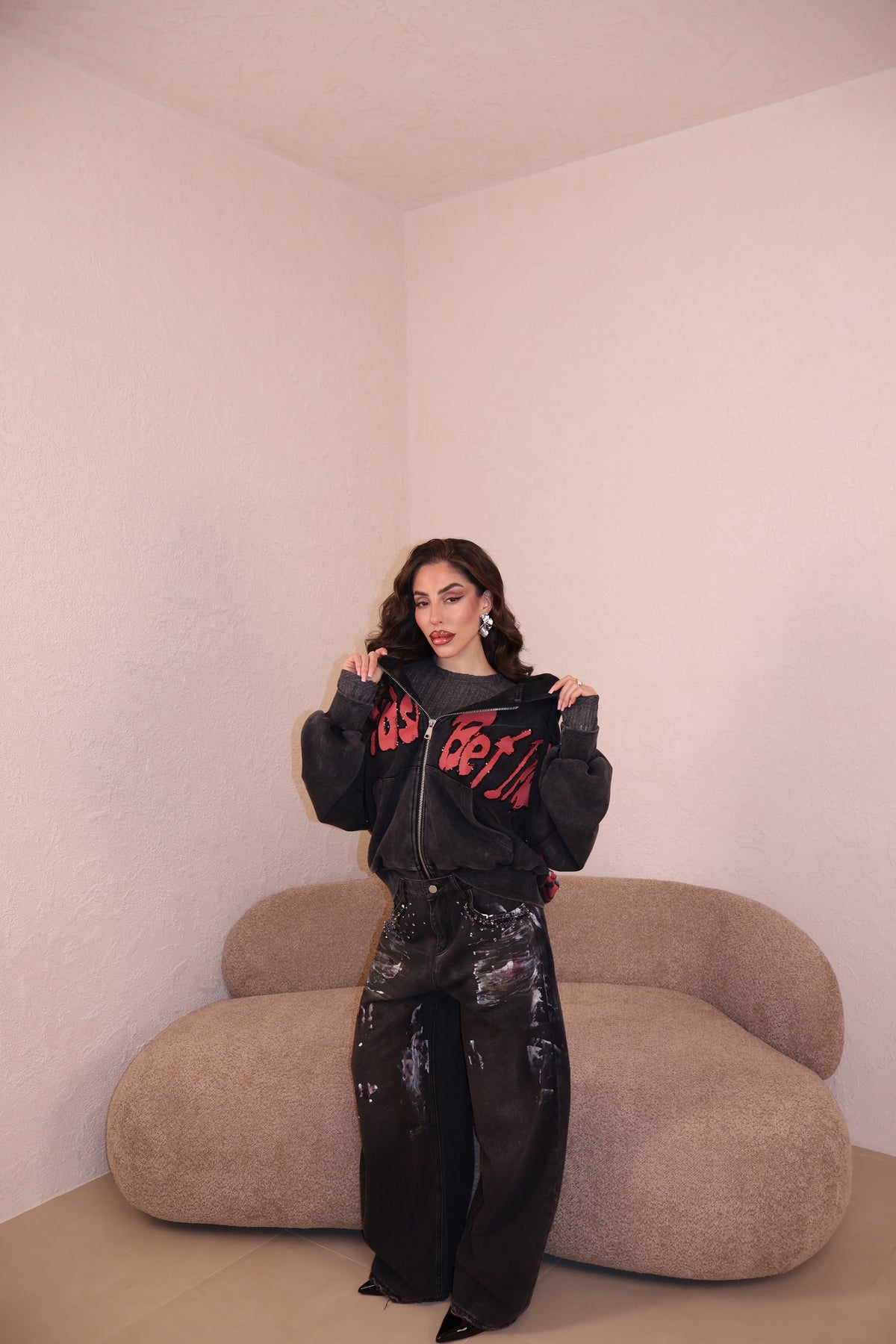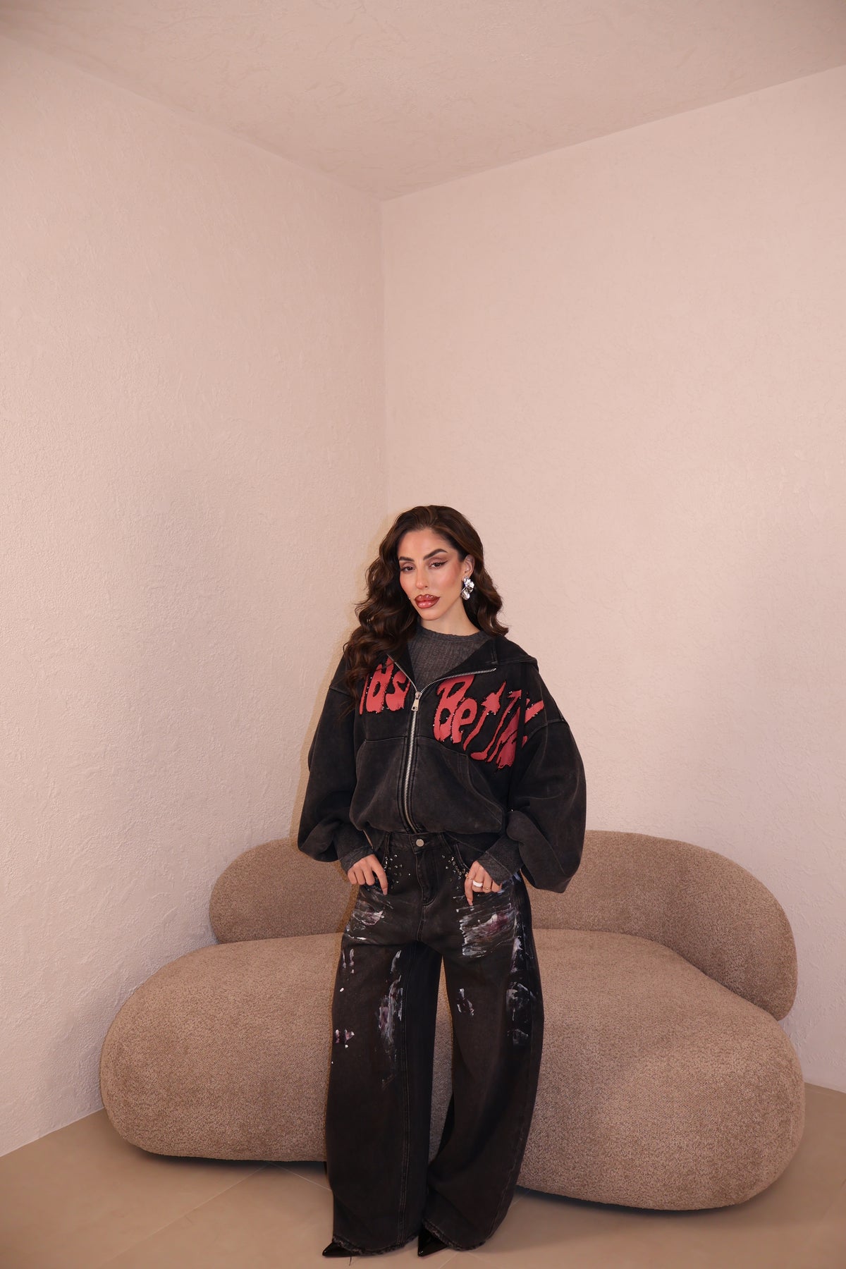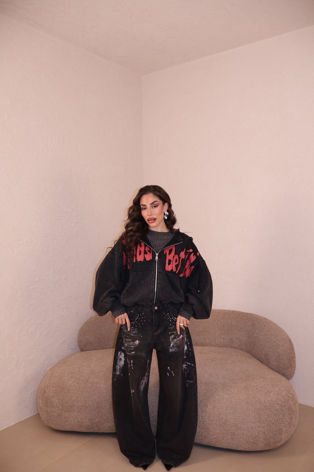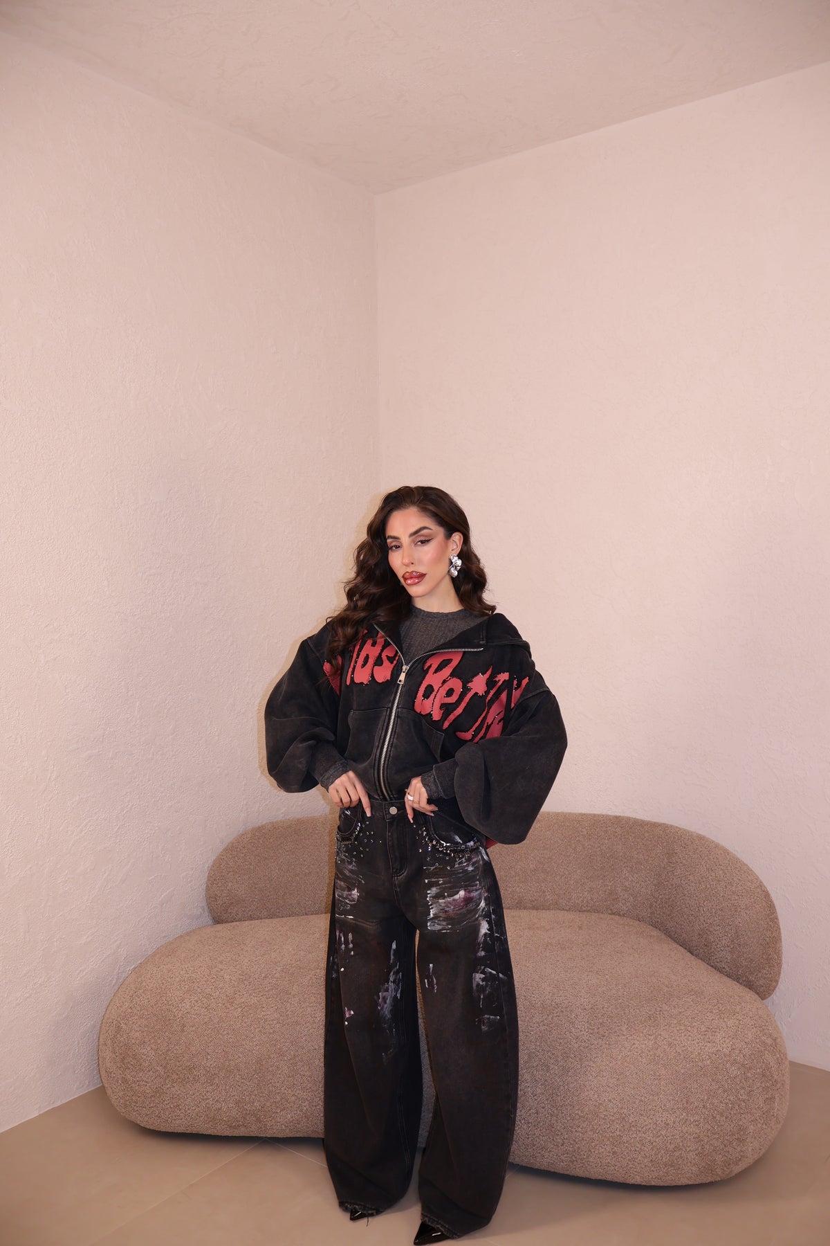 Jeans modello balloon con dettagli gioielli sulle tasche e stampe a contrasto. Vestibilità regolare. La modella indossa taglia S.