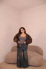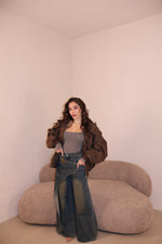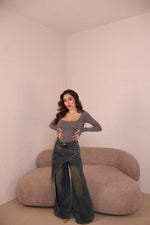 Jeans vita media gamba dritta con sfumature a contasto. Vestibilità regolare. La modella indossa taglia S.