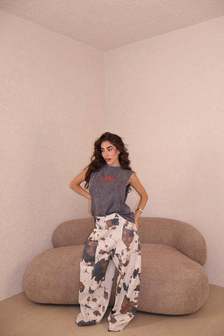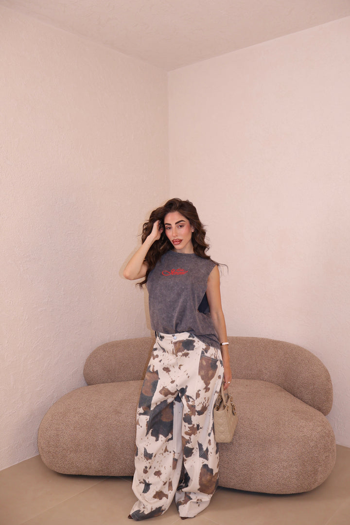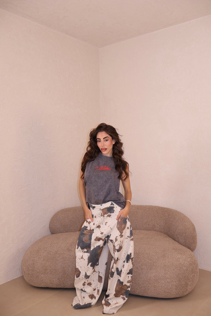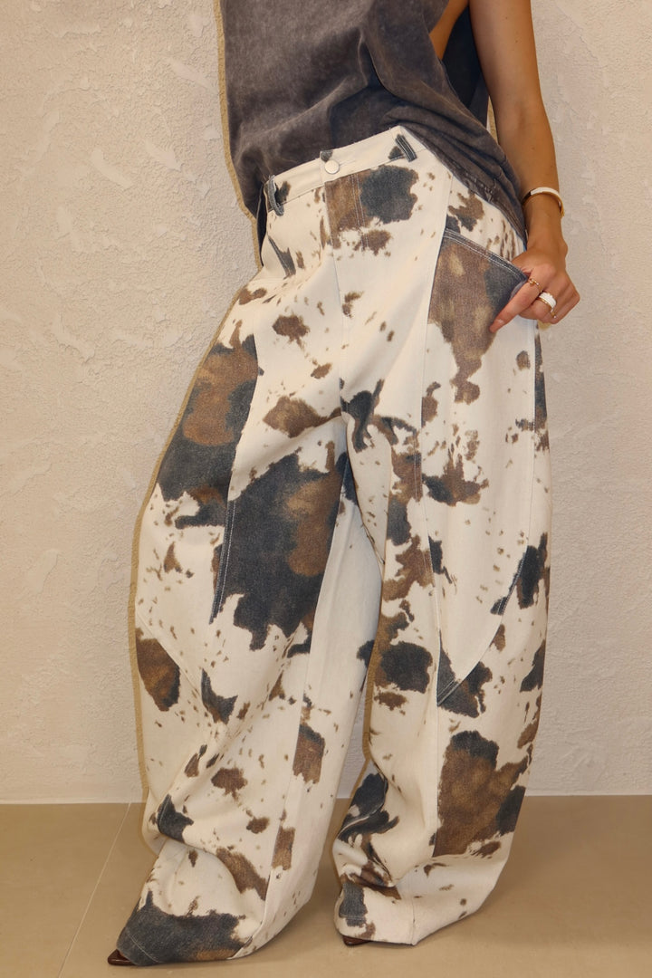 Jeans vita media modello balloon con macchie a contrasto. Vestibilità regolare. La modella indossa taglia S.
