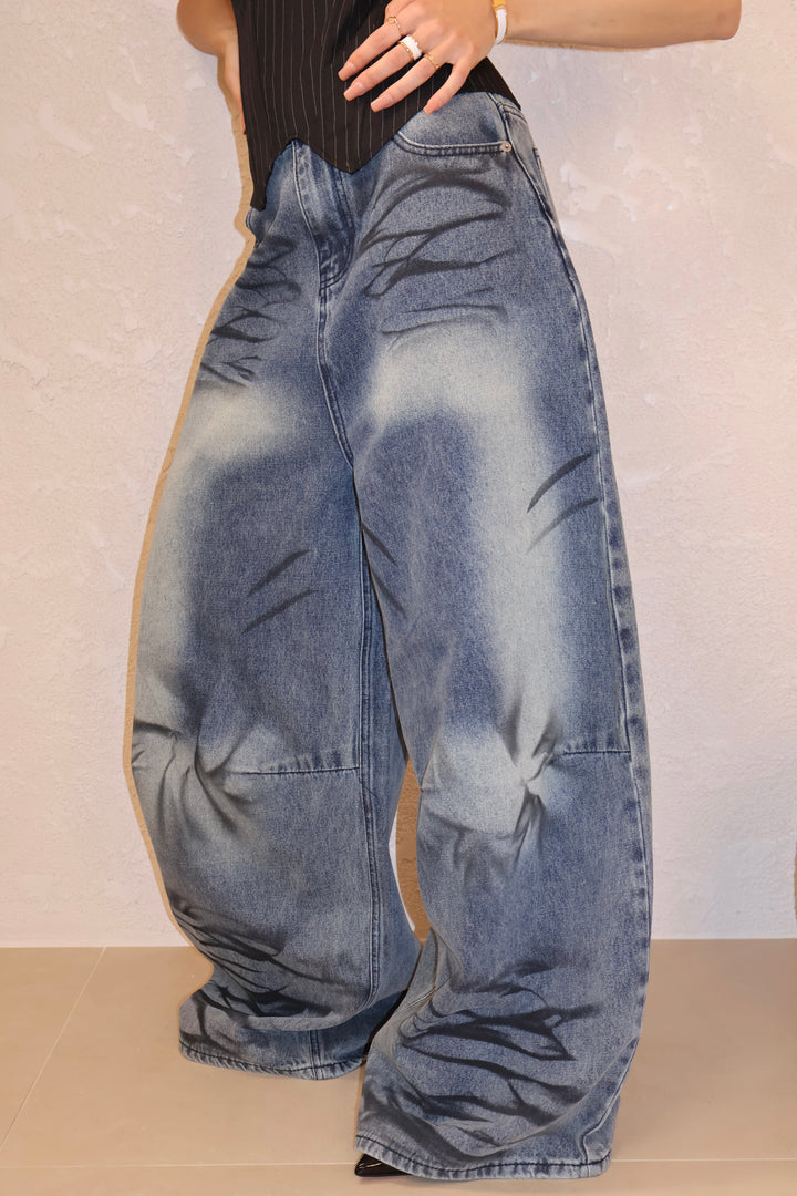Jeans modello balloon con sfumature a contrasto in nero. La modella indossa taglia S.