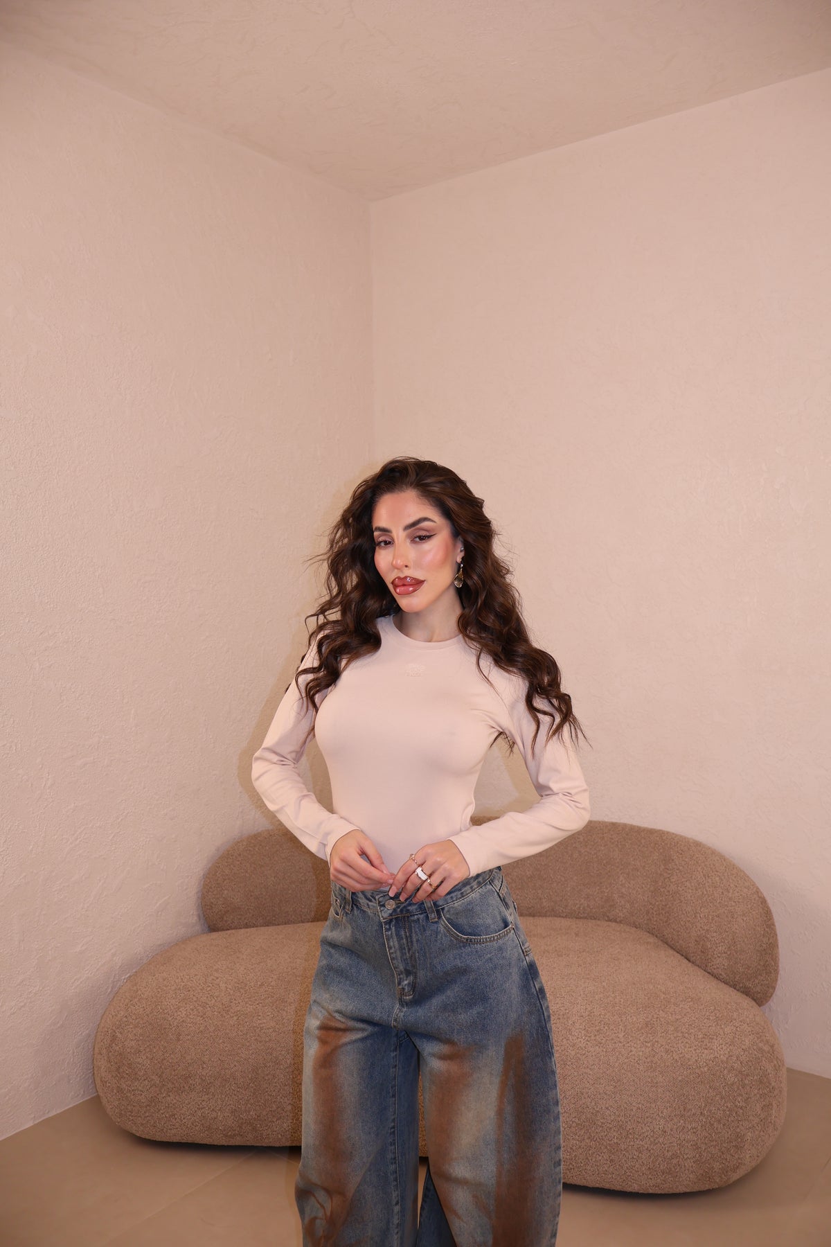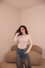 Maglia in cotone caldo con dettaglio simbolo frontale. La modella indossa taglia S.