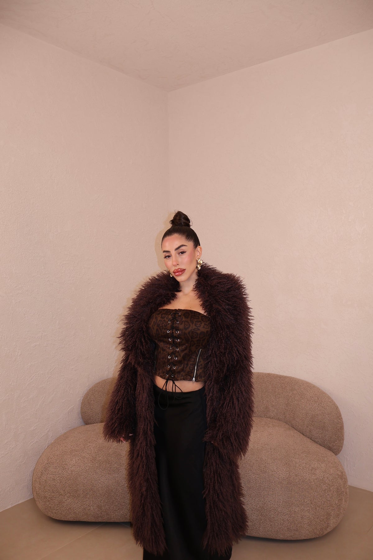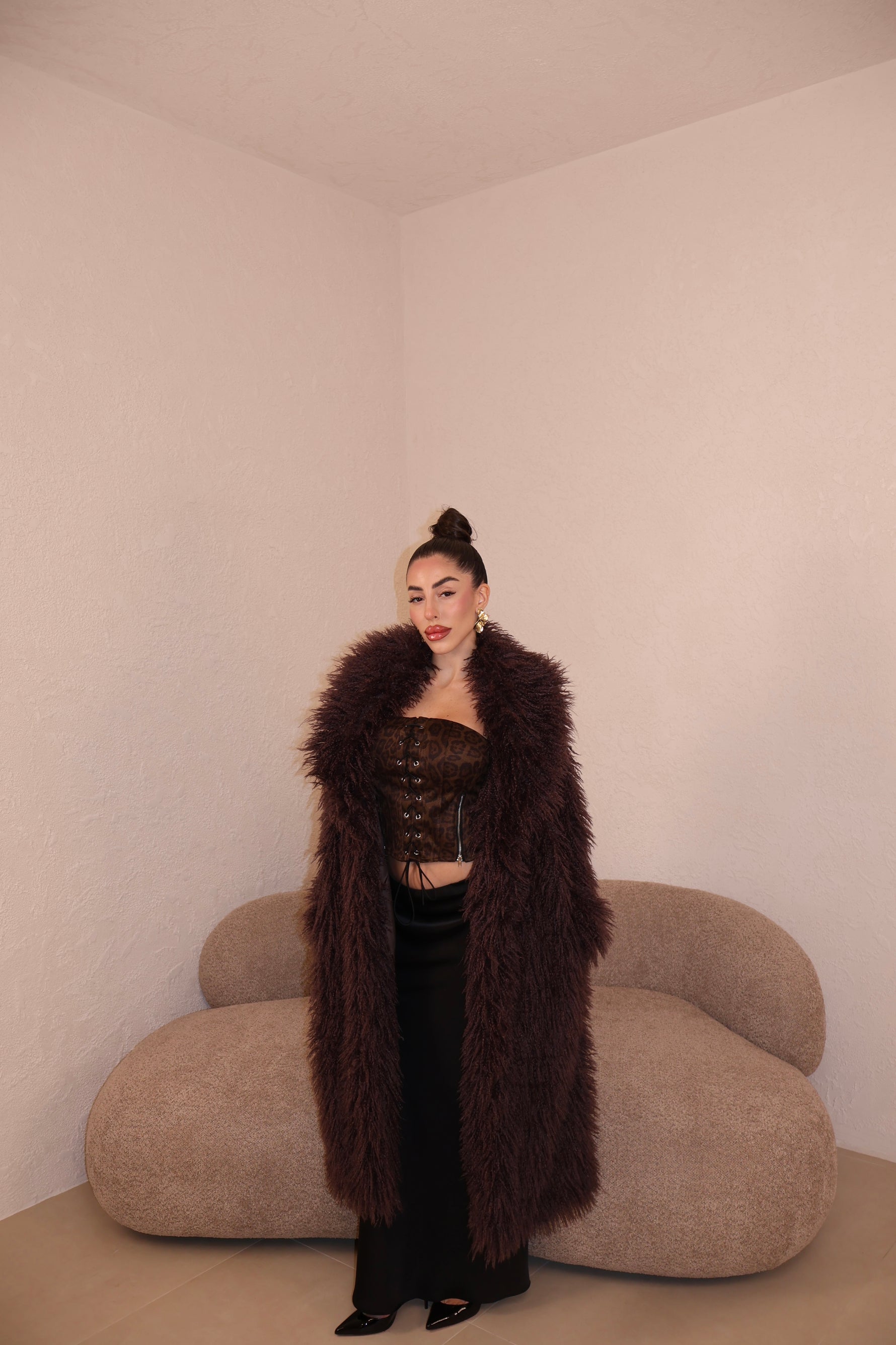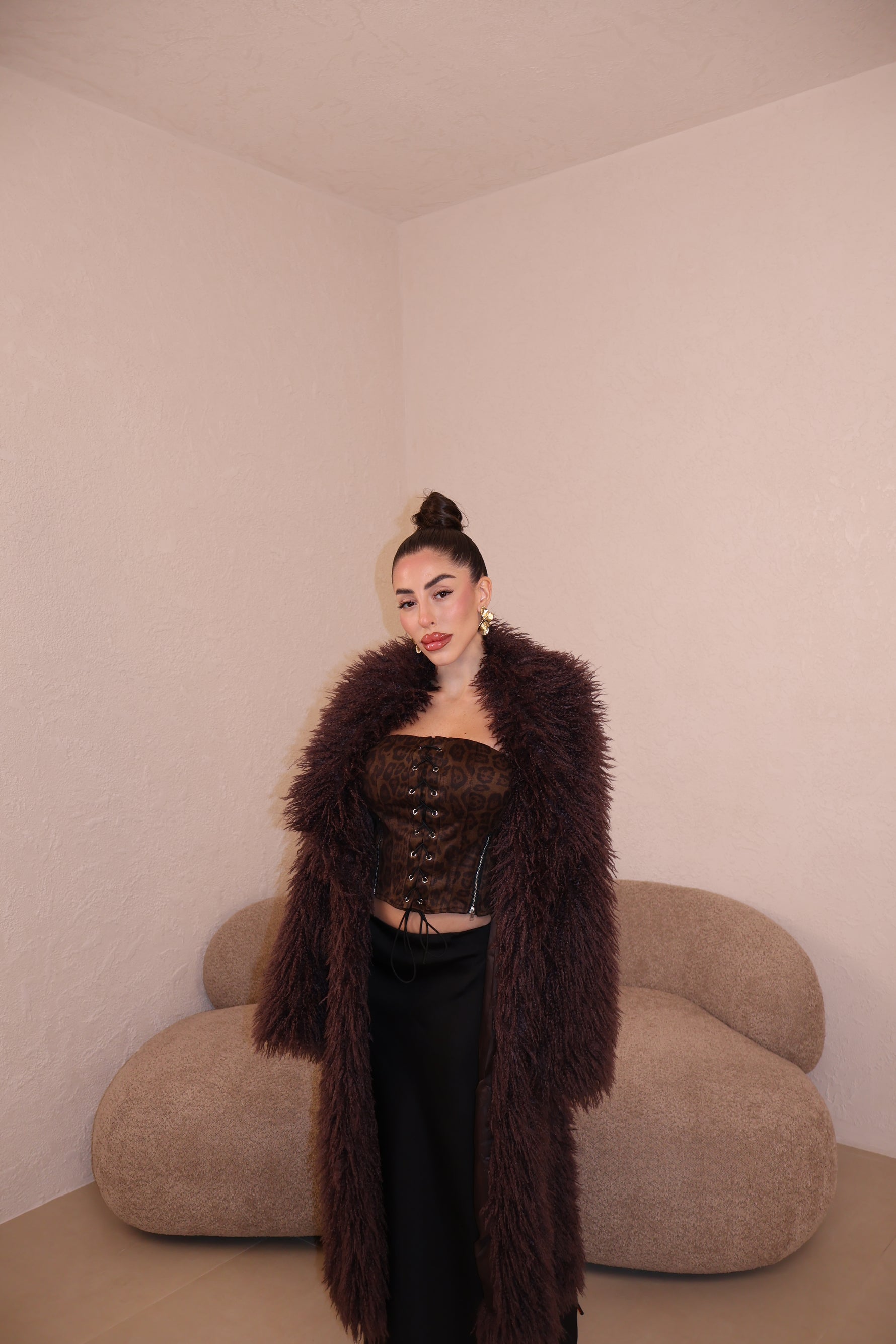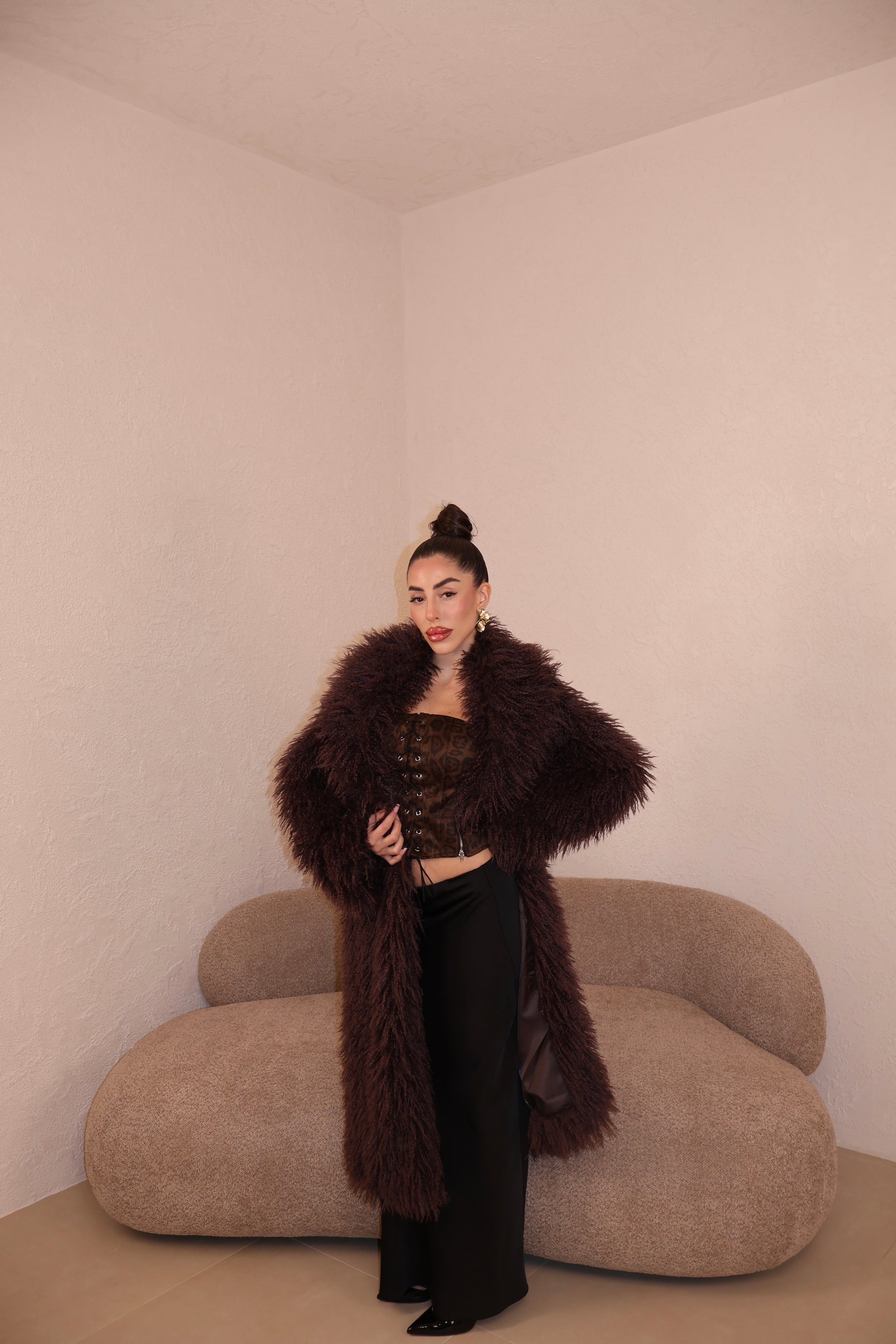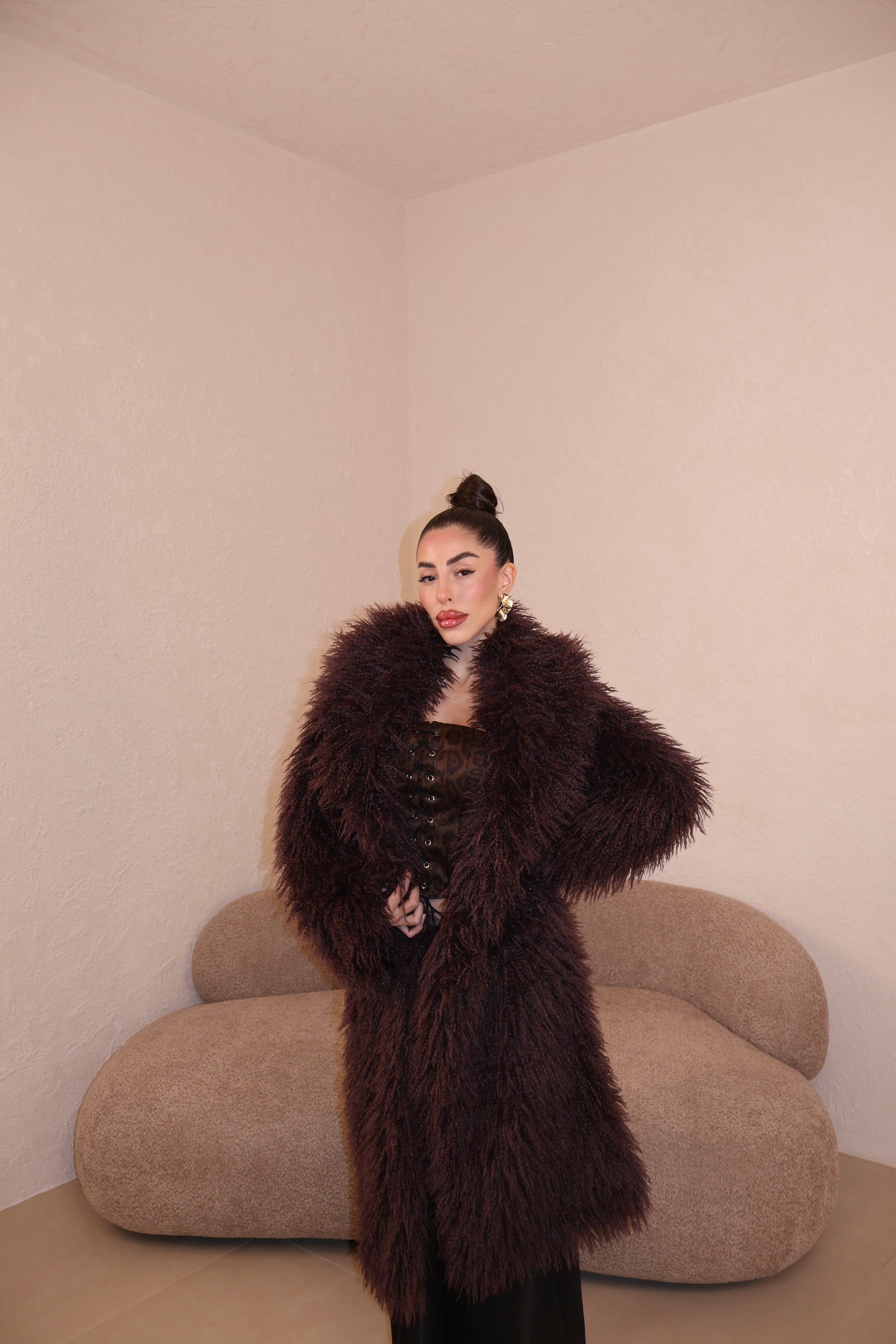 Pelliccia lunga modello mongolia con tasche e ganci frontali. Vestibilità over. La modella indossa taglia S.