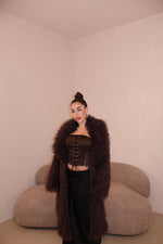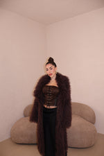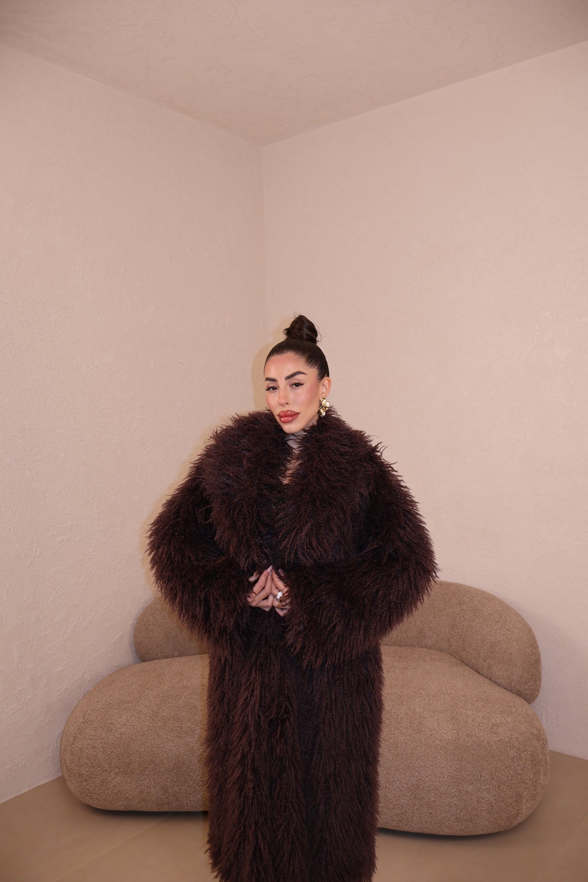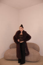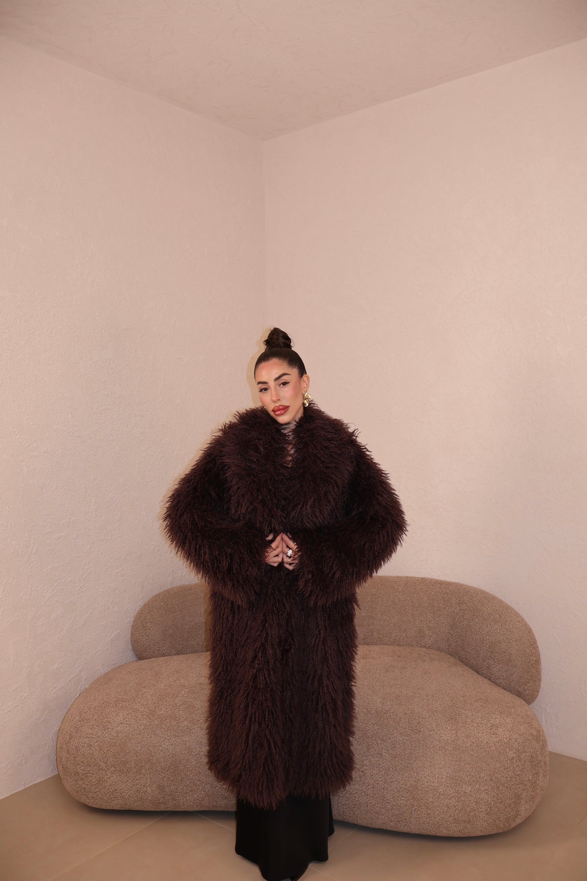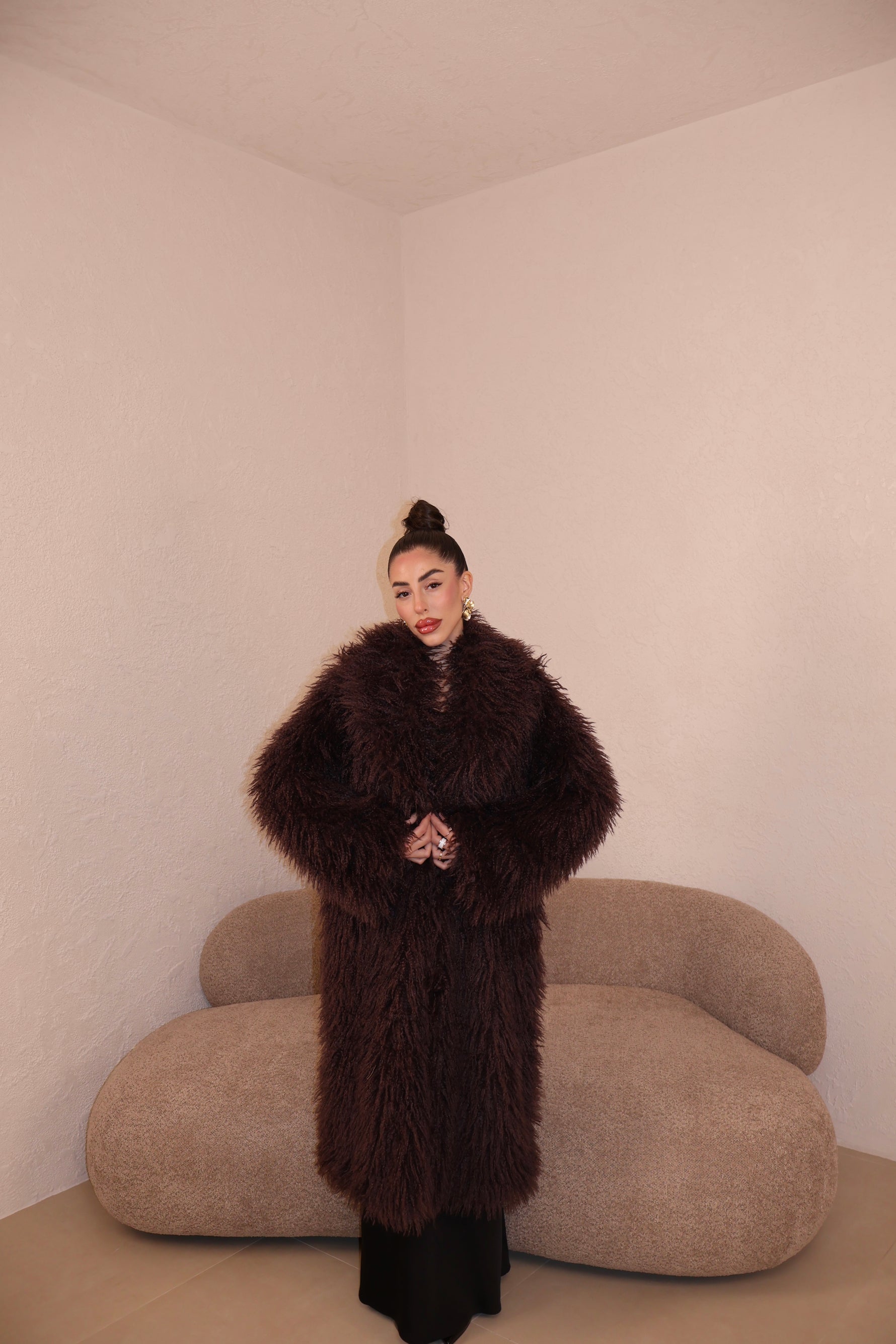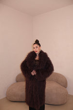 Prezzo unitario / perPelliccia lunga modello mongolia con tasche e ganci frontali. Vestibilità over. La modella indossa taglia S.