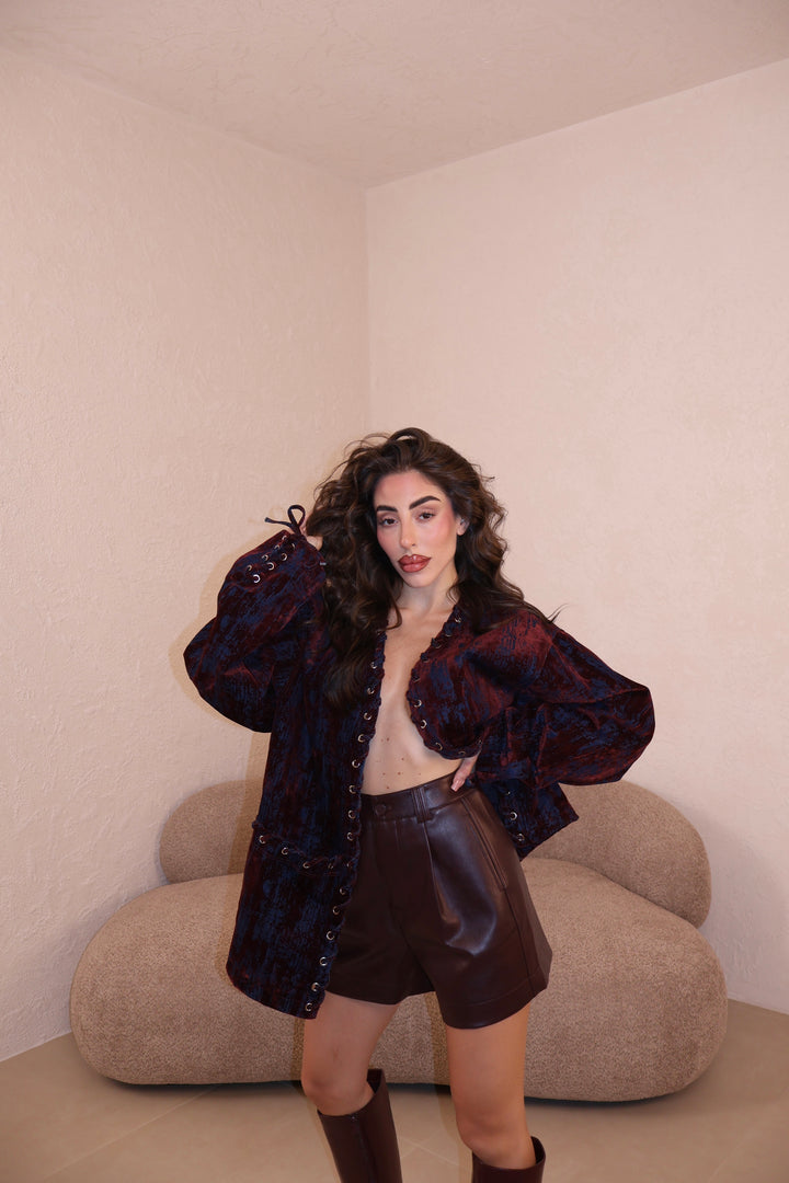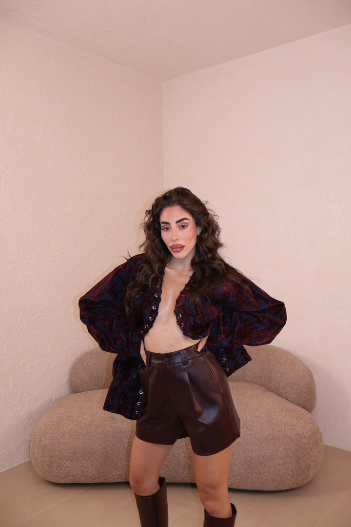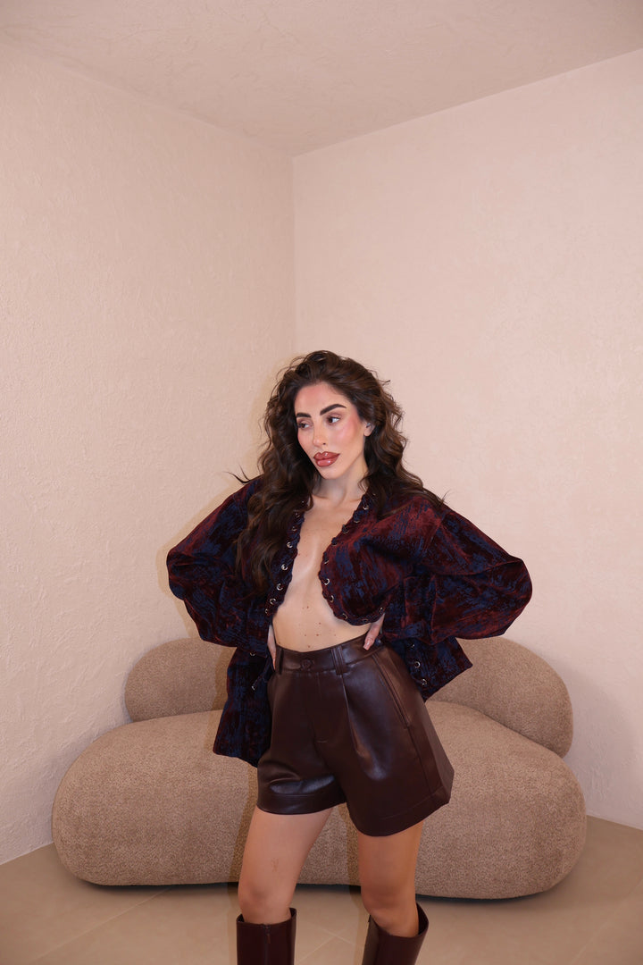 Shorts in similpelle vita alta con bottone. La modella indossa taglia XS.