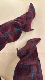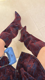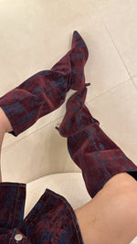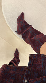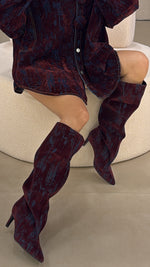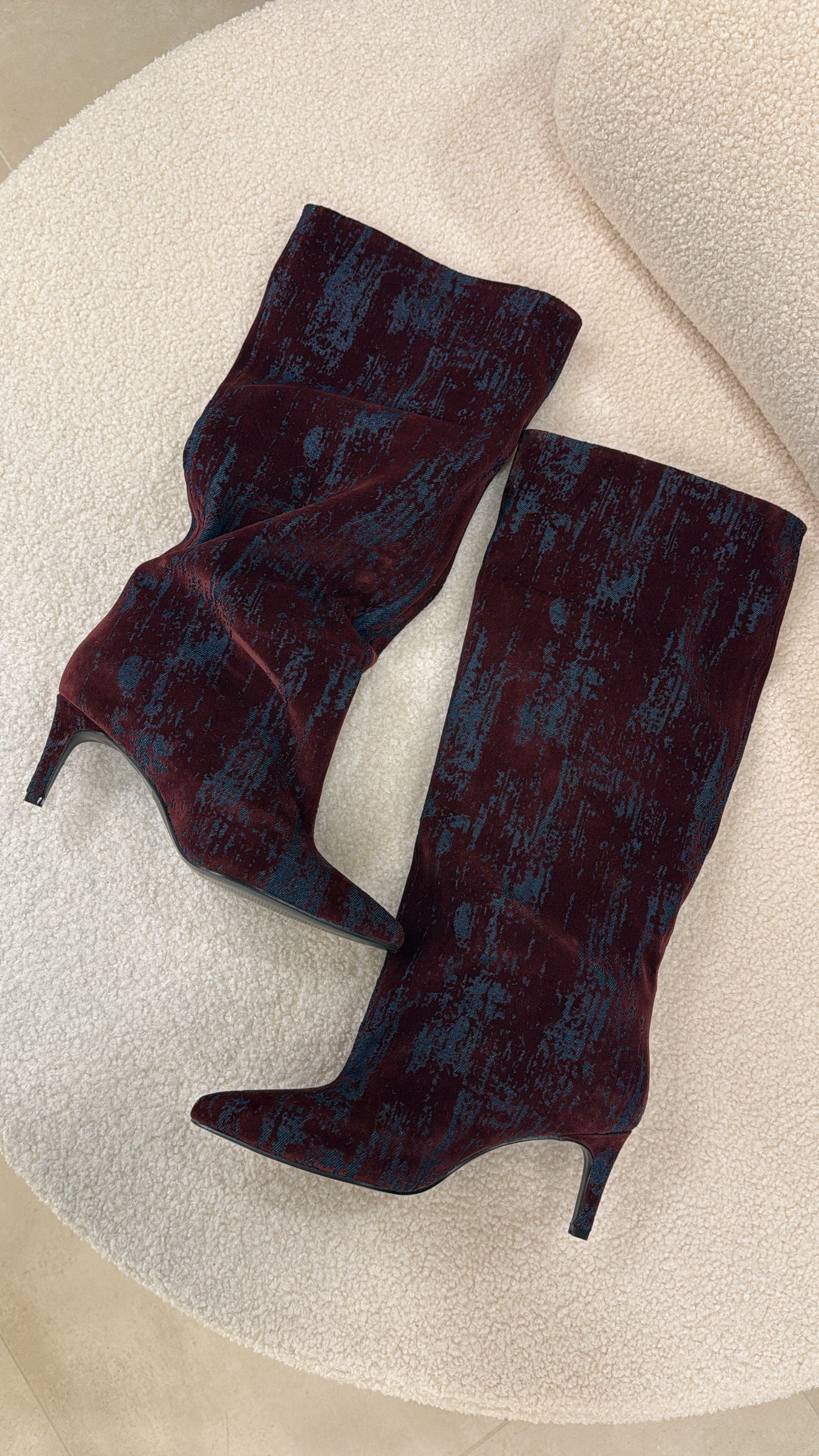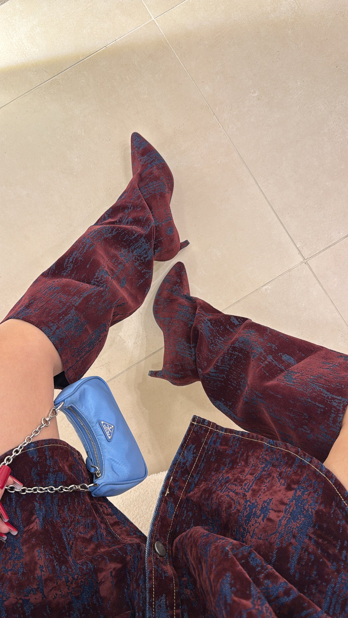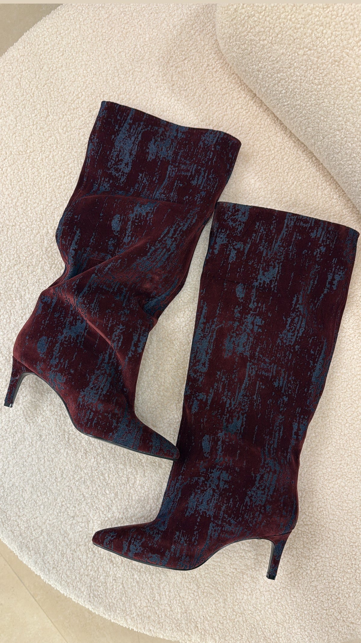 Stivali in tessuto denim con sfumature in ciniglia a contrasto. Gambale morbido e tacco medio a punta. Calzata regolare.
