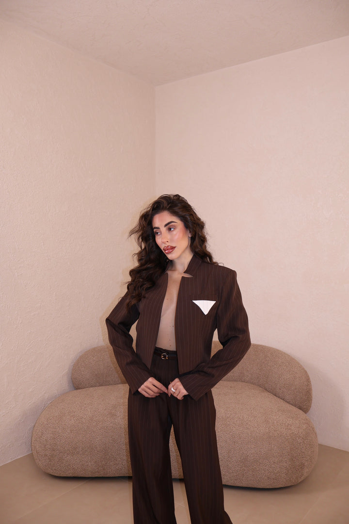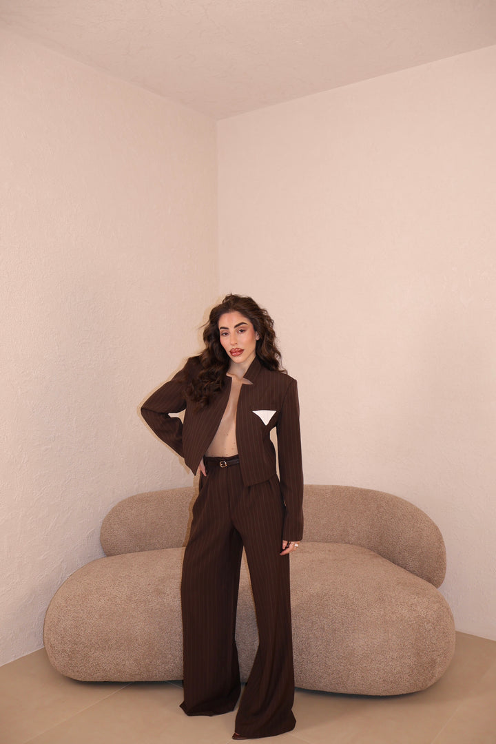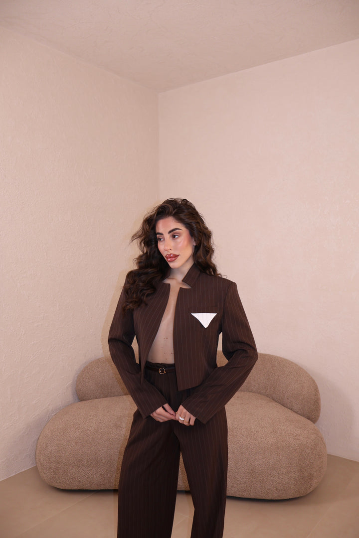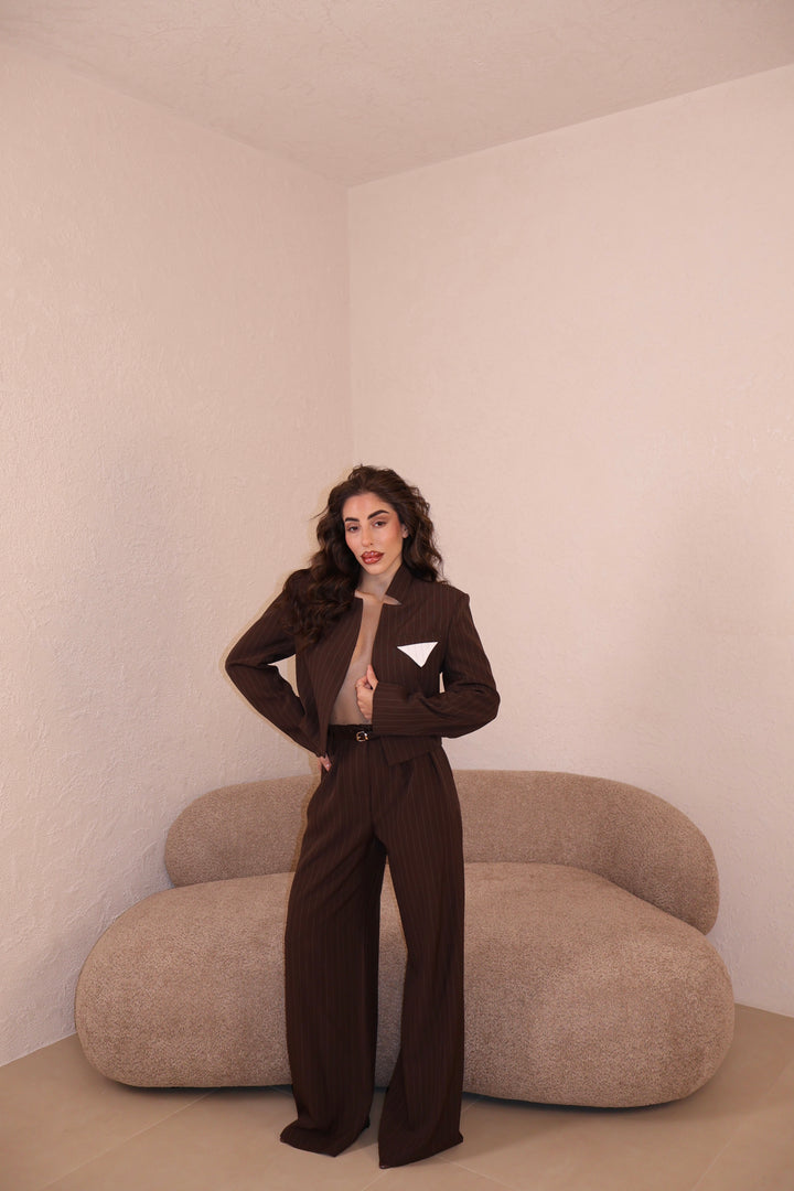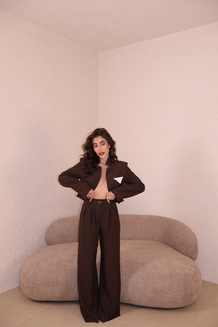 Tailleur composto da pantalone con cintura inclusa ed elastico sul retro, giacca crop con taschino. Taglia unica.