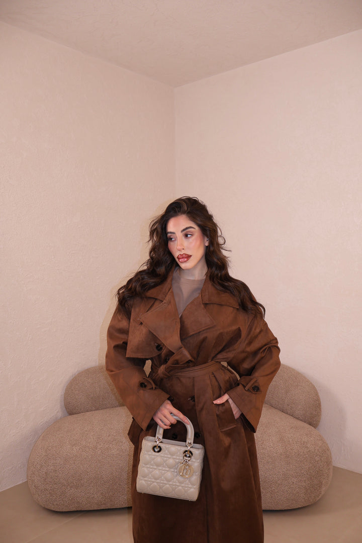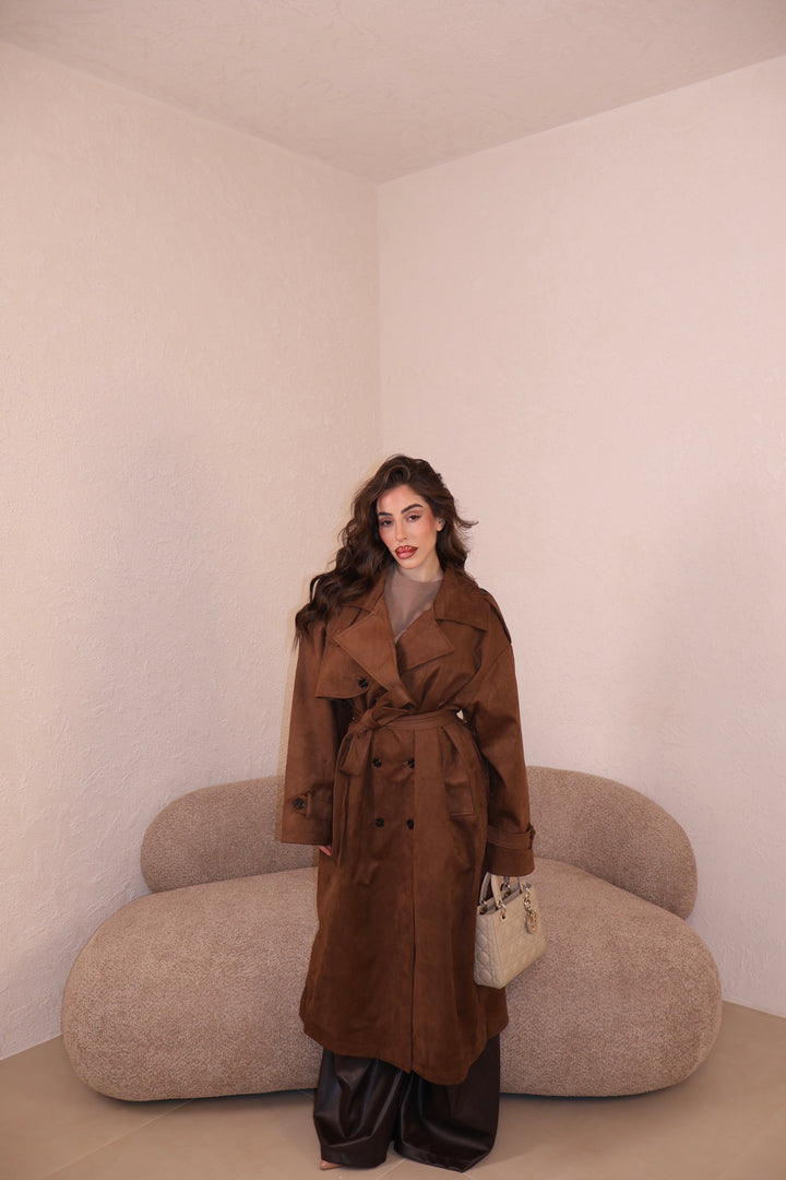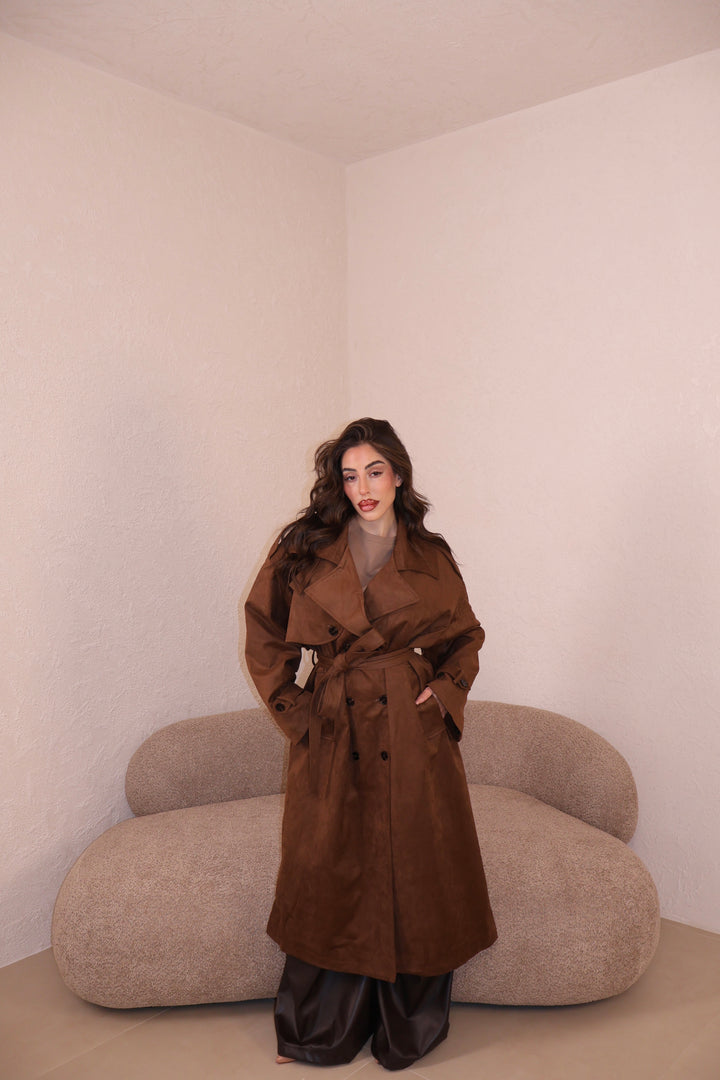 Trench lungo in ecocamoscio doppio petto con cintura in vita. Taglia unica.